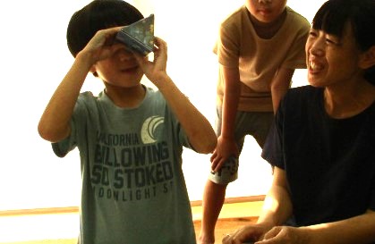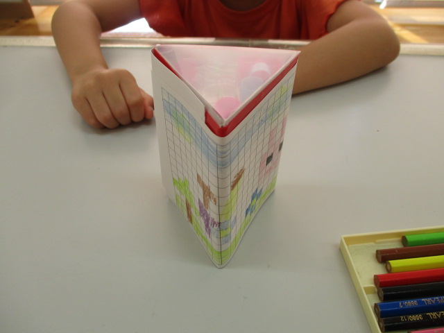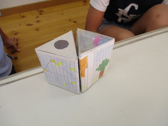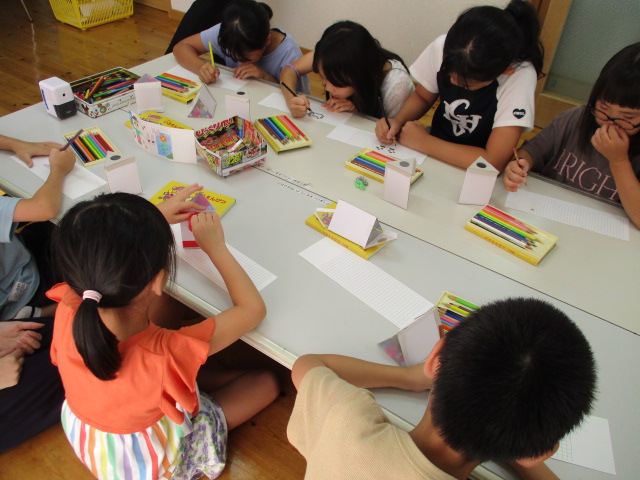 厚紙やアルミホイル、クリアファイルなどを使って万華鏡作りをしました。筒部分にもこだわり、色鉛筆を使って星空や動物を描き、オリジナルの万華鏡が出来上がりました♪