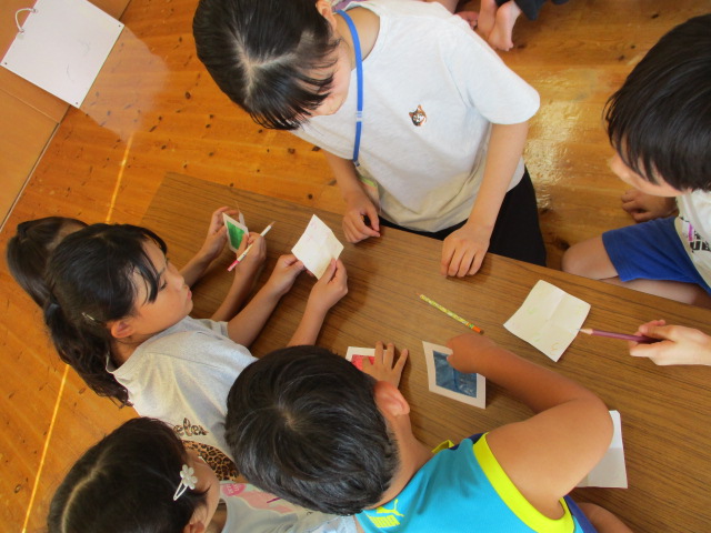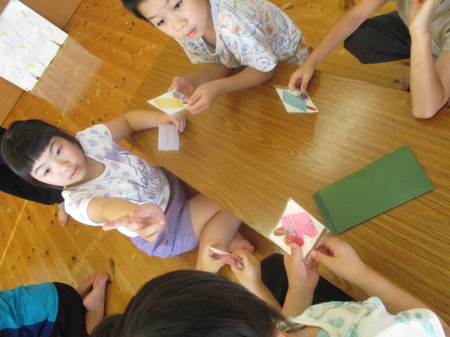 夏休み最後の児童館活動は宝探し。島根県立大学の実習生さんがアイデアを出し合い、宝探しを考えてくれました。中には難しい問題もありましたが、子どもたちは力を合わせて次々と問題を解いていました。たどり着いた宝箱には素敵な手作りキーホルダーが!大喜びの子どもたちでした。