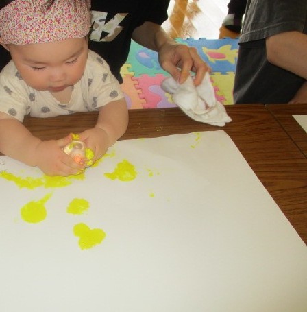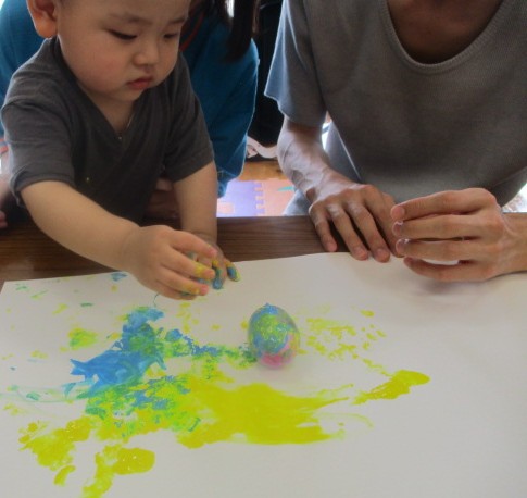 久しぶりのいちごたいむは「バルーンペインティング」しました。水風船を絵の具につけて遊びました。画用紙にポンポンと模様をつけてみたり、水風船をコロコロと転がしてみたりして楽しんでましたよ♪