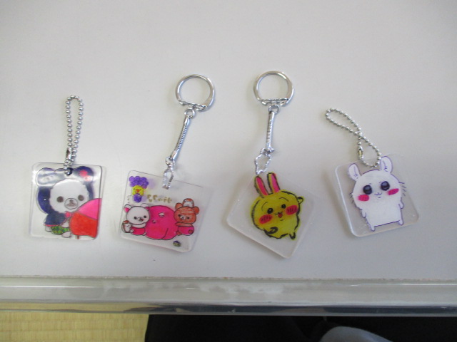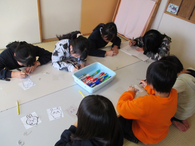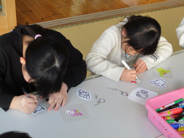 プラ板でキーホルダー作りをしました。写し絵をしたり自分でオリジナルのものを考えたりしながらマジックで絵を描き、丁寧に色を塗る子どもたちでした。素敵な作品が出来上がり、嬉しそうに眺めていました♪