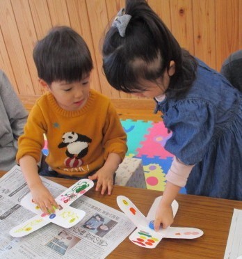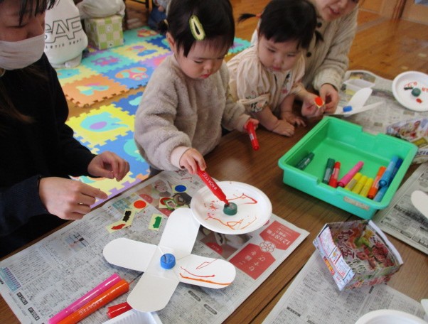 牛乳パックや紙皿、ペットボトルのキャップを使ってこま作りをしました。マーカーで模様を描いたり、シールを貼ったりしてオリジナルのこまが完成しました!こまを回せるようになると「みてみて!」と嬉しそうに教えて見せてくれましたよ♪