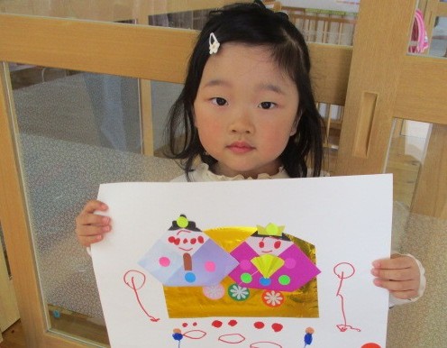 水性マーカーやシールを使って、おひなさま作りをしました。折り紙で作った人形に顔や着物を描いたり、シールを貼ったりして、可愛いおひなさまが出来ました♪