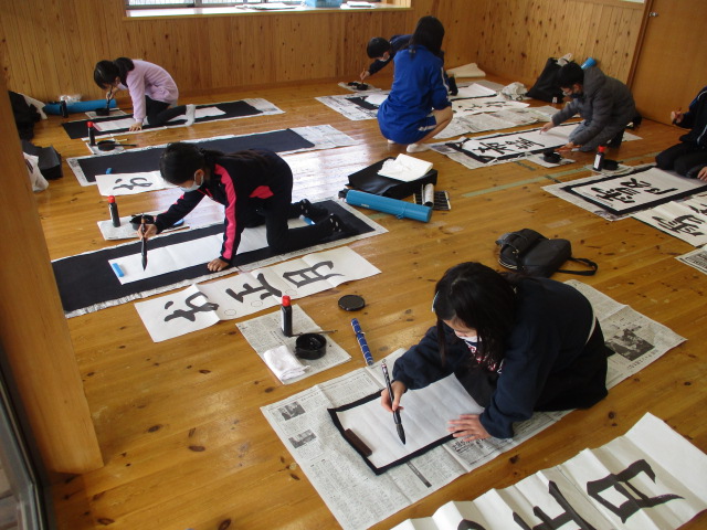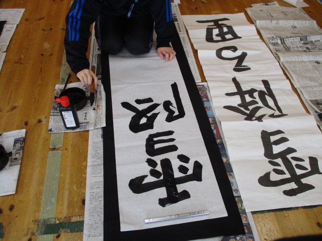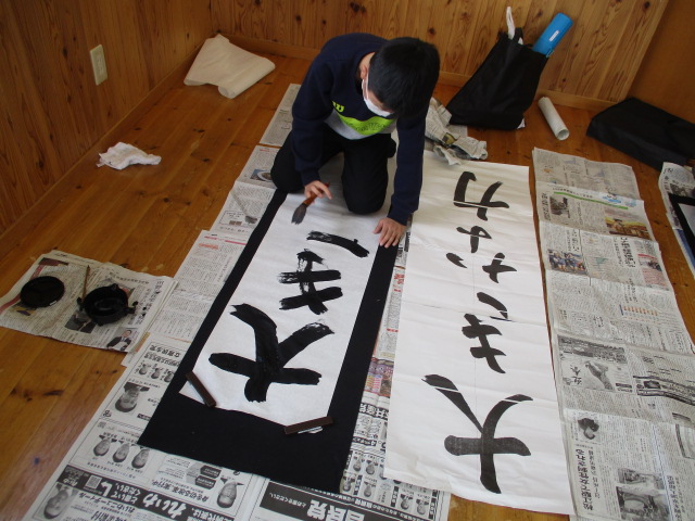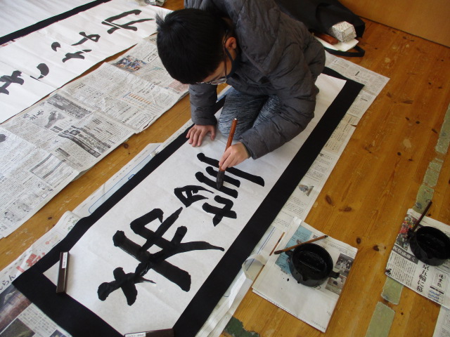 今日から児童館も開館し、新年初日の今日は「書初め会」を行いました。昨年に引き続き、書道部の中学生にお手伝いをお願いしました。丁寧な指導のもと参加した児童はみな真剣に取り組み、よい作品が出来上がりましたよ。