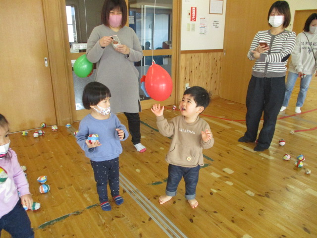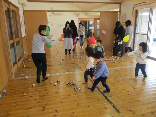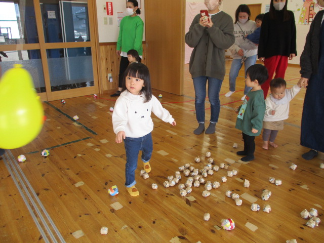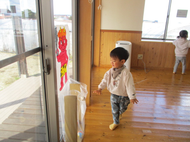 節分の日にちなんで、鬼のパンツの手遊びをしたり、豆まきの歌を歌ったり、新聞紙の豆まきを楽しんだりしました。