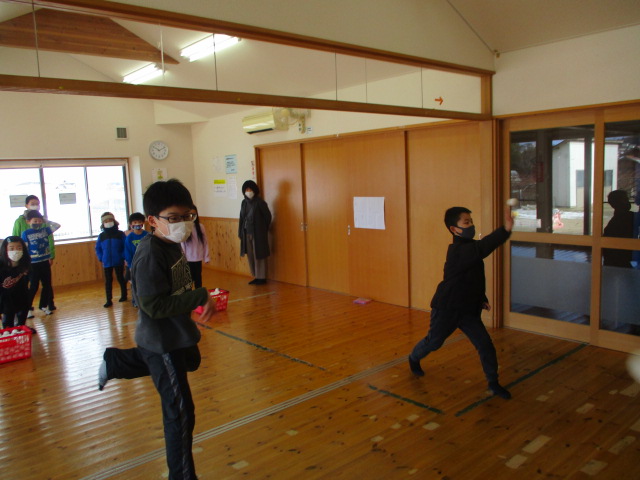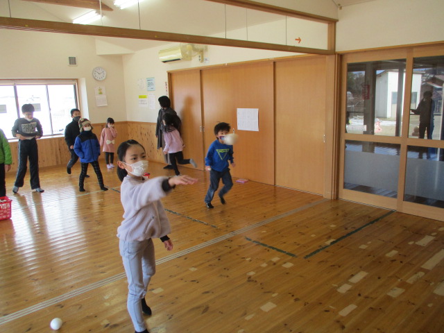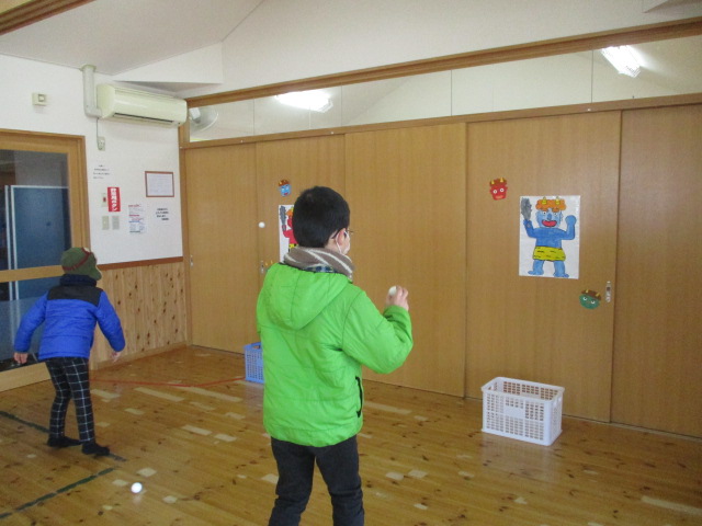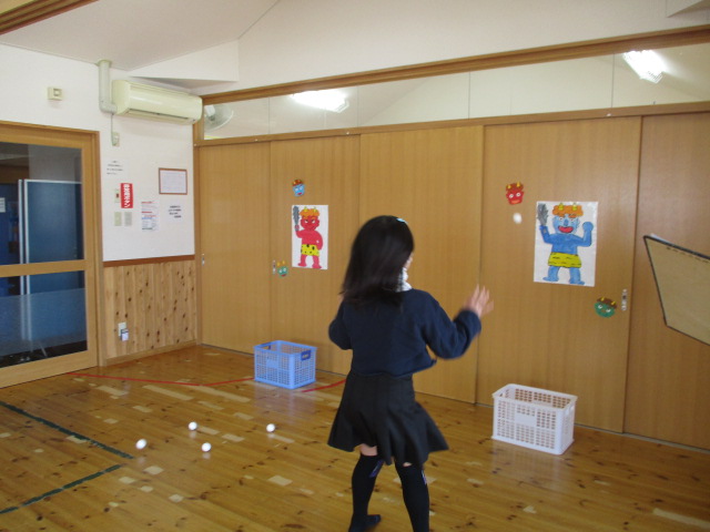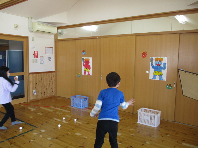 新聞紙の豆を鬼に当ててカゴに入れ数を競いました。