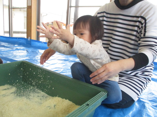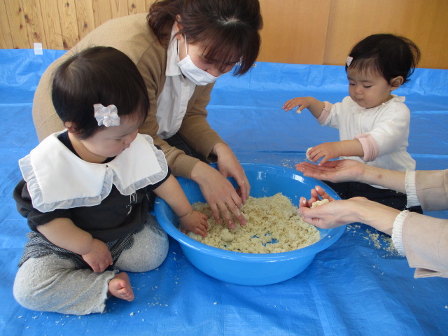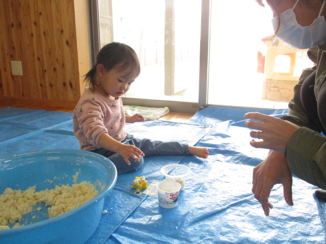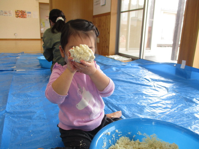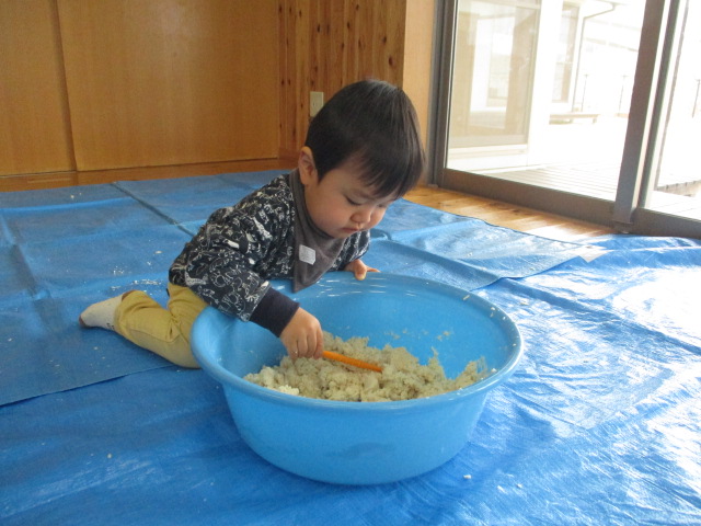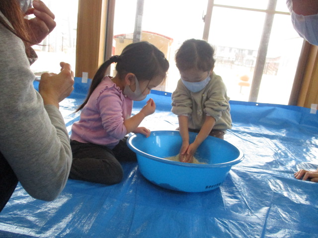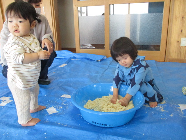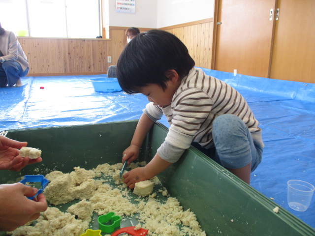 まずは、そのままのパン粉でサラサラの感触を楽しみ、水を足したらどうなるかなぁ?!こねたら粘土みたいになって、型抜きやプリンカップを出して楽しみました(*^^)v