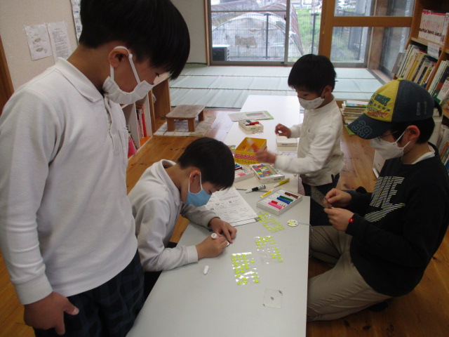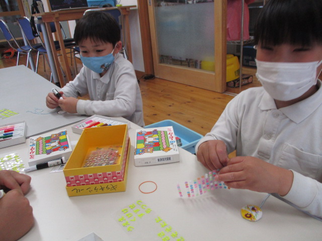 今日は「ブンブンゴマ作り」をしました。ペンで描いたり、シールで貼ったりしてオリジナルのコマができましたよ!