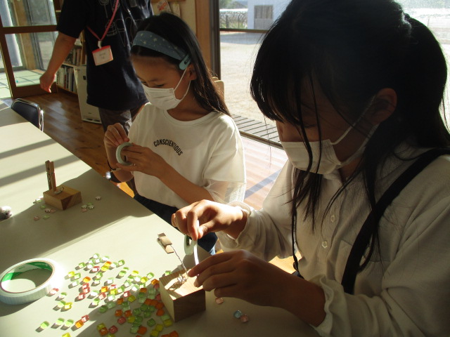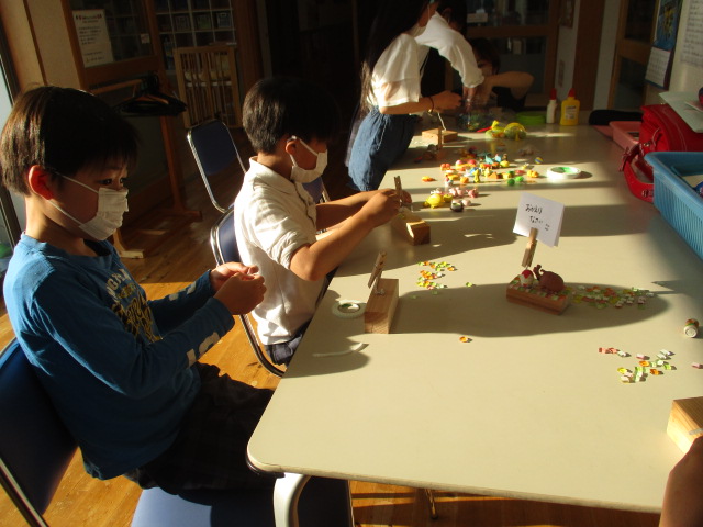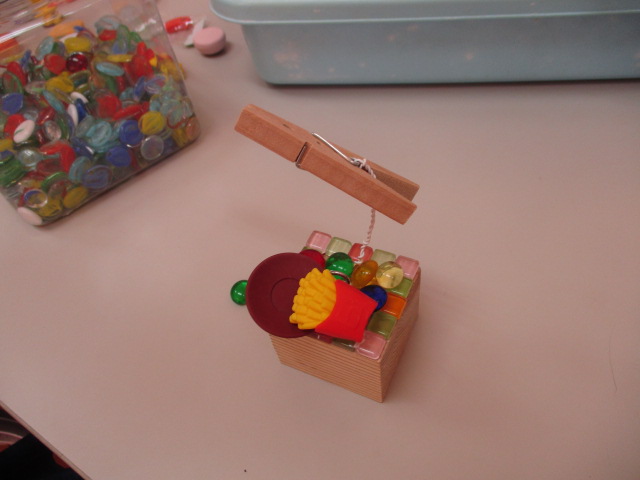 児童館活動でメモスタンド作りをしました。木材に好きなタイルや飾りをつけてオリジナルのメモスタンドができました。使ってくれると嬉しいです!