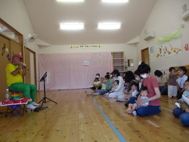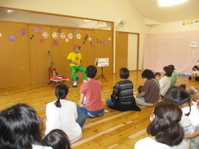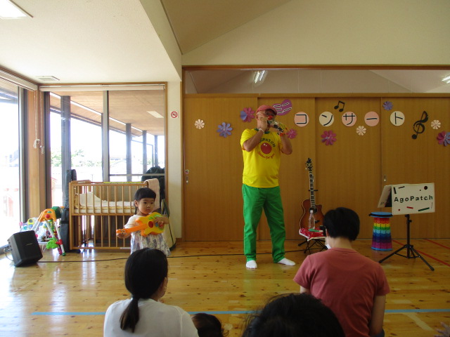 アゴパッチさんのミニコンサートをしました。ハーモニカの音色に癒されながら、色々な曲に聴き入っていました。中には、おもちゃのギターを持ってきてアゴパッチさんの隣で演奏するお子さんもおられましたよ。