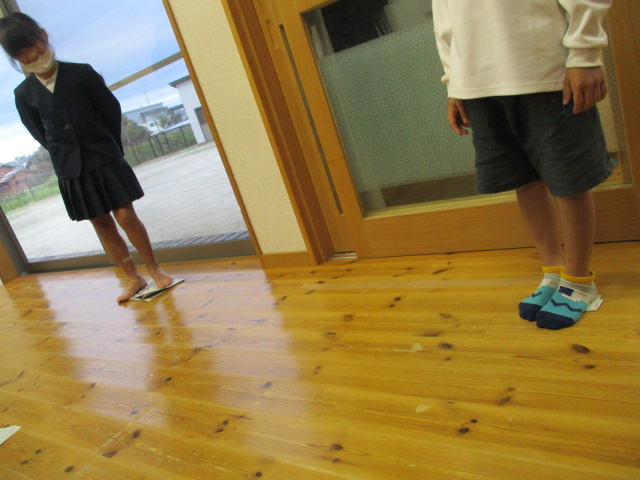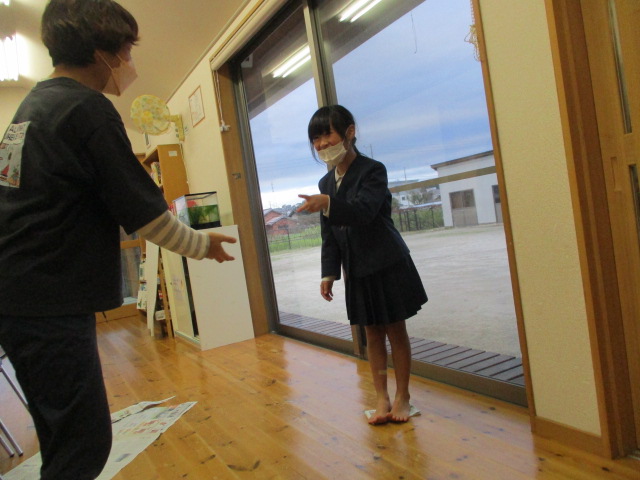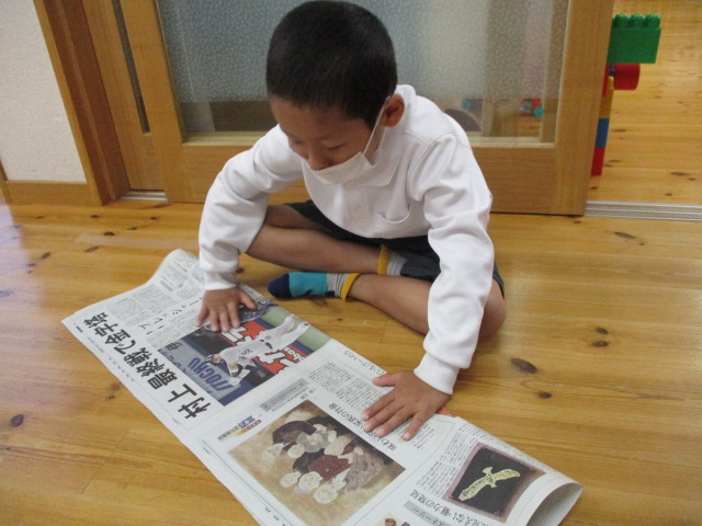 新聞ジャンケンをして遊びました。ジャンケンに負けたら新聞を半分に畳むのですが、どうしたらバランスよく新聞の上に立てるのか考えながら畳んでいました。職員も参加しましたが、結局、子どもたちの勝ちでした。