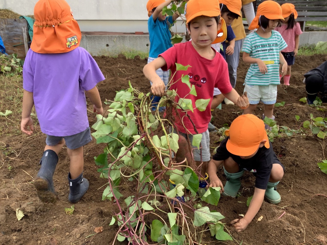 4歳児さん5歳児さんは去年の経験もあり、力強くつるを引っ張ったり土を掘ったりして大きなお芋を掘り出していました。