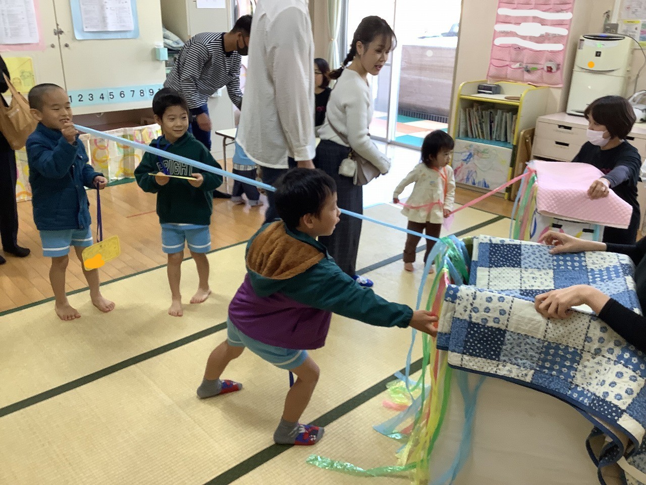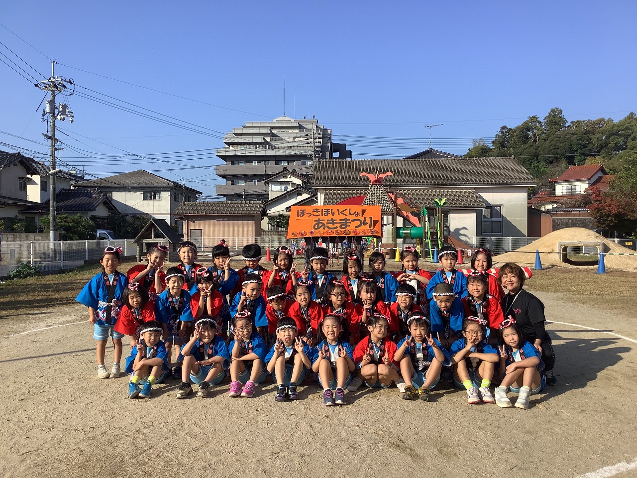 今日はお天気に恵まれ青空の下、きく組によるお神輿の練り歩きのオープニングでスタートしました。「ワッショイ・ワッショイ」ときく組パワー全開!!元気なかけ声が保育所中に響き渡りました。みんなで力を合わせてお神輿を練り歩くきく組の姿に感動しましたよ。