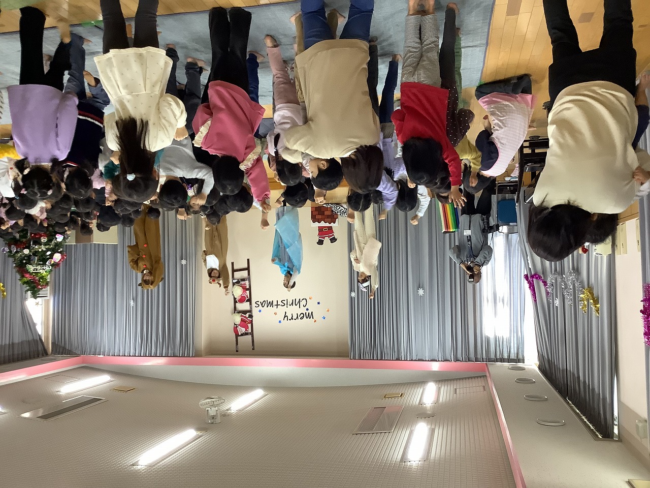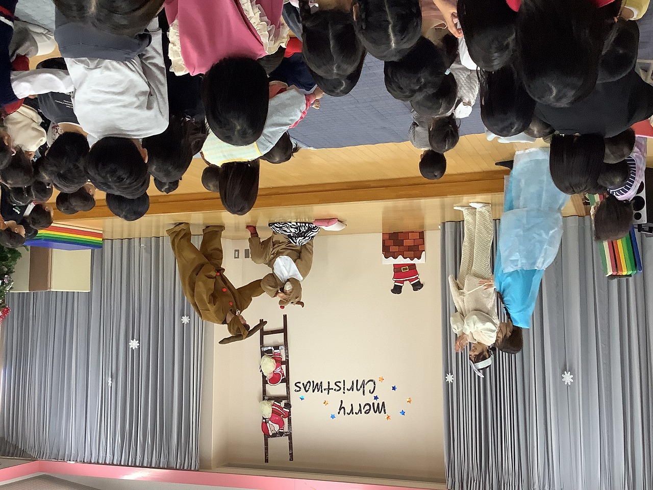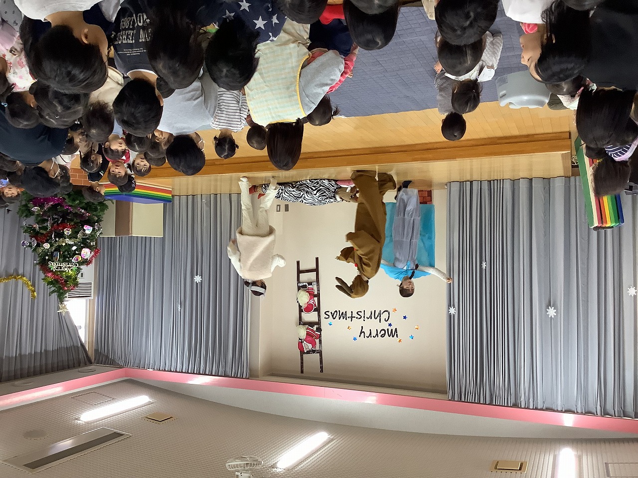 クリスマス会が始まるとサンタさんからの手紙を読んでもらったり元気に歌を歌ったりしました。その後のお楽しみは職員による劇でした。ねぼすけトナカイを起こすために大人気の助っ人たちが登場して大盛り上がりでしたよ。無事トナカイが起きるとみんなで踊りを踊りました。