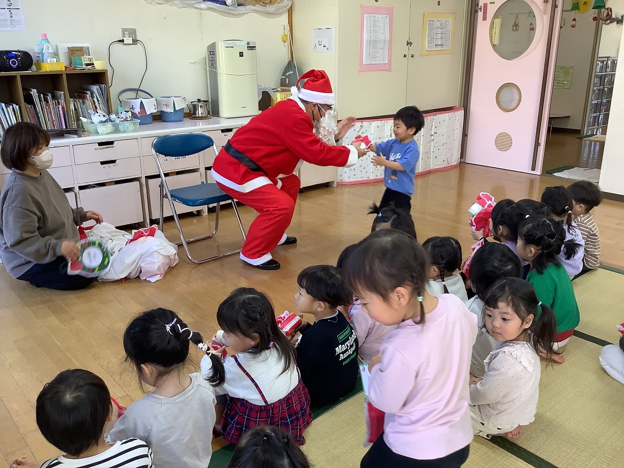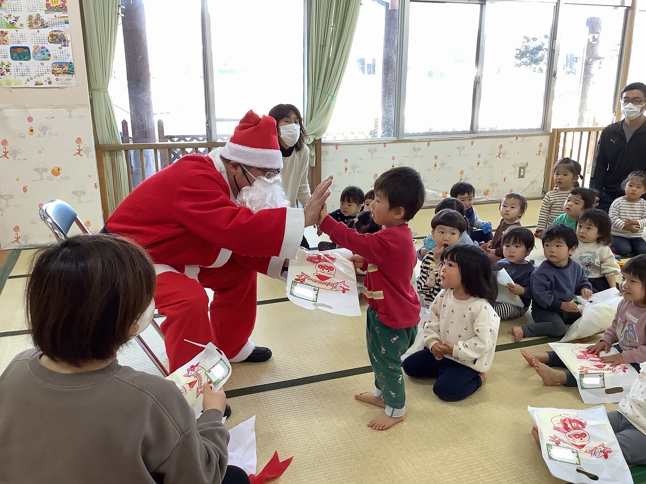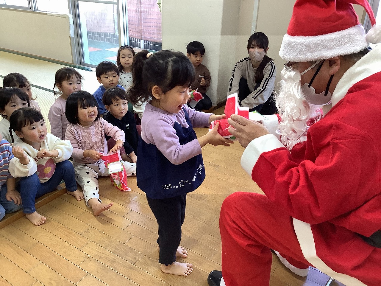 劇が終わると“りんりんりん・・・”と鈴の音が聞こえ、サンタさんが登場しました!「わぁ!サンタさんだ!」と大喜びの子どもたちでしたよ。そしてサンタさんへの質問コーナーへ。「どうしてそんなに大きいの?」「散歩しますか?」など可愛らしい質問が飛び出しました。サンタさんからの答えに興味津々な子どもたちでしたよ。次はいよいよサンタさんからプレゼントをもらいました。名前を呼ばれると大きな声で返事をして「ありがとう」としっかりお礼も伝えることができました。