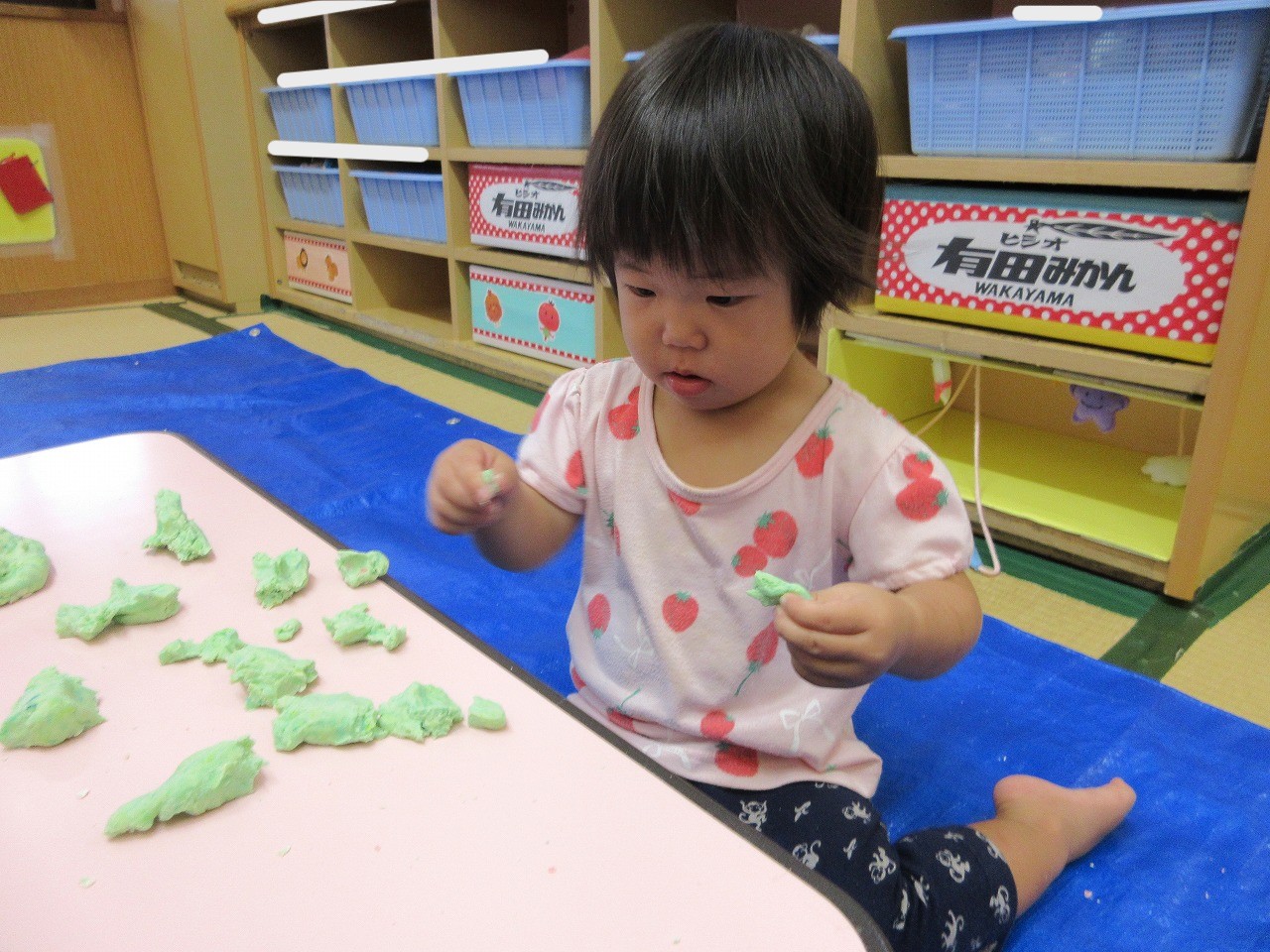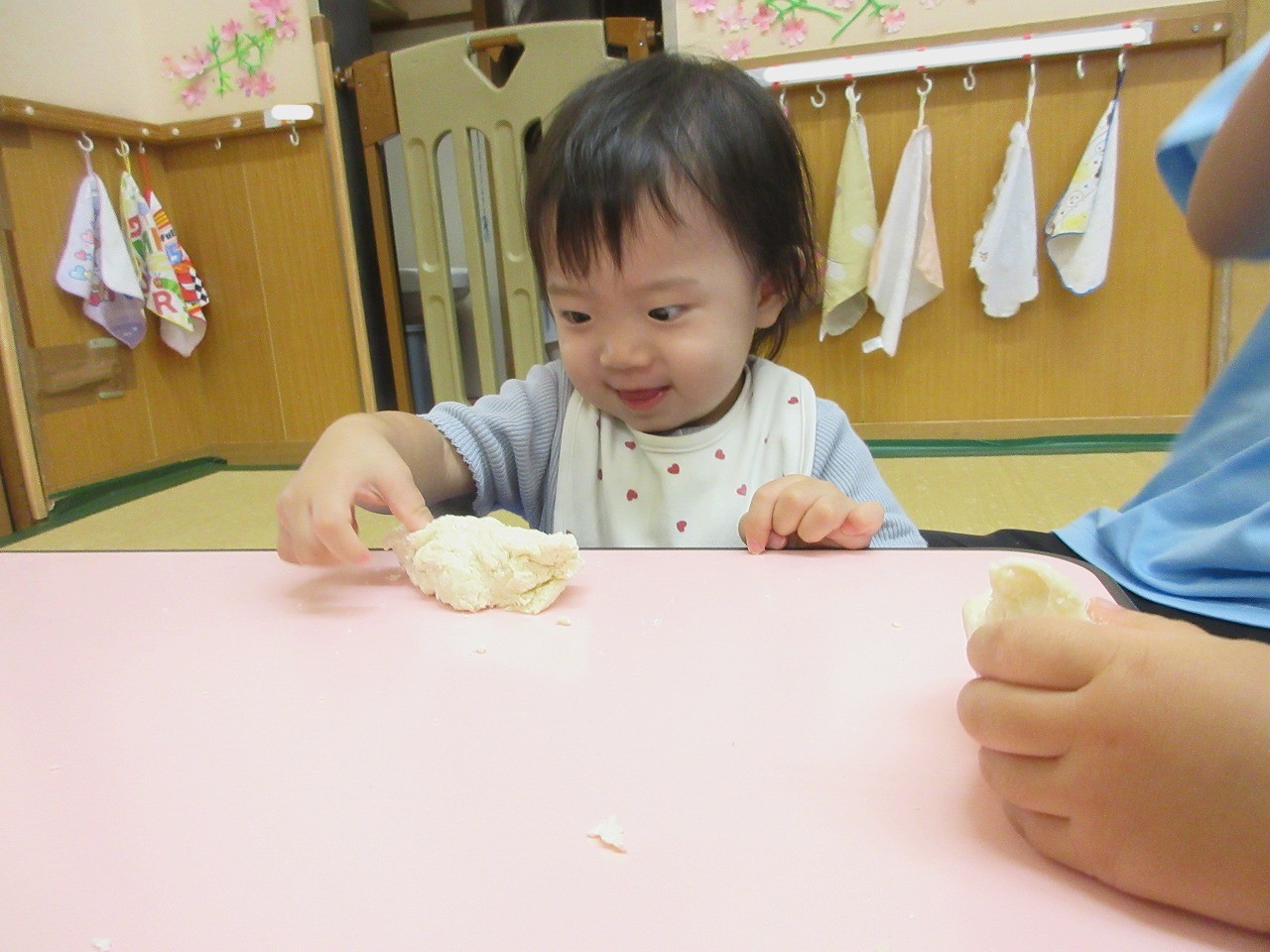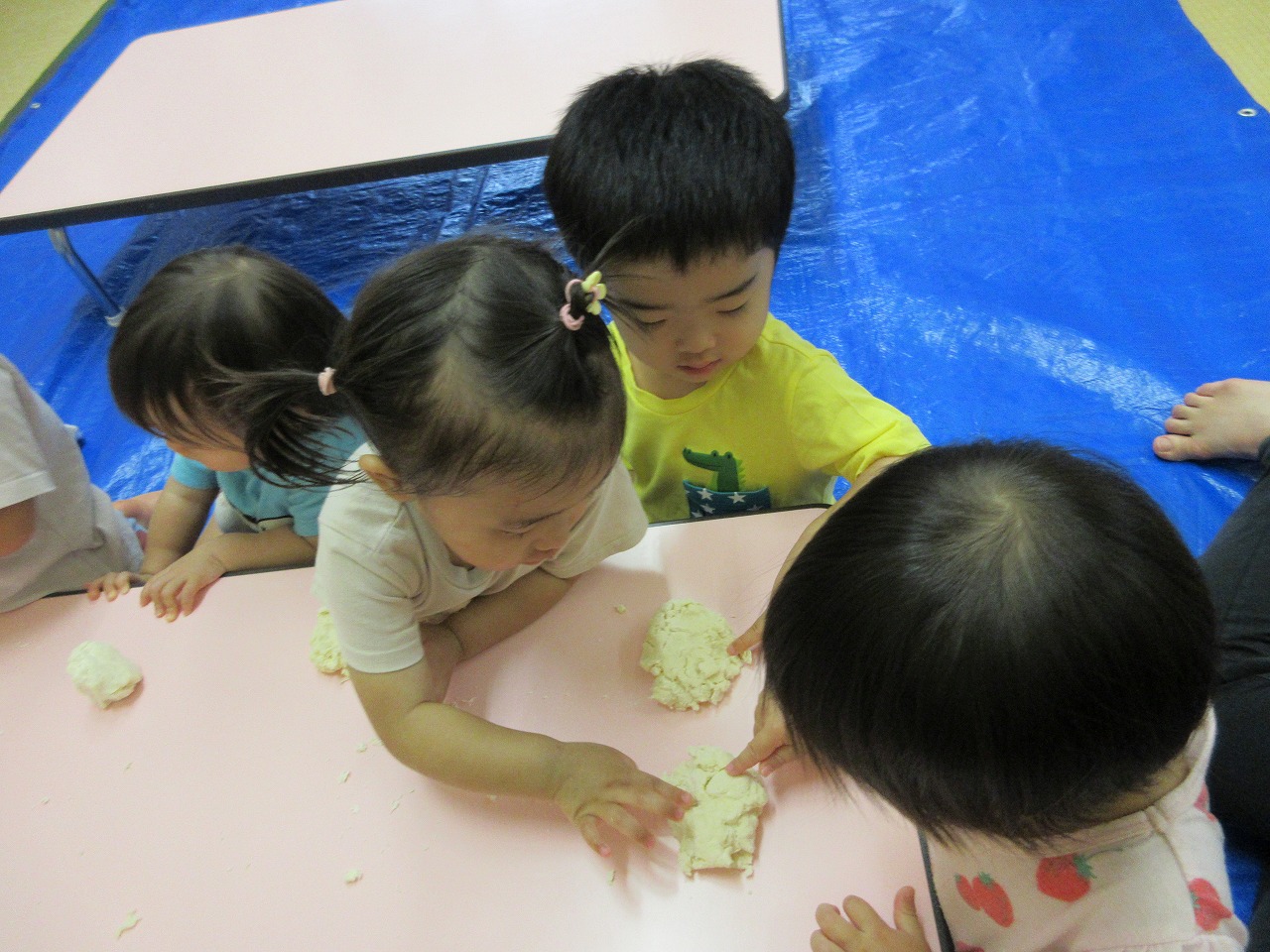 今日のふれあい交流は小麦粉粘土で遊びました。最初は1本の指でちょんちょんちょん・・・徐々に小麦粉粘土の感触に慣れてきて、最後には手のひらでギューッとしたり、こねこねしたりして楽しみましたよ😊