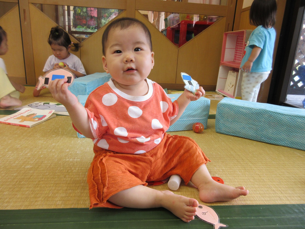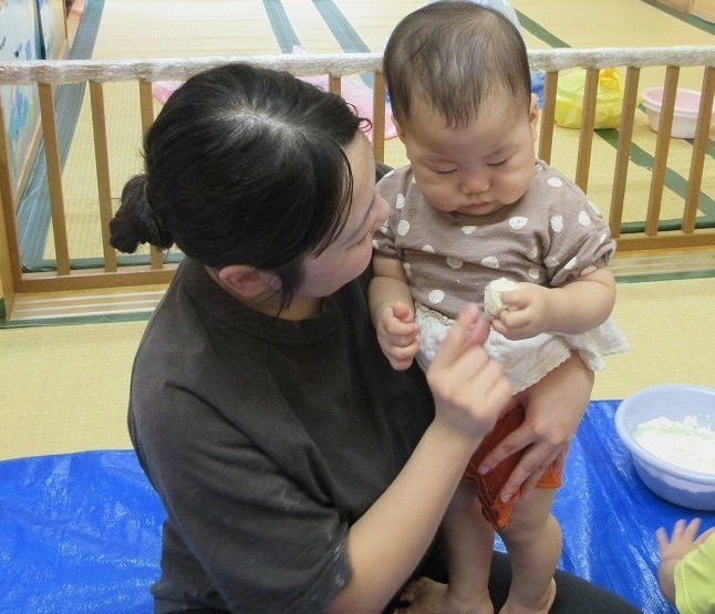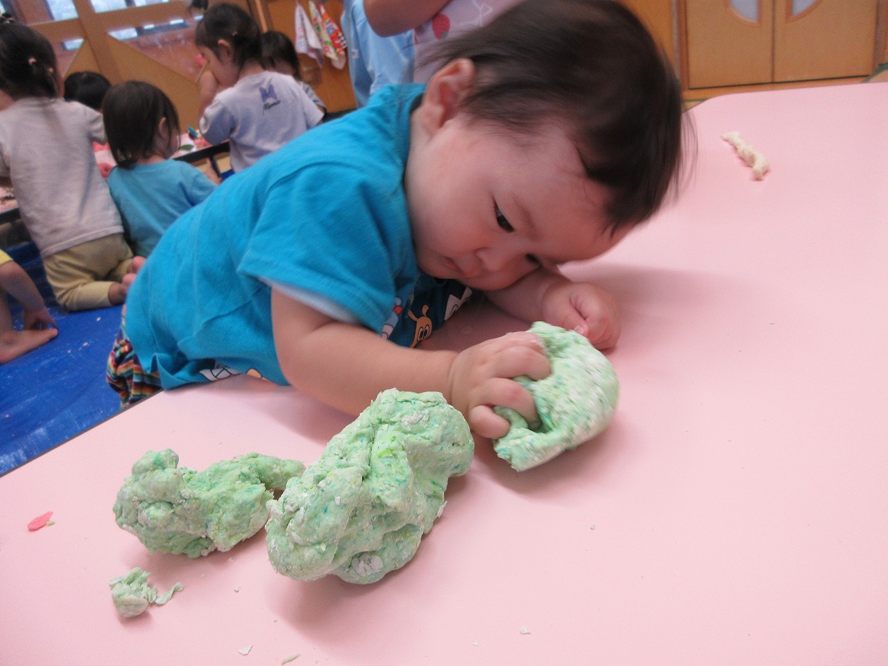今日のふれあい交流は小麦粉粘土で遊びました。最初は1本の指でちょんちょんちょん・・・徐々に小麦粉粘土の感触に慣れてきて、最後には手のひらでギューッとしたり、こねこねしたりして楽しみましたよ😊