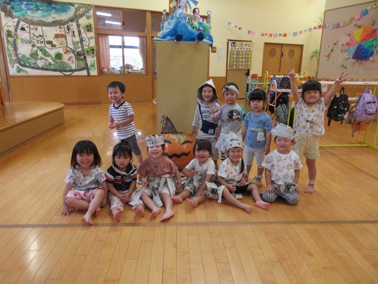 今日は散歩を予定していましたがあいにくの雨模様で、子ども達も窓から外を見ながら「さんぽいけないねぇ」「またいくか」と呟いていました。お部屋で新聞紙で遊びました。ちぎったり丸めたり投げたり知して楽しんだあとは、「私はプリンセス~」「消防車になるに」と自分の体に新聞紙を巻きつけ衣装のようにしてなりきる子ども達。変身した自分を鏡で見てうっとりした後は保育所内を散歩して作った衣装を見てもらいました。お兄さんお姉さんから「すてき」「かわいい」「かっこいい」と褒めてもらって嬉しそうでした。写真撮影の後は遊戯室で沢山走りました!