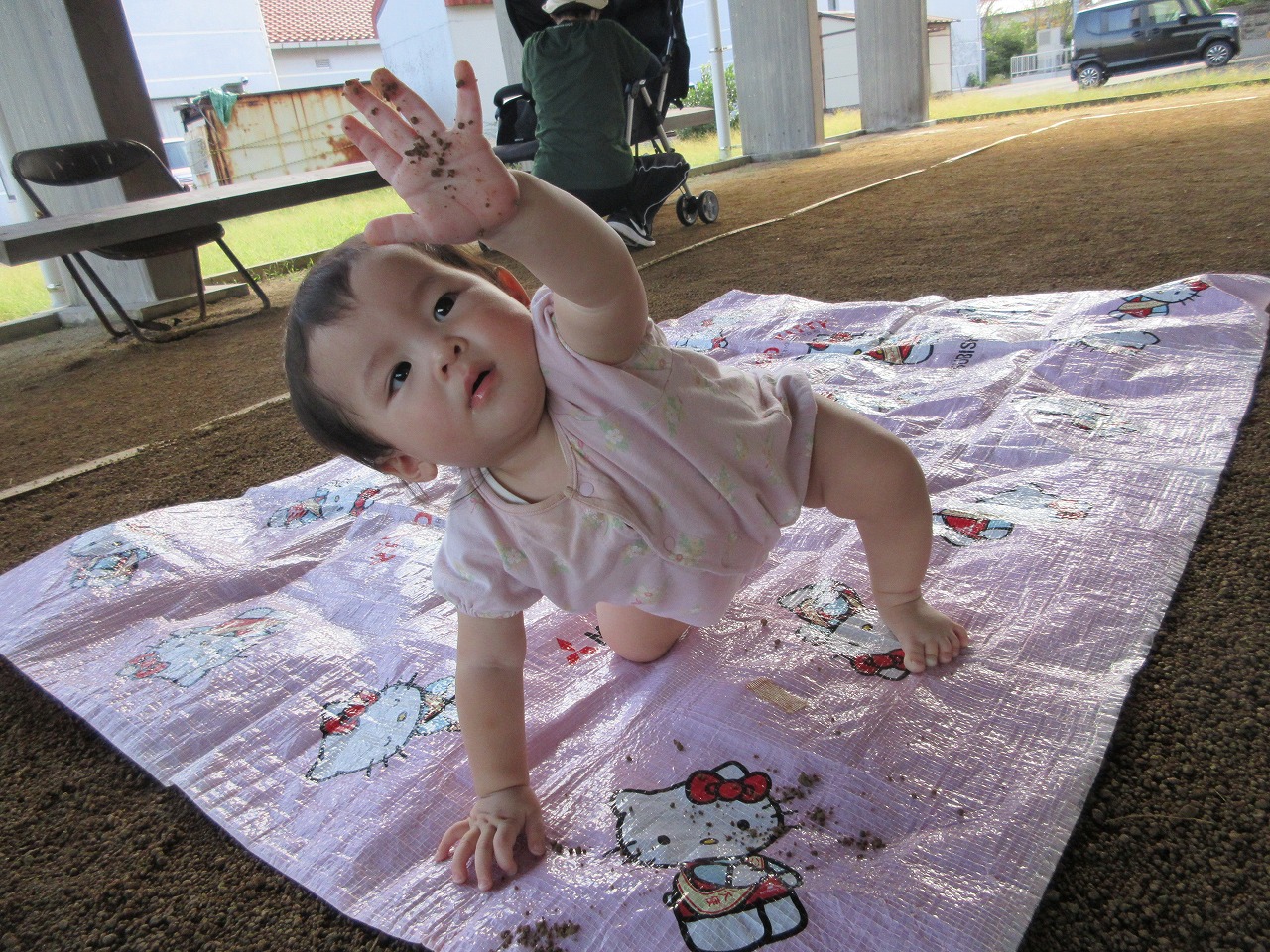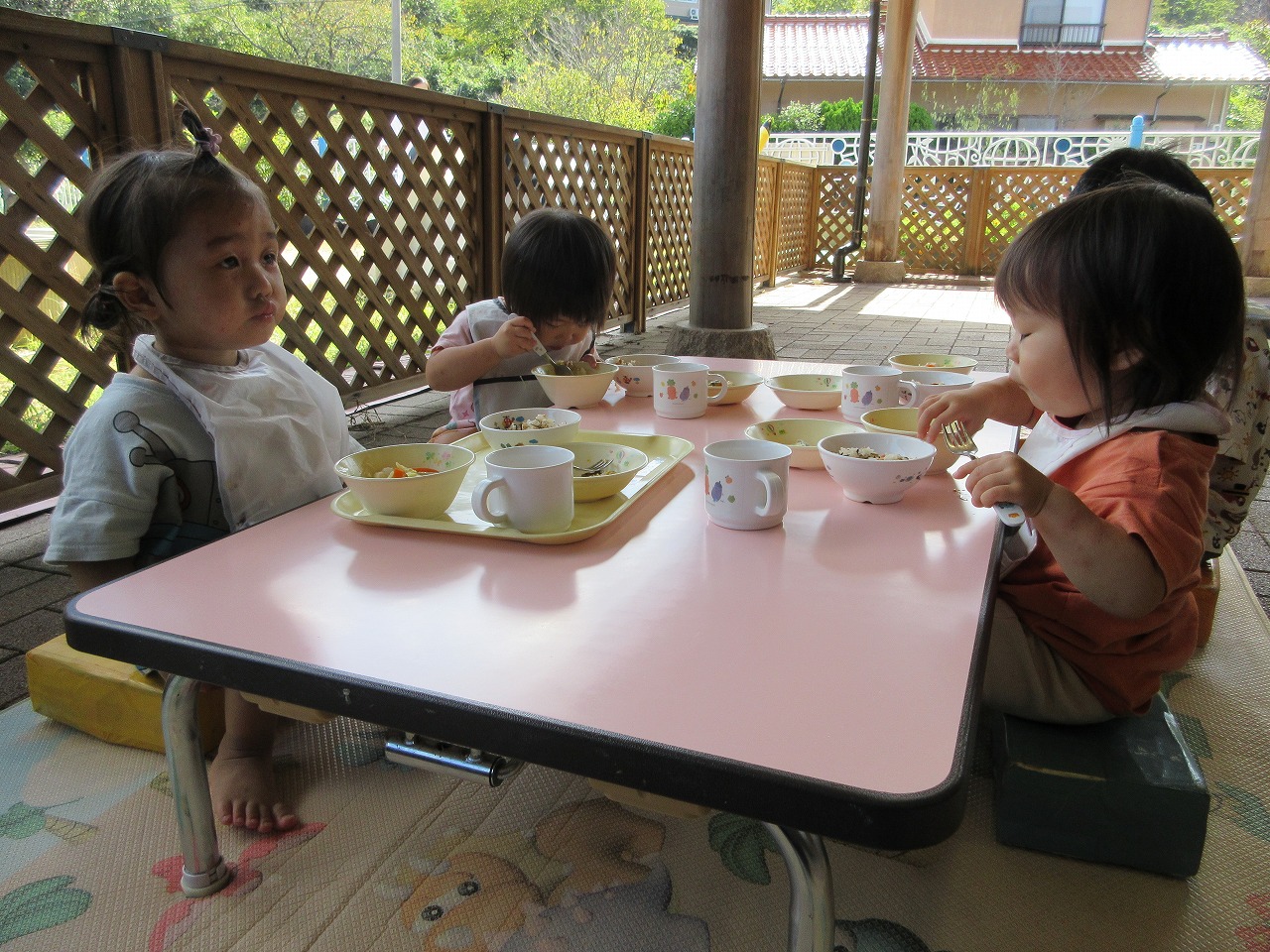 保育所に帰ってからはお楽しみの給食!かに組の子ども達は秋の風を感じながらテラスで食べましたよ😊