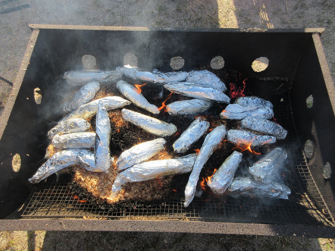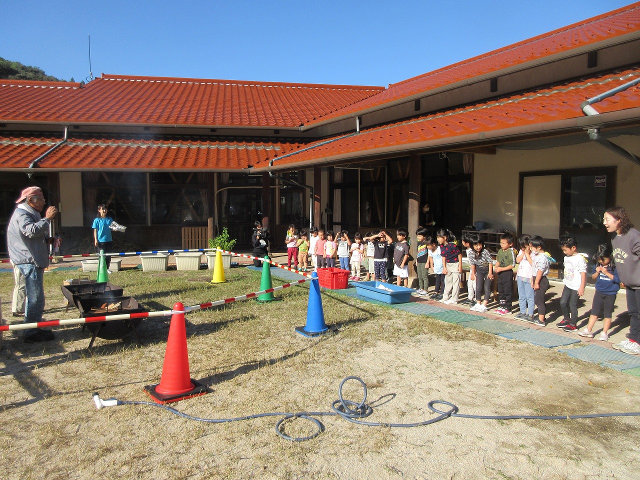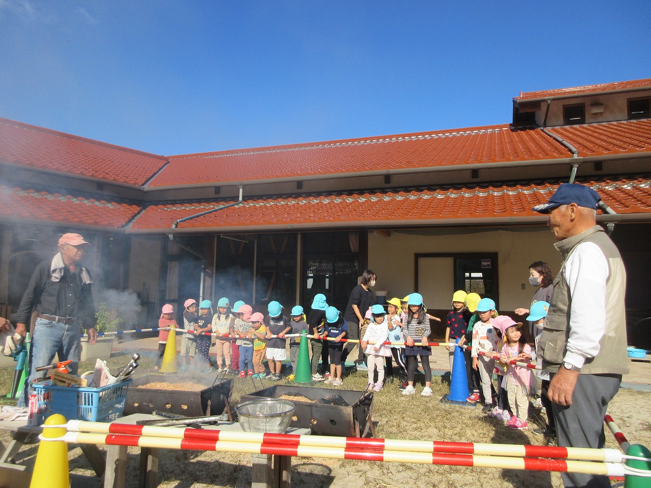 地域講師の方が朝早くから火起こしをお手伝いして下さり、炭の匂いが立ち込めると子ども達はワクワクしながら見守っていました。