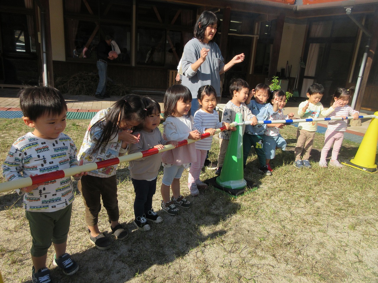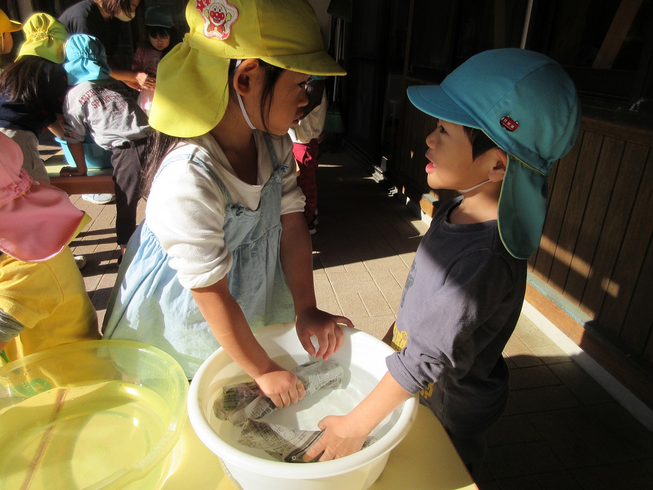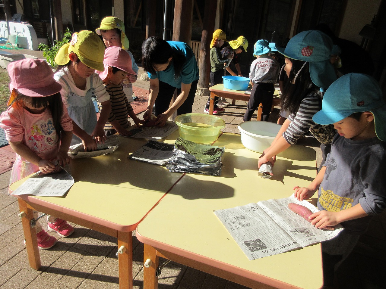 今日は秋晴れとなり、絶好の焼き芋会日和でした。前日に焼き芋の準備で3・4・5歳児がさつま芋の泥を洗ってきれいに落とし、今日は芋を新聞紙やアルミホイルで丁寧に包みました。芋が上手に隠れるように包むことができましたよ。