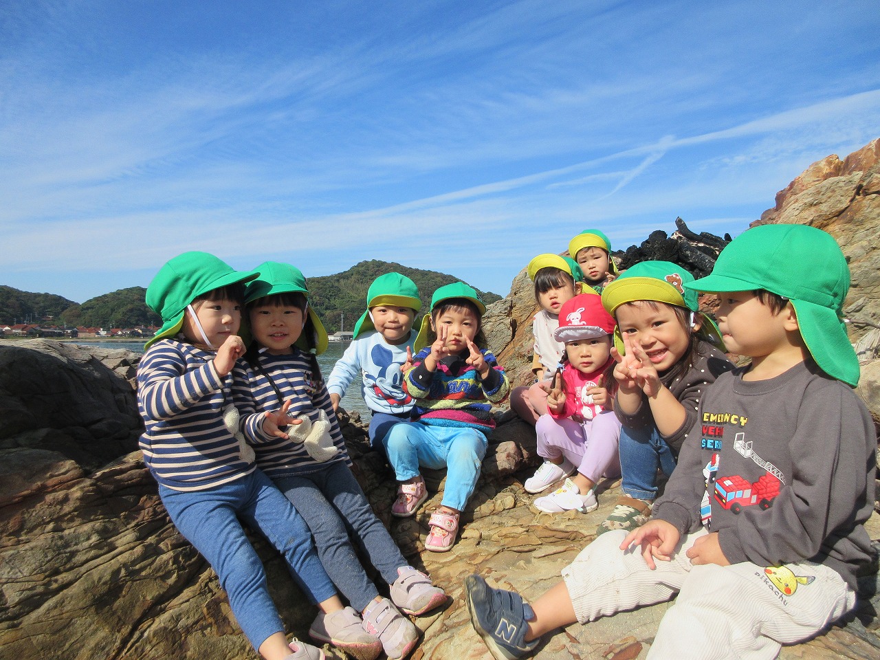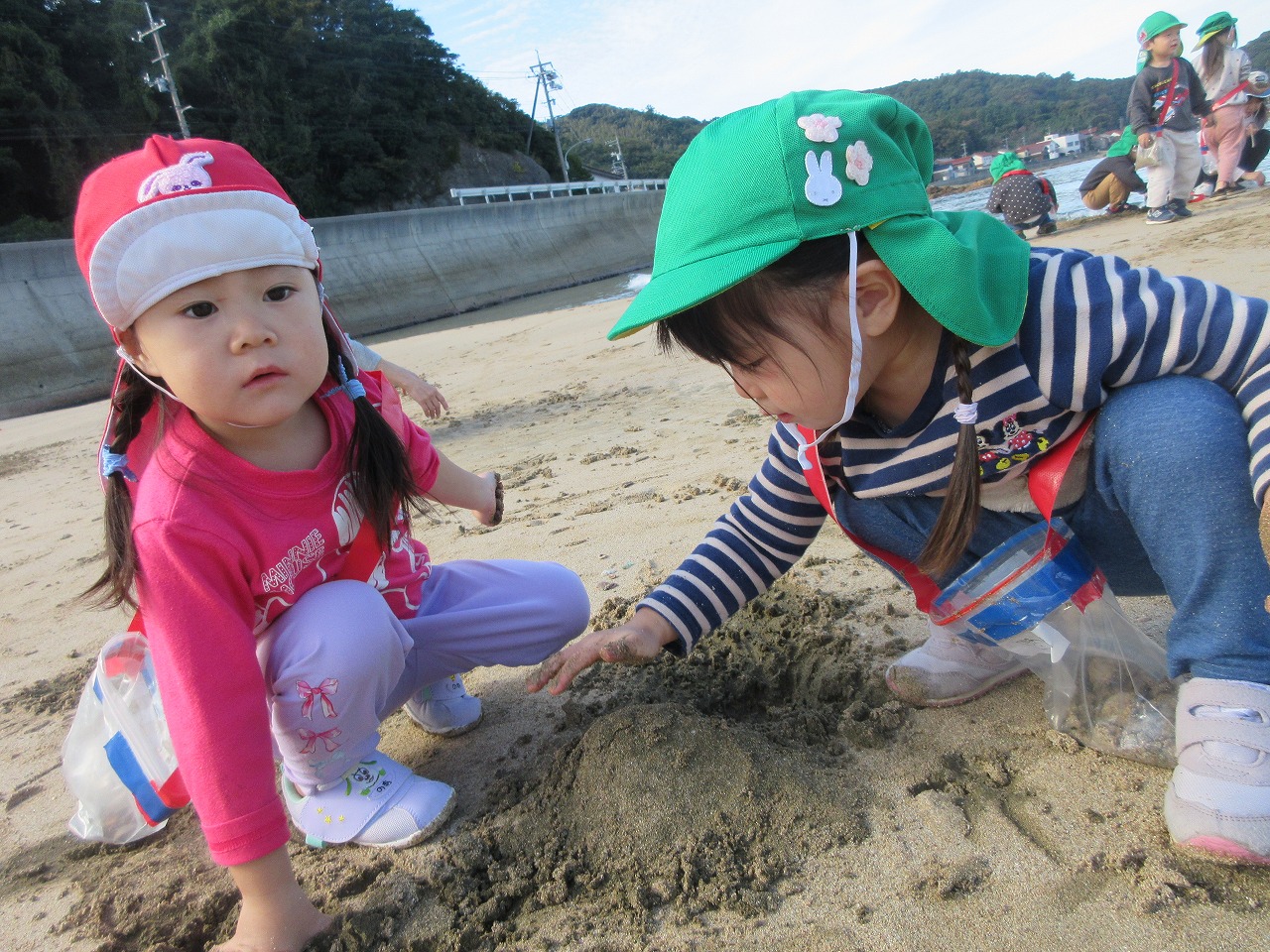 ぽかぽか気持ちのいい秋晴れの中お散歩に出かけました。道中カエルや猫、トンビを見つけ嬉しそうに「みてみて~!」と教えてくれる子ども達。海に着くと砂遊びをしたりシーグラスや貝殻拾いをしたり走り回ったりのびのびと楽しみました。