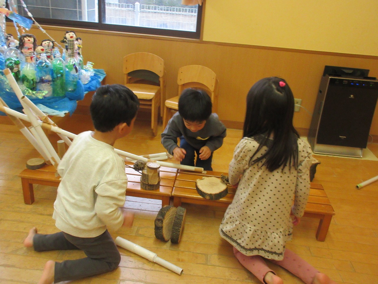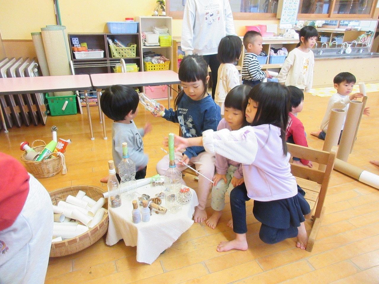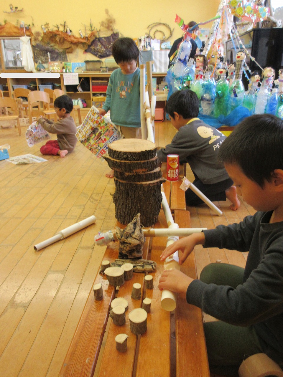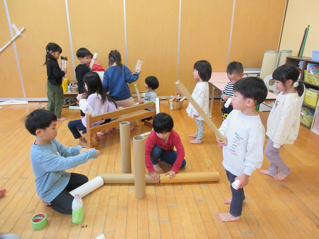 今日はお散歩遠足の予定でしたがあいにくの天気になったので予定を変更して、幼児クラスのみんなで自然物や身近な素材に触れて遊びました。