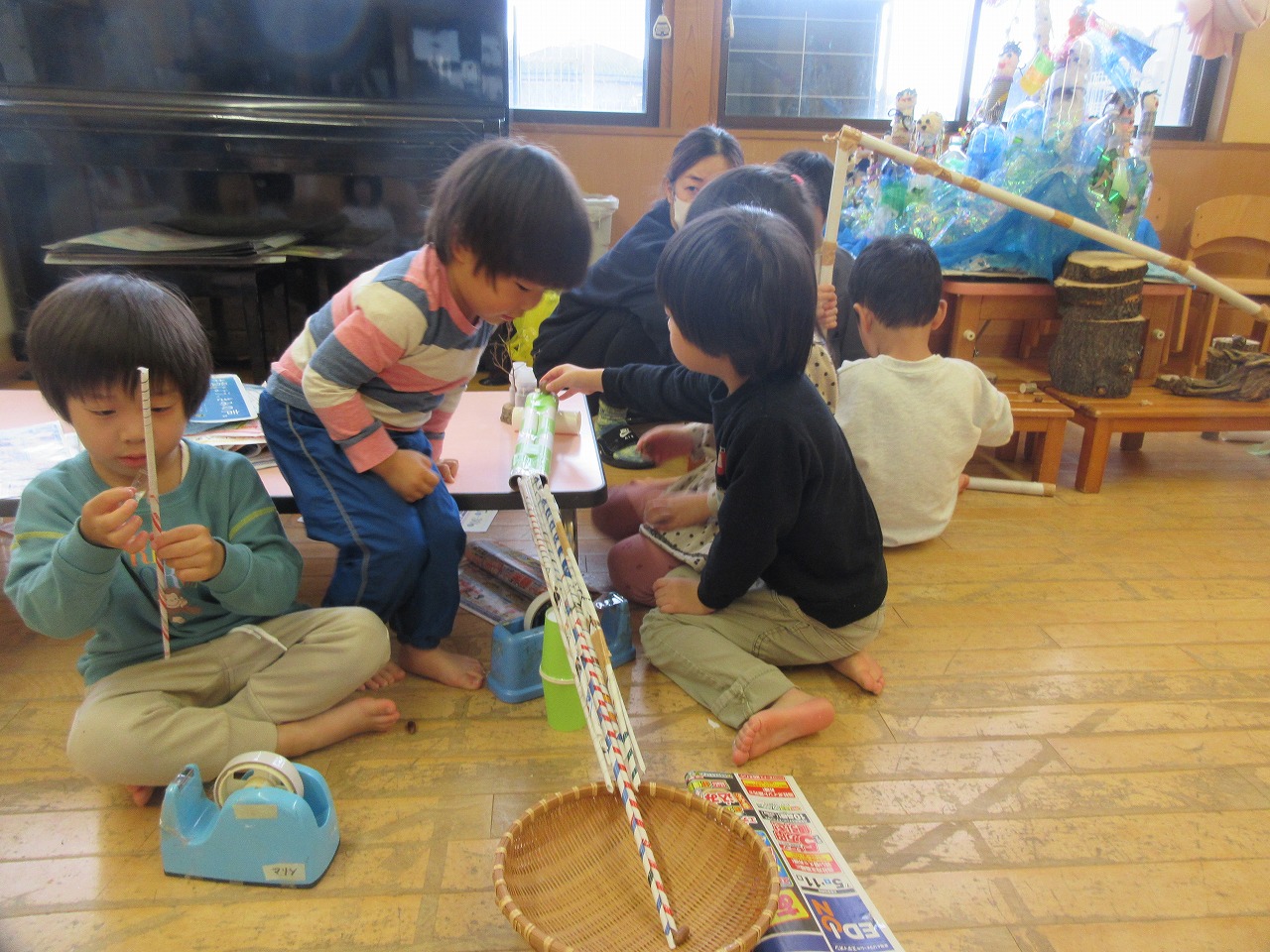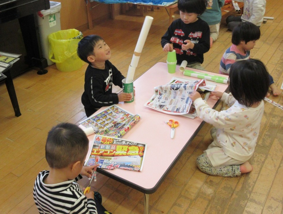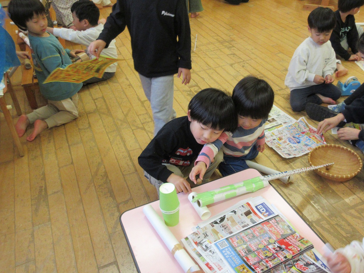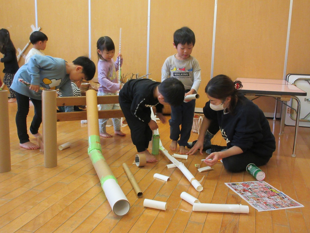 今日はお散歩遠足の予定でしたがあいにくの天気になったので予定を変更して、幼児クラスのみんなで自然物や身近な素材に触れて遊びました。