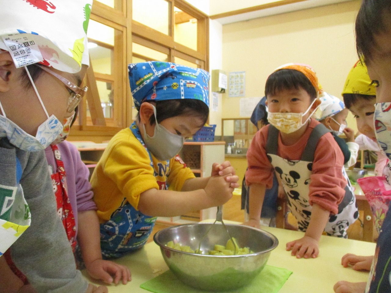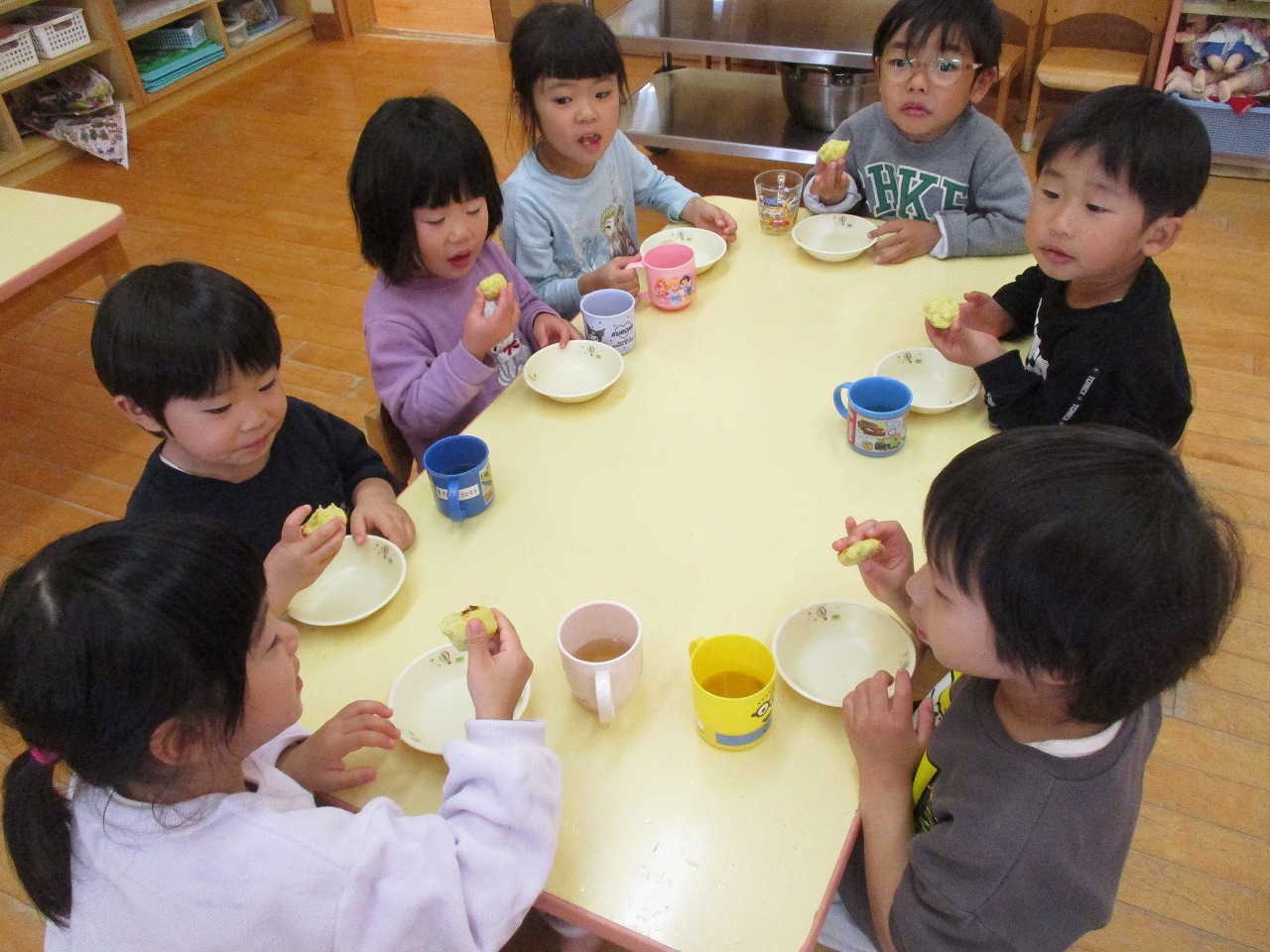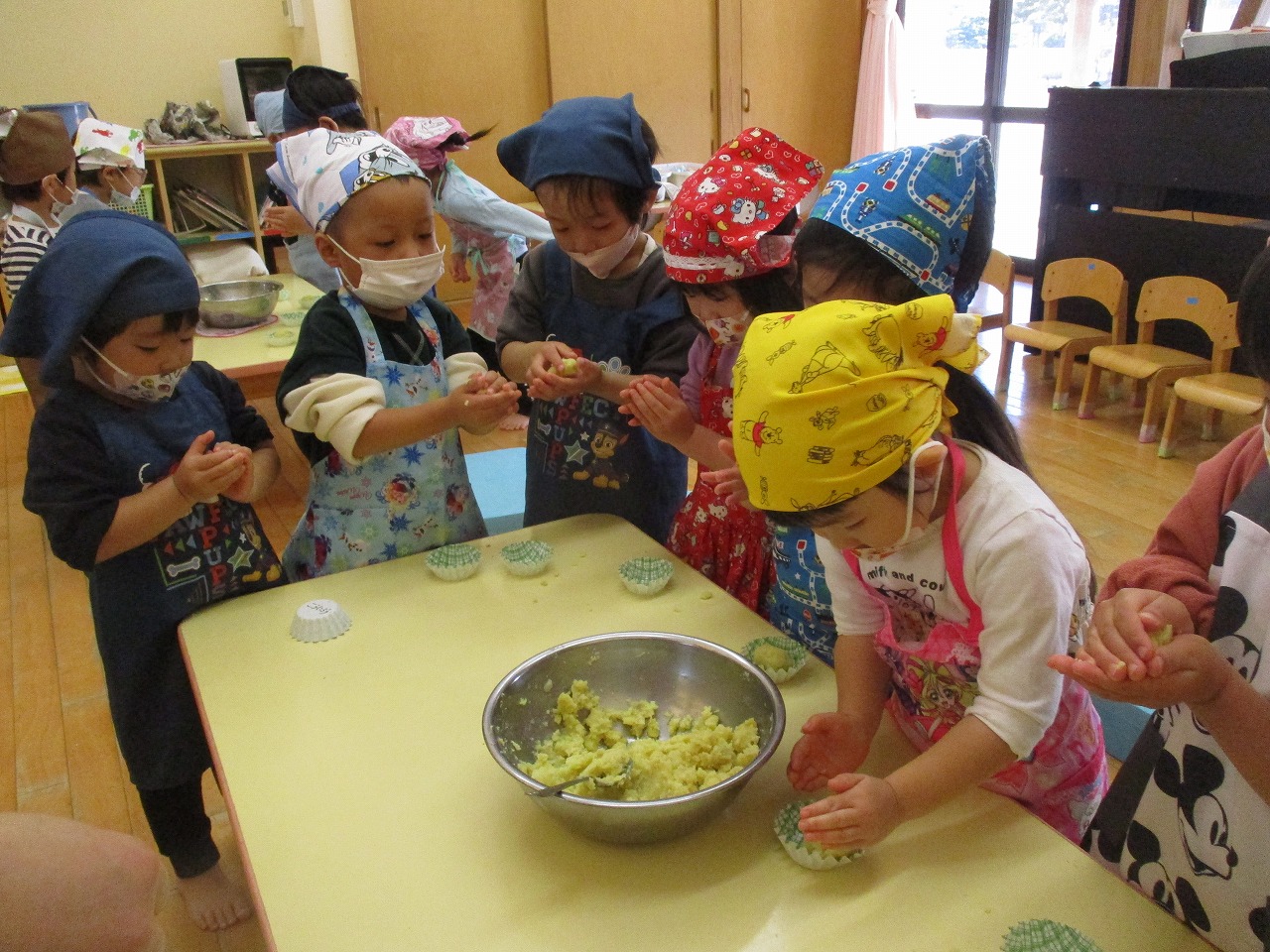 生のさつま芋は「りんごみたい」茹でると「パイナップルの色だ」と色が変化することに気付いていました。みんなで作ったスイートポテトは「いいにおい」「甘くておいしい」と大好評でした♡