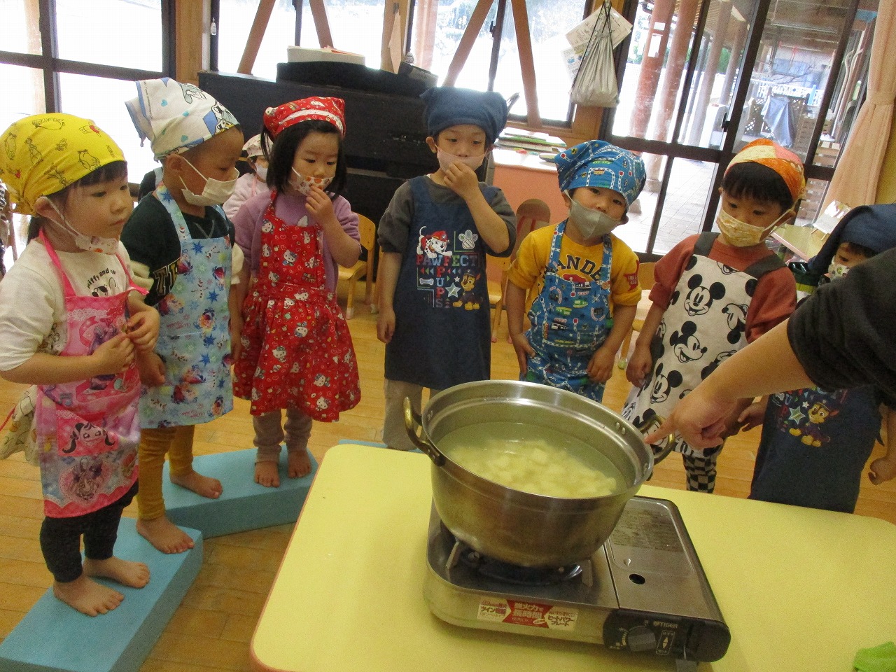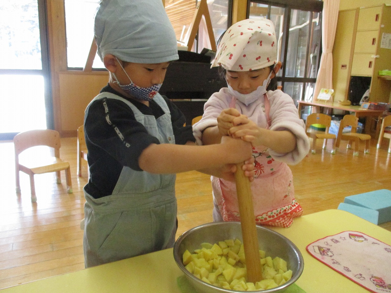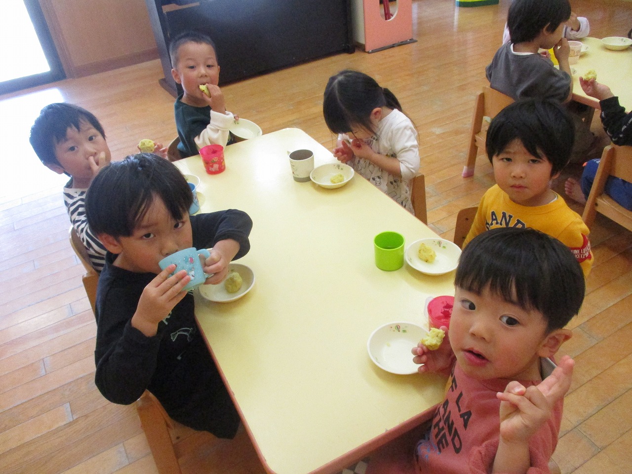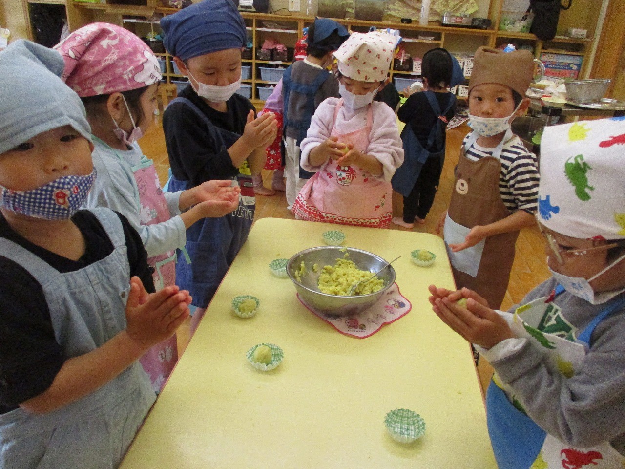 生のさつま芋は「りんごみたい」茹でると「パイナップルの色だ」と色が変化することに気付いていました。みんなで作ったスイートポテトは「いいにおい」「甘くておいしい」と大好評でした♡
