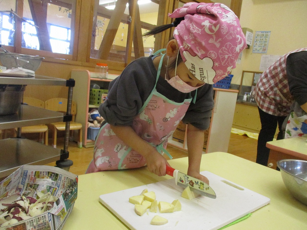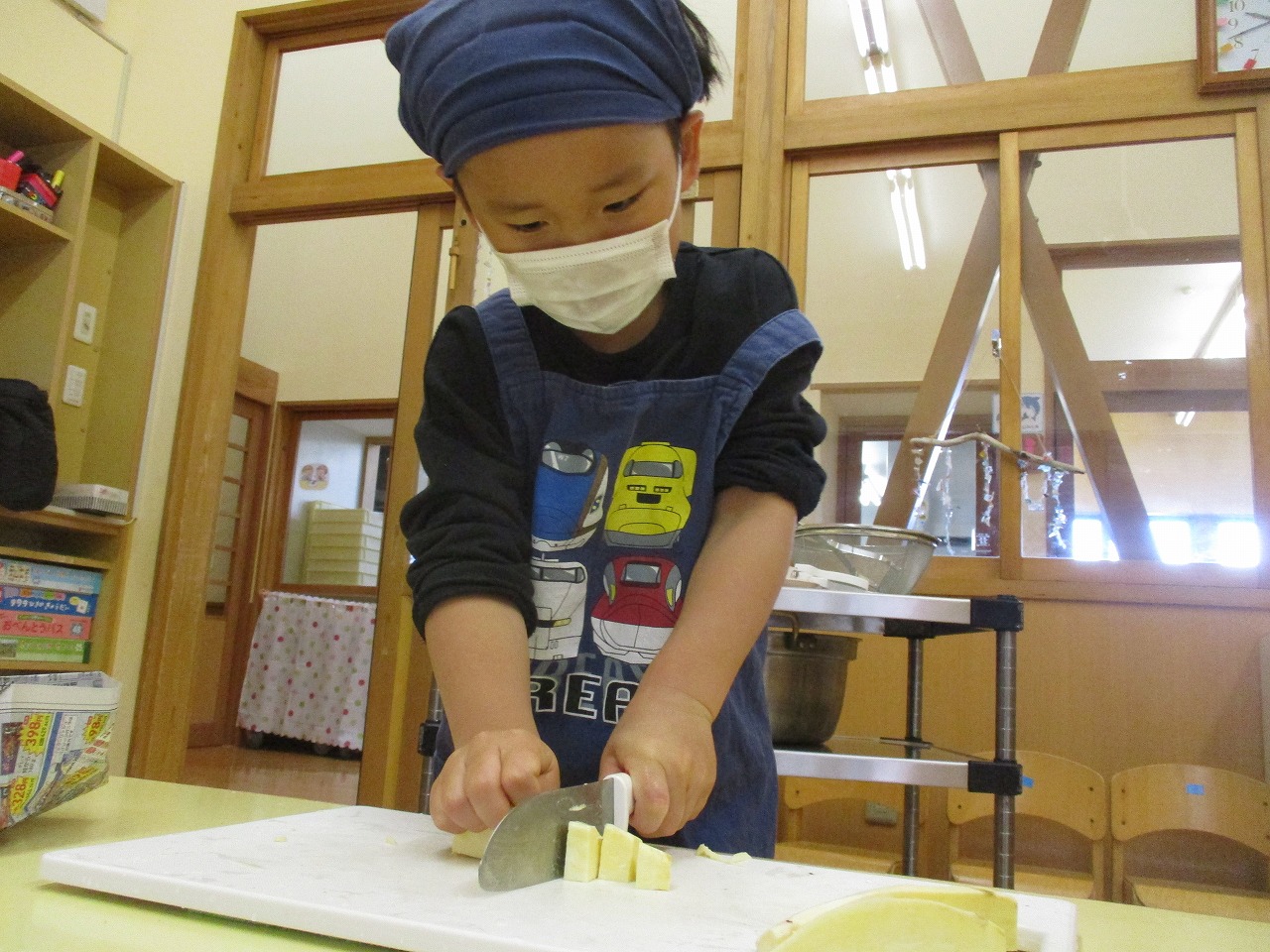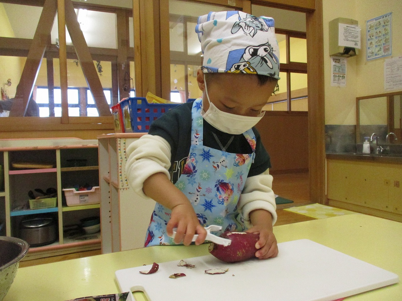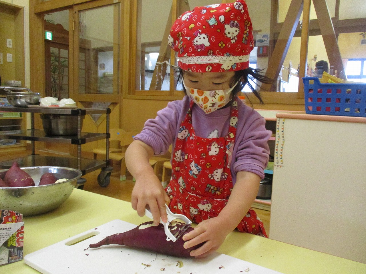 保育所で採れたさつま芋を使ってスイートポテトを作りました。ピーラーで皮をむいたり包丁で硬いさつま芋を切ったりするのは少し難しいですが、慎重に丁寧に取り組むこどもたちでした。