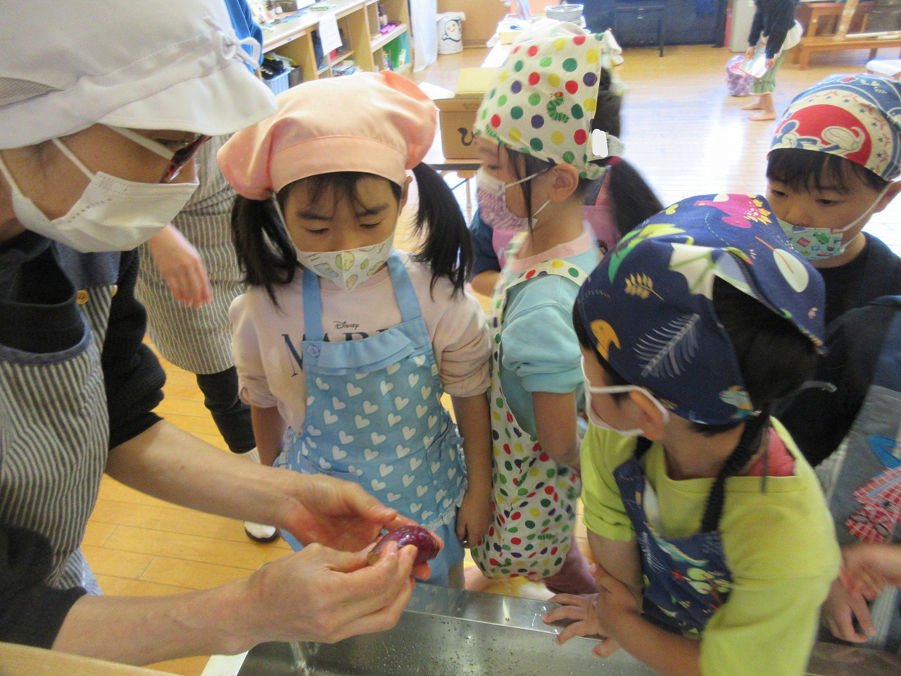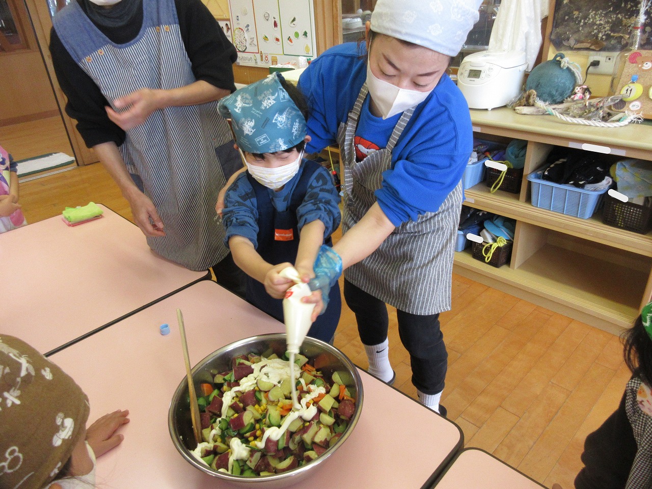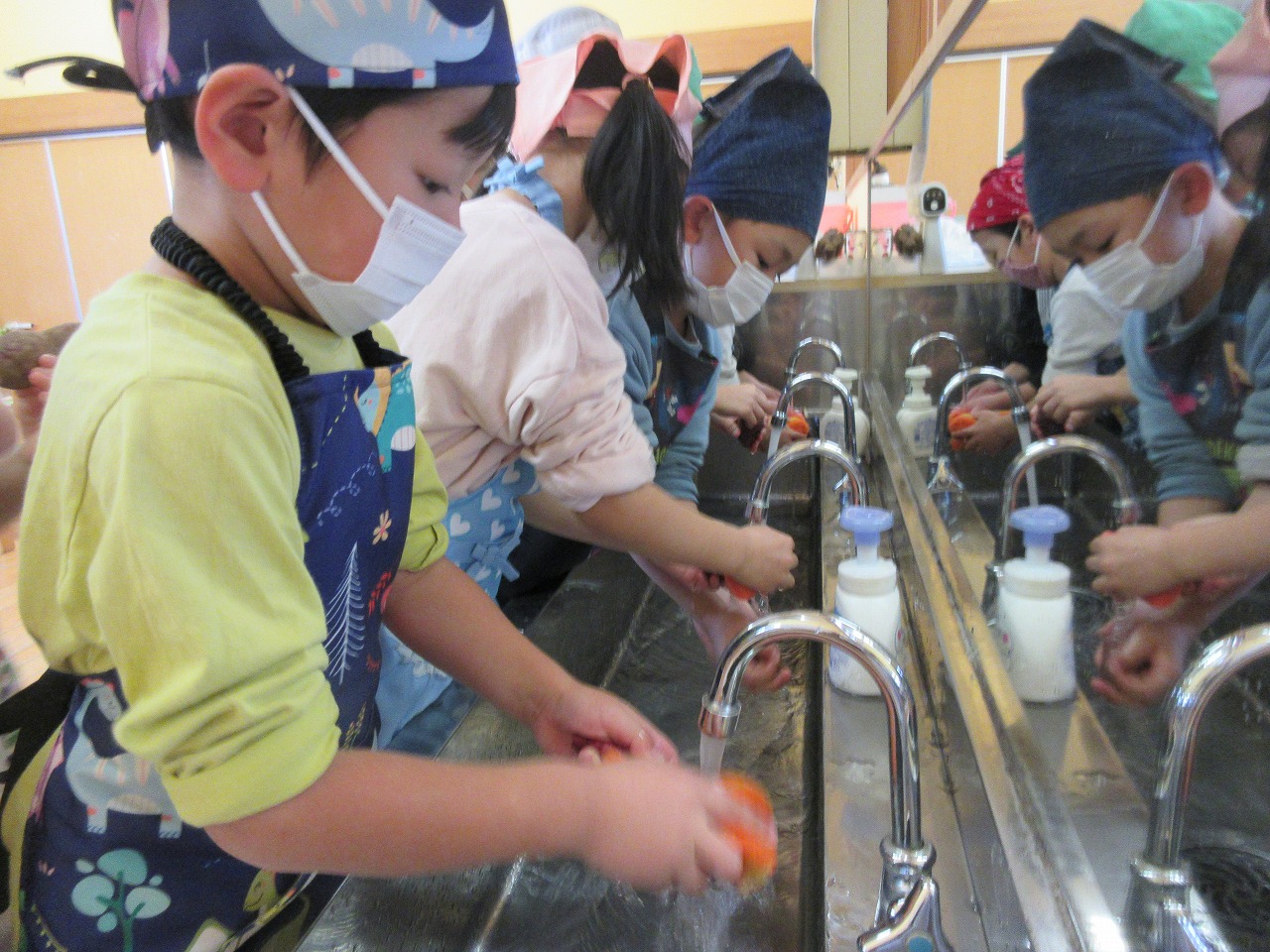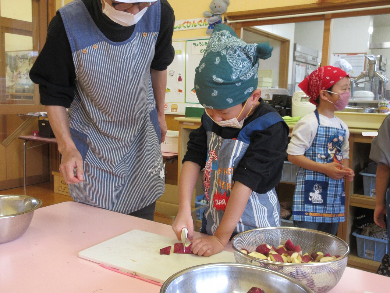 今日の給食メニューに収穫したさつま芋を使ったさつま芋マヨサラダが出るということで、いるか・くじら組でお手伝いしました。
