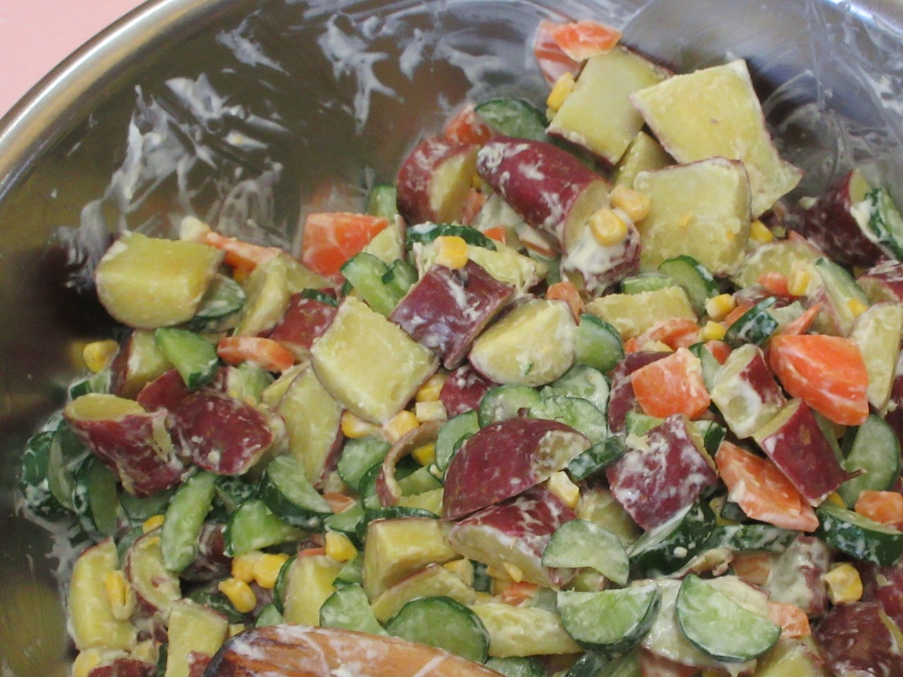 茹でたさつま芋、胡瓜、人参とコーンの準備OK!!