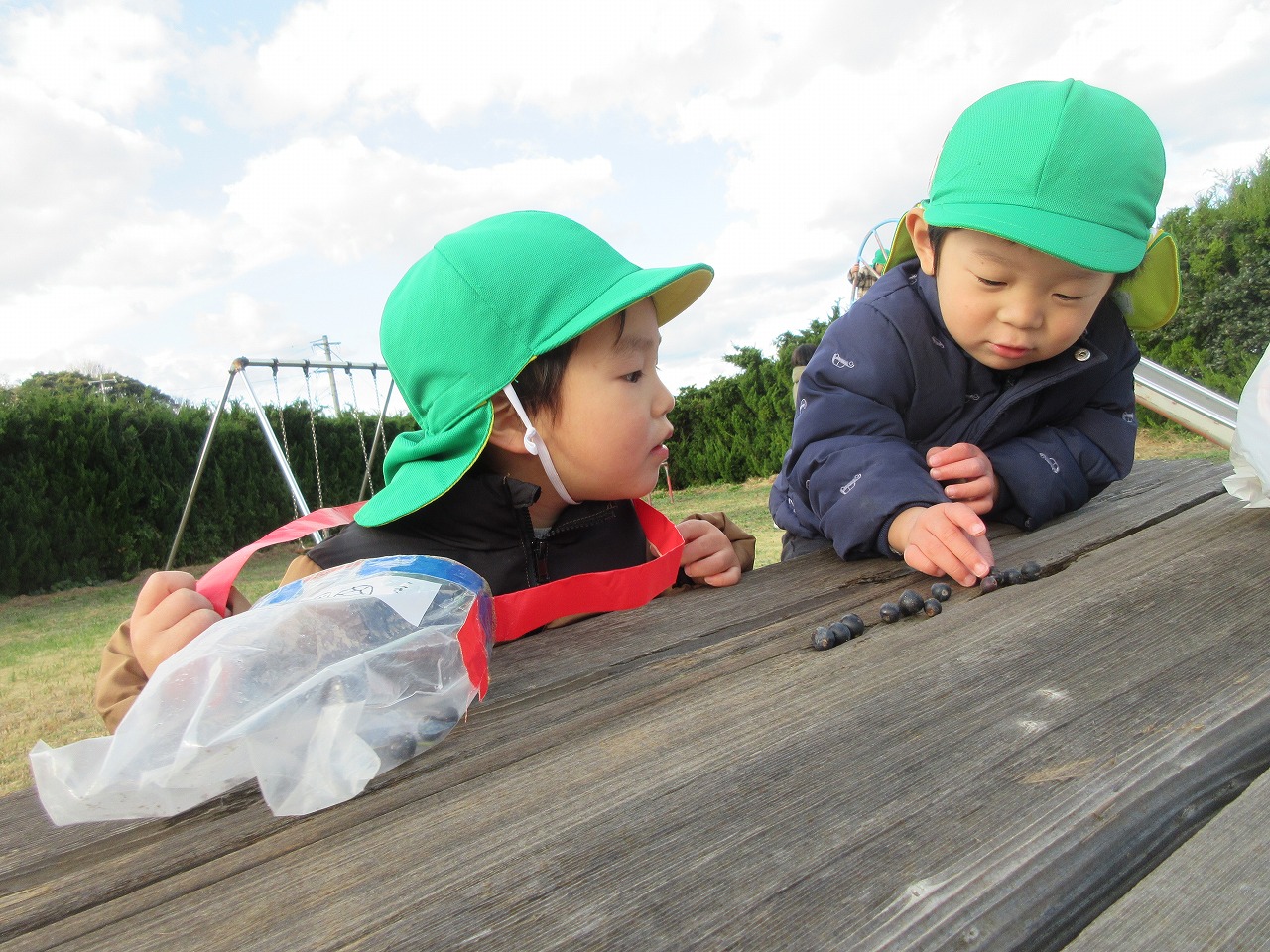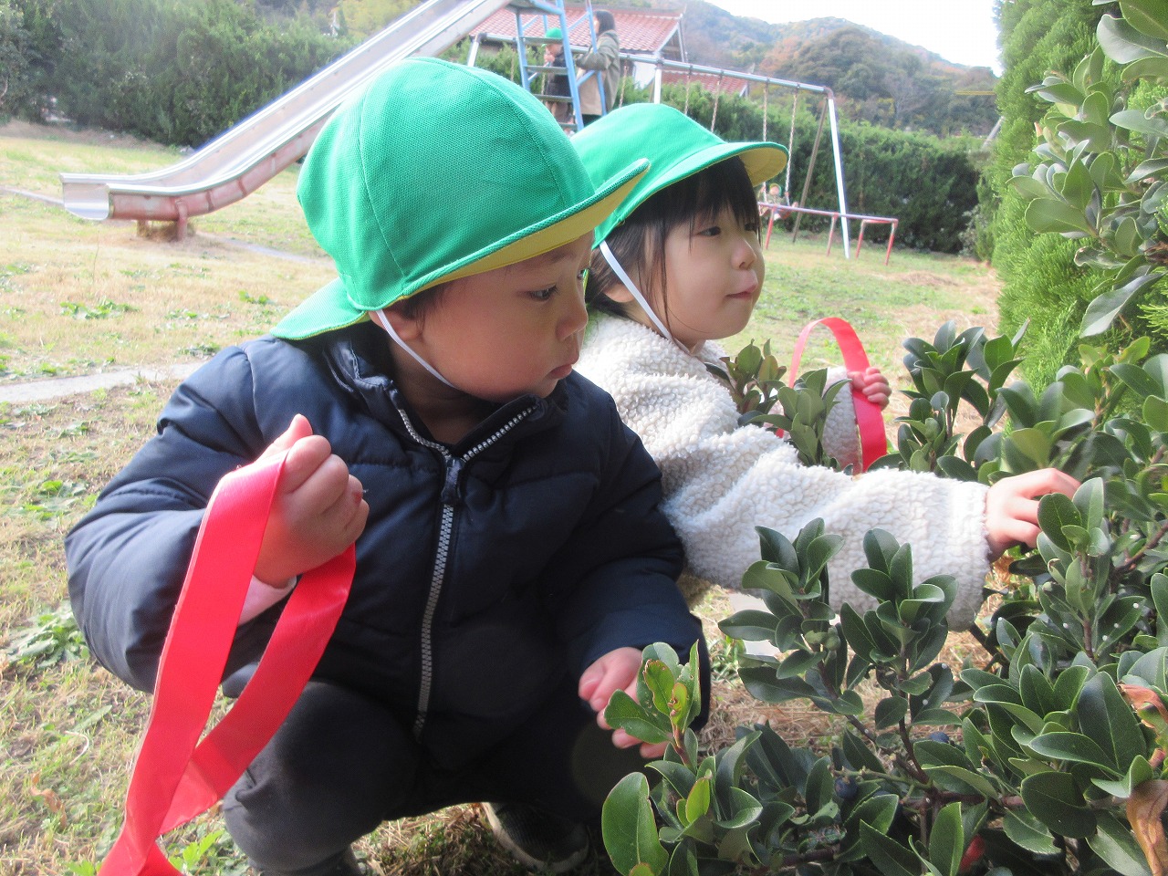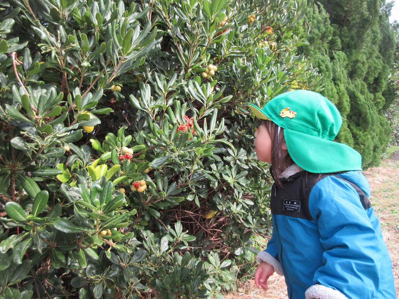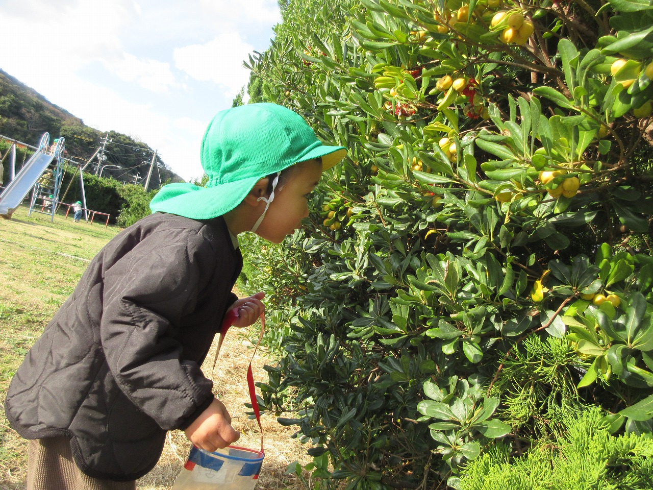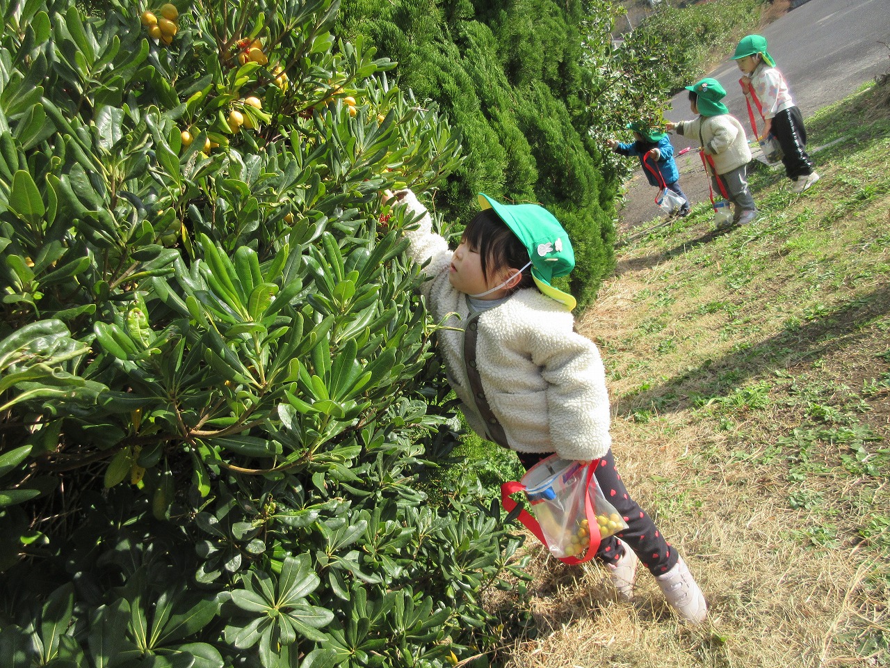 12月とは思えないポカポカ陽気の中散歩に出かけました。うきうきな様子で、道中は見つけた物、気付いたことを保育者や友達に伝えようととても賑やかでした。公園では遊具で思い切り体を動かしたり、トンガやシャリンバイの実を見つけて夢中になって摘んではお散歩バッグに入れたり、集めた実でお店屋さんごっこをしたりして楽しむ子どもたちでした。