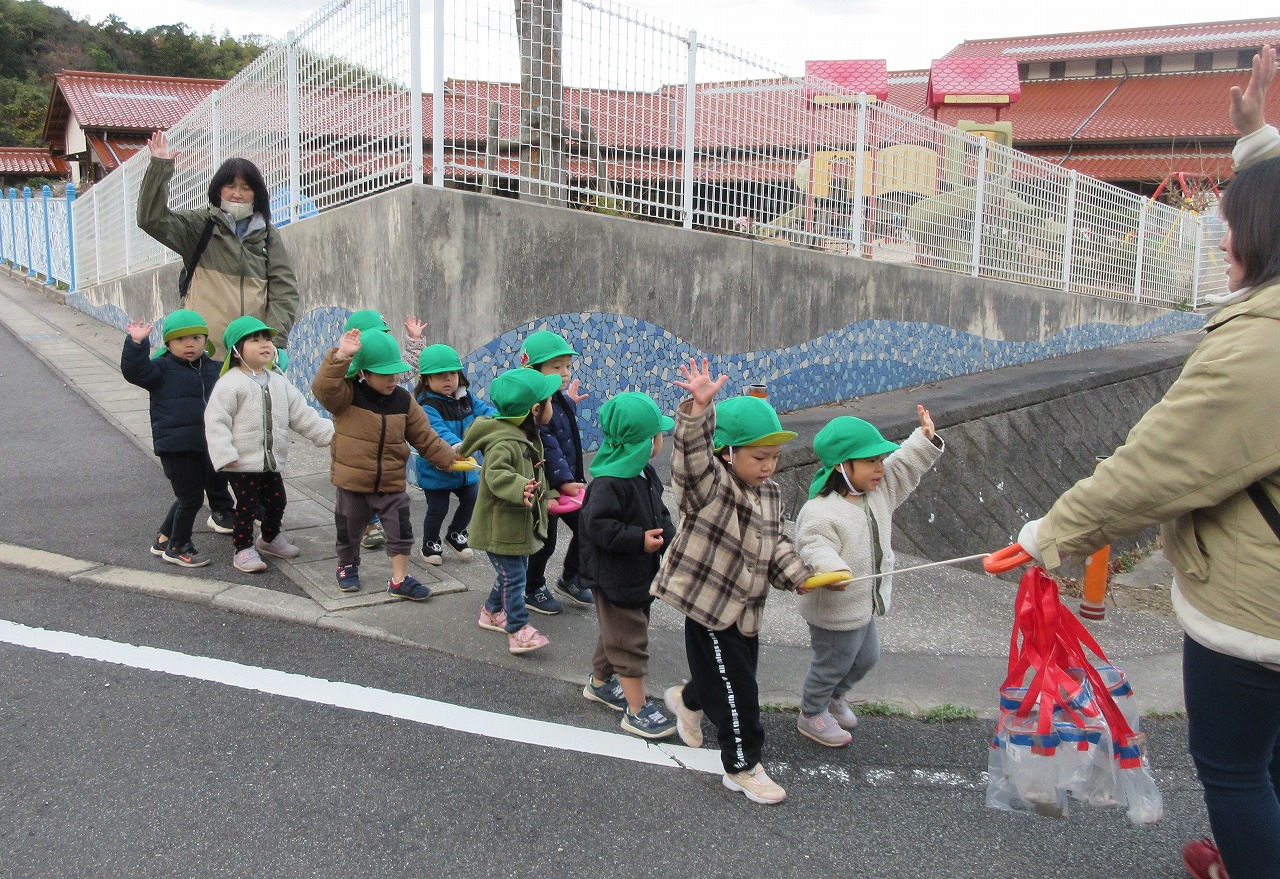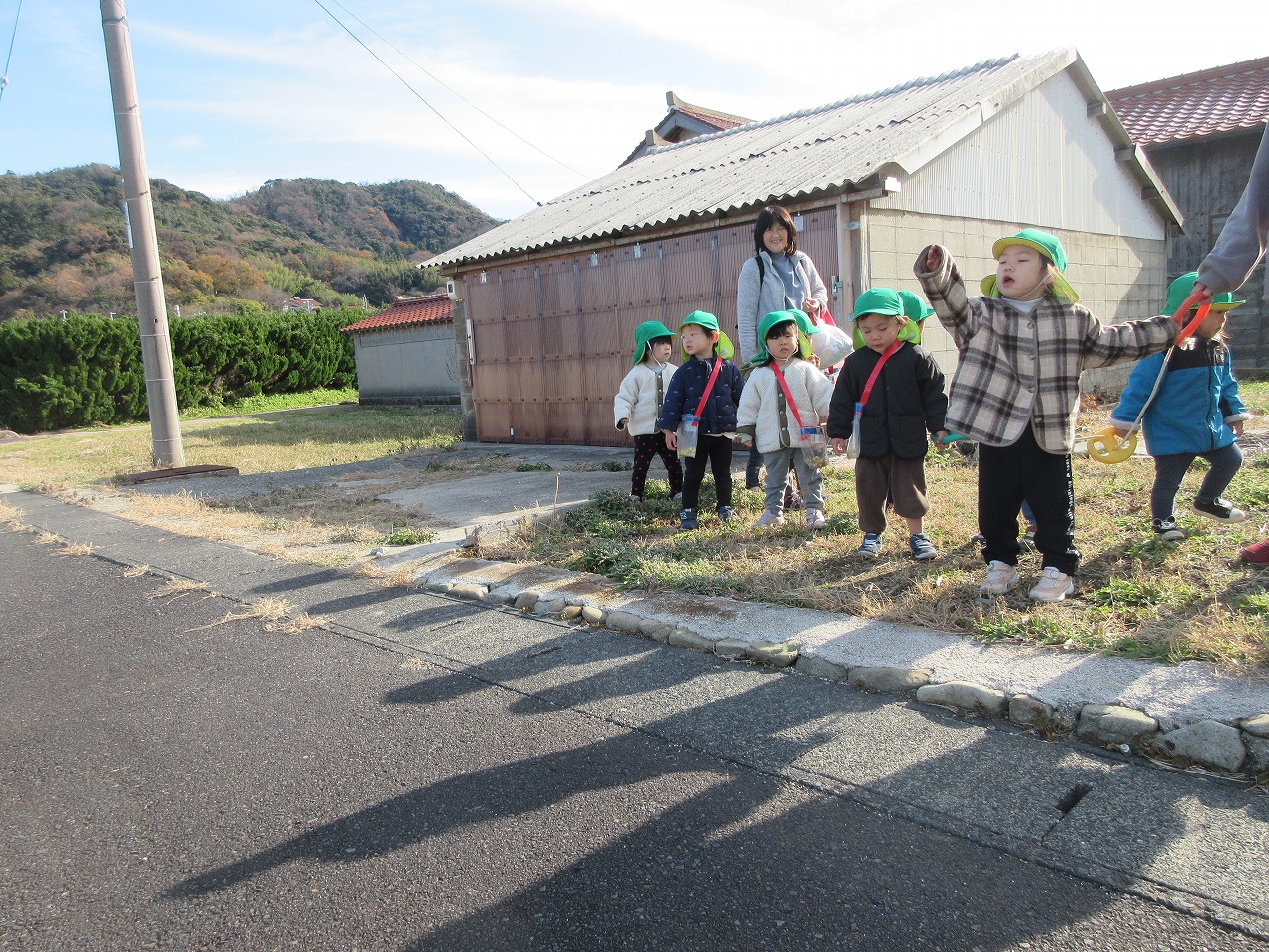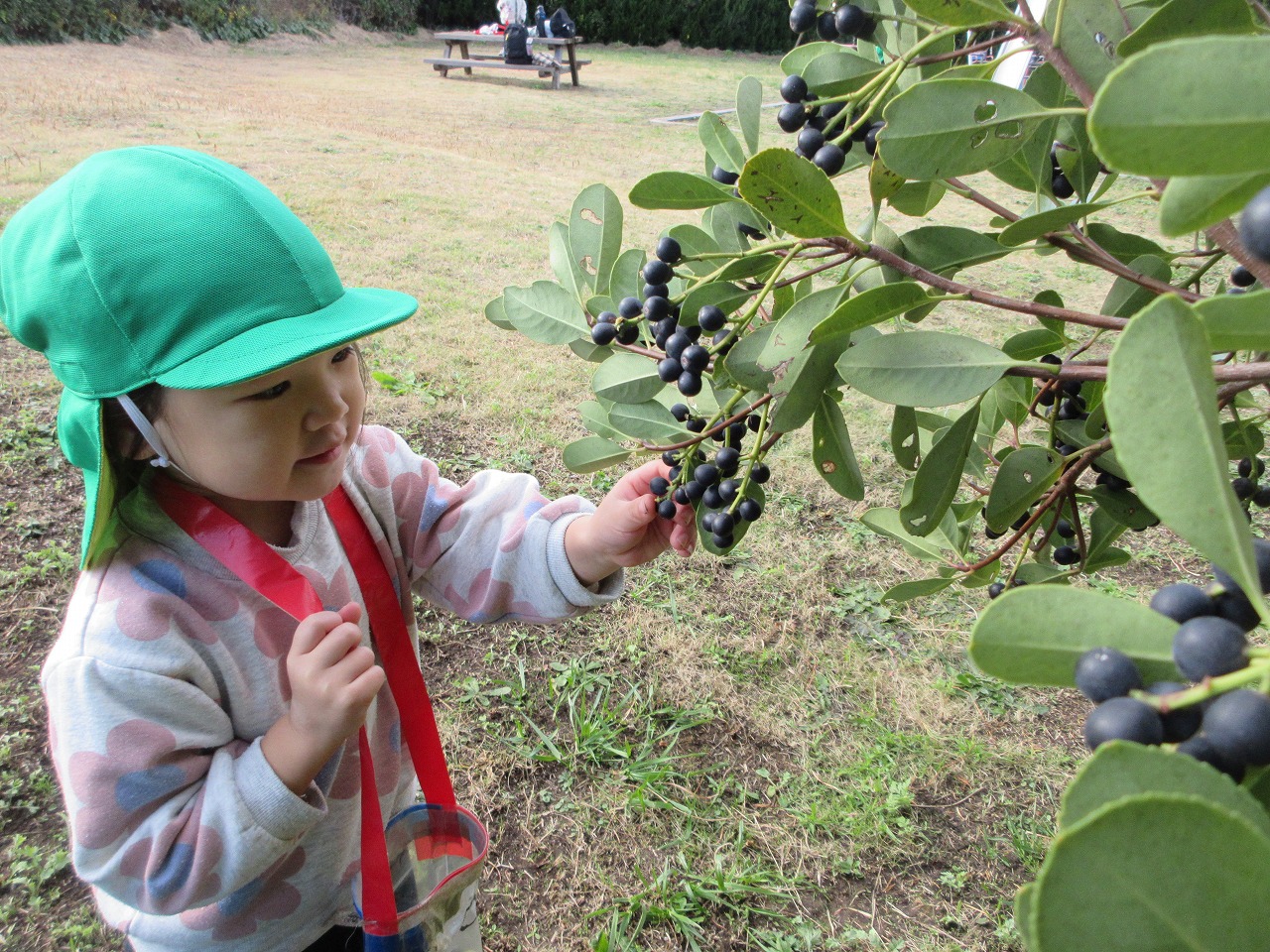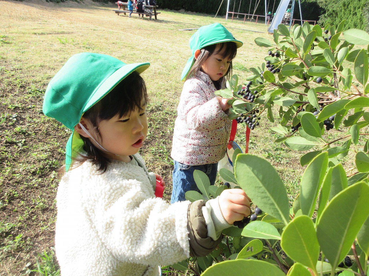12月とは思えないポカポカ陽気の中散歩に出かけました。うきうきな様子で、道中は見つけた物、気付いたことを保育者や友達に伝えようととても賑やかでした。公園では遊具で思い切り体を動かしたり、トンガやシャリンバイの実を見つけて夢中になって摘んではお散歩バッグに入れたり、集めた実でお店屋さんごっこをしたりして楽しむ子どもたちでした。