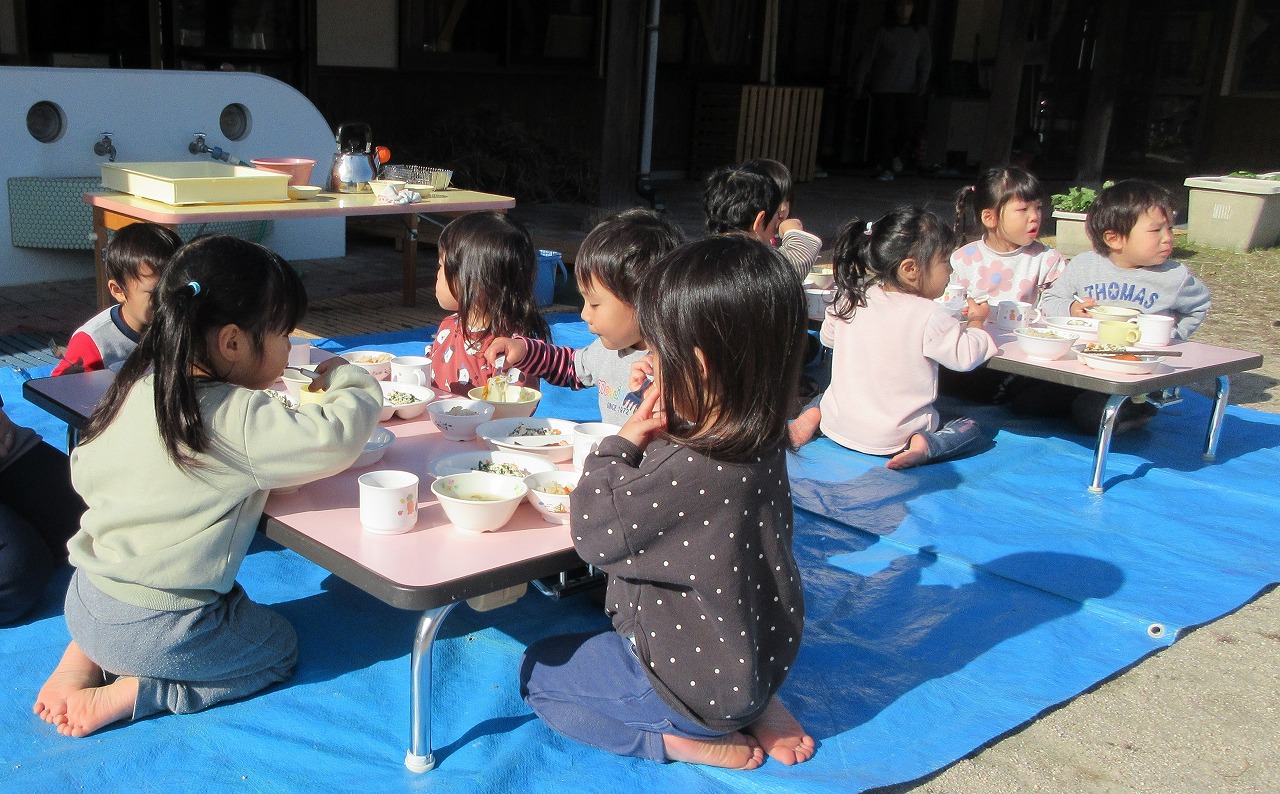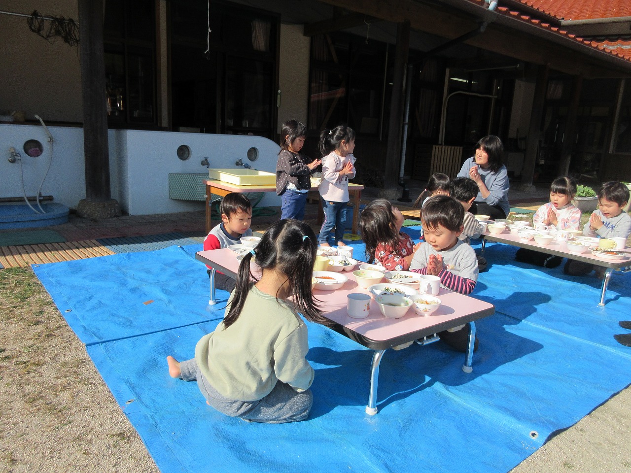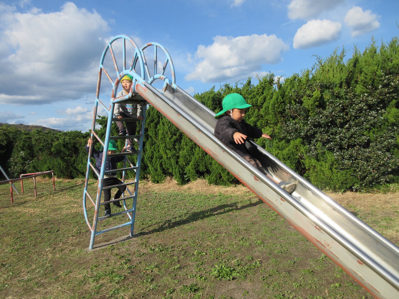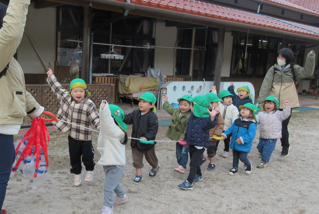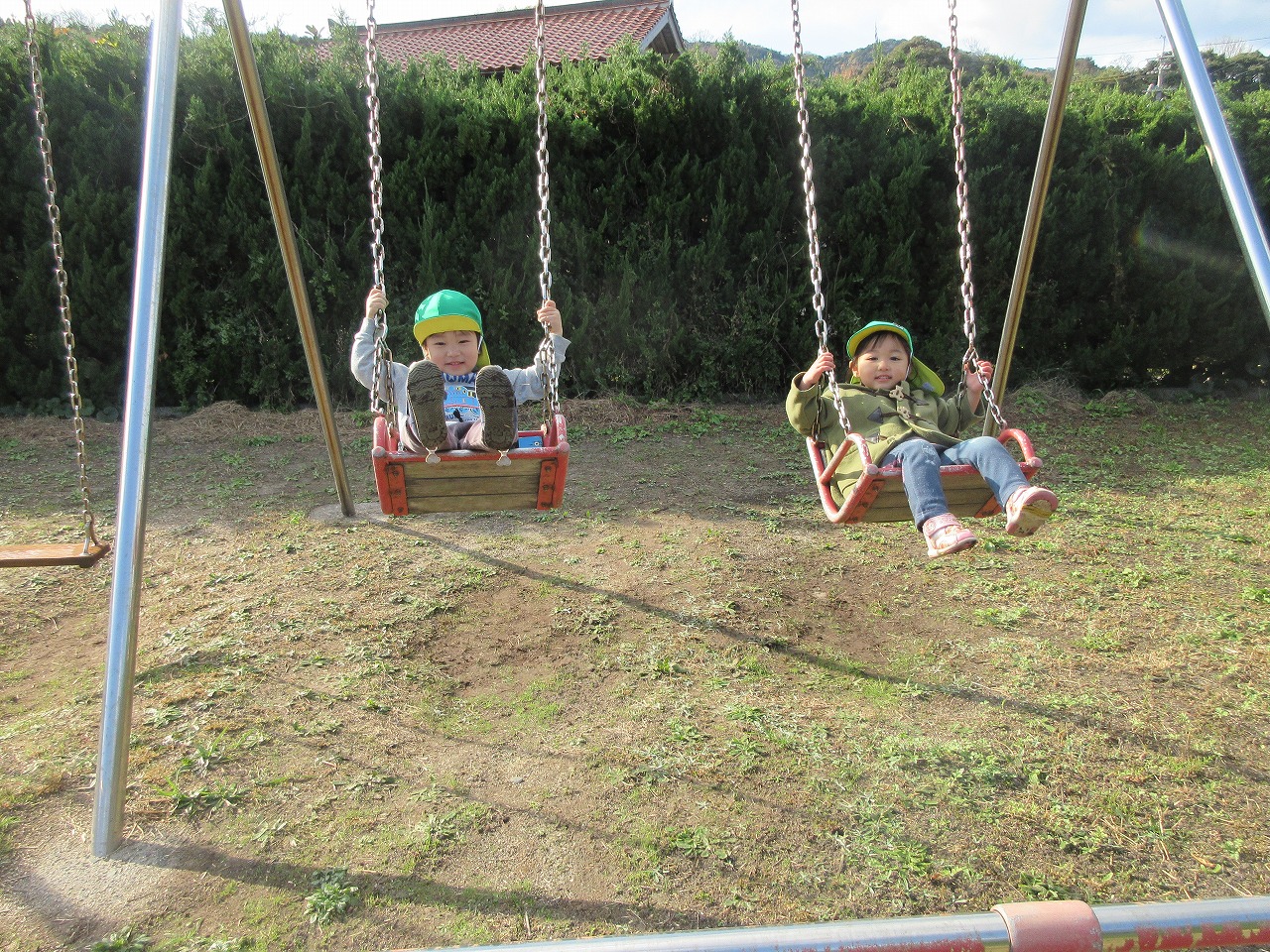 12月とは思えないポカポカ陽気の中散歩に出かけました。うきうきな様子で、道中は見つけた物、気付いたことを保育者や友達に伝えようととても賑やかでした。公園では遊具で思い切り体を動かしたり、トンガやシャリンバイの実を見つけて夢中になって摘んではお散歩バッグに入れたり、集めた実でお店屋さんごっこをしたりして楽しむ子どもたちでした。