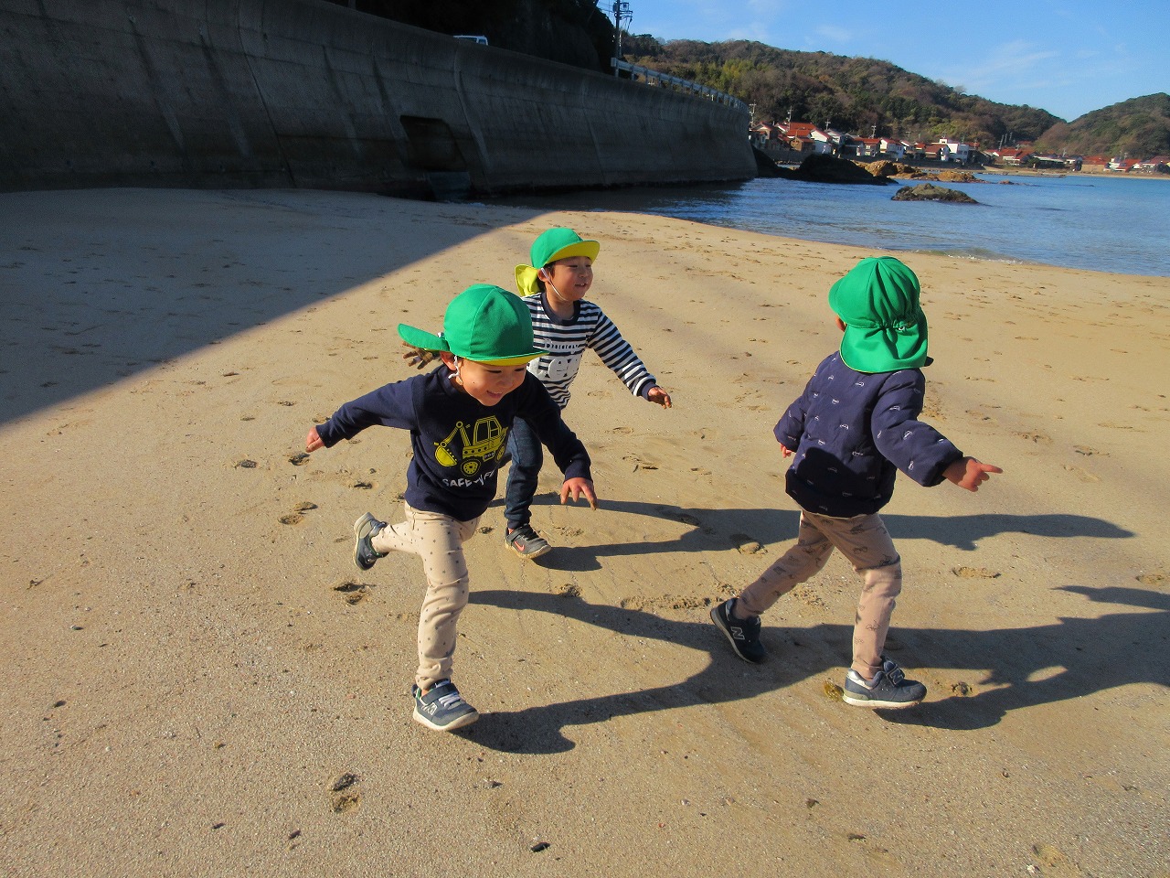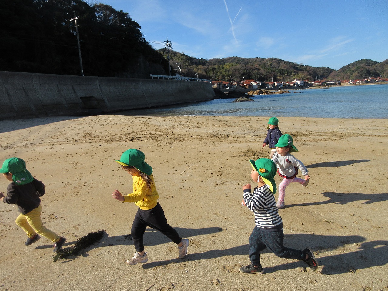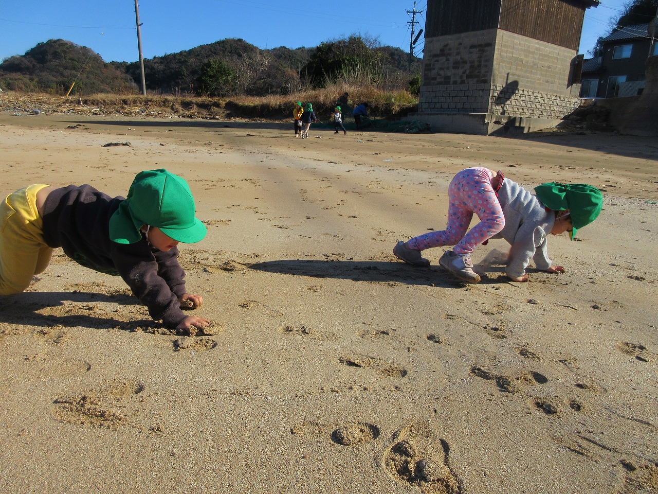 12月とは思えないようなポカポカ陽気の中散歩に行きました。「イカとサザエの看板見よう~」「川もみていくか」「あ、ここ来たことある公園だ」と保育所周辺に詳しくなった子ども達。賑やかにお話したり、歌を歌ったりして歩きました。小具の浜に着くと今日はたくさん貝殻が打ち上げられていて夢中で拾って集めました。ポカポカ暖かくなり途中からは上着を脱いで砂遊びしたり、走ったり、砂に絵を描いたりして満喫したらっこ組の子どもたちでした。