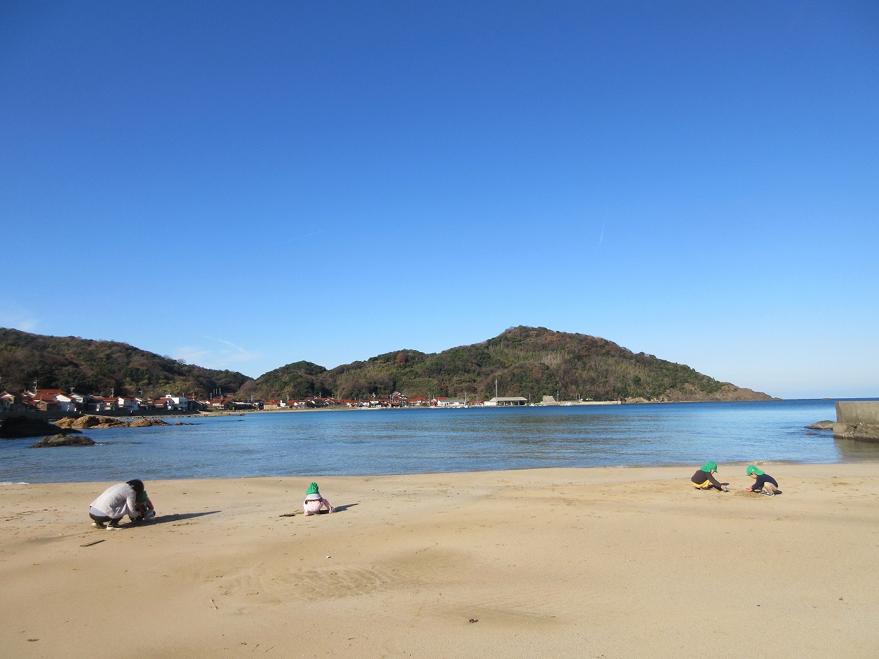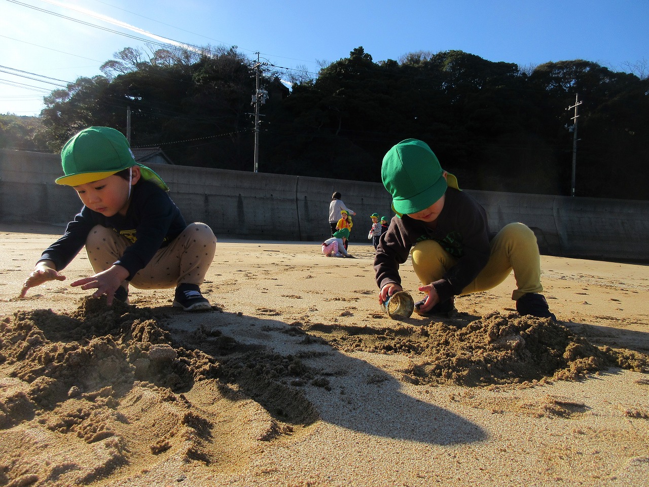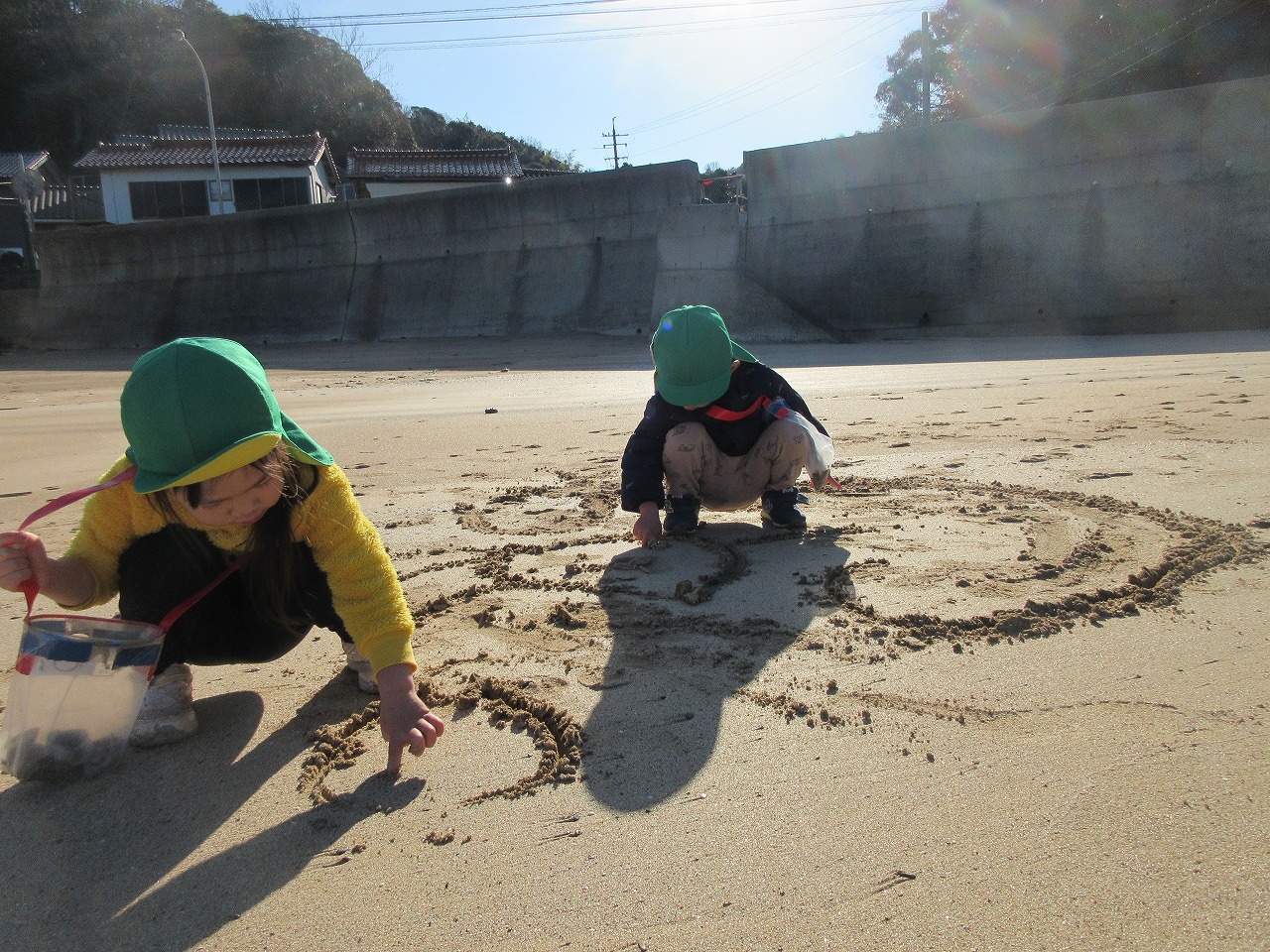 12月とは思えないようなポカポカ陽気の中散歩に行きました。「イカとサザエの看板見よう~」「川もみていくか」「あ、ここ来たことある公園だ」と保育所周辺に詳しくなった子ども達。賑やかにお話したり、歌を歌ったりして歩きました。小具の浜に着くと今日はたくさん貝殻が打ち上げられていて夢中で拾って集めました。ポカポカ暖かくなり途中からは上着を脱いで砂遊びしたり、走ったり、砂に絵を描いたりして満喫したらっこ組の子どもたちでした。