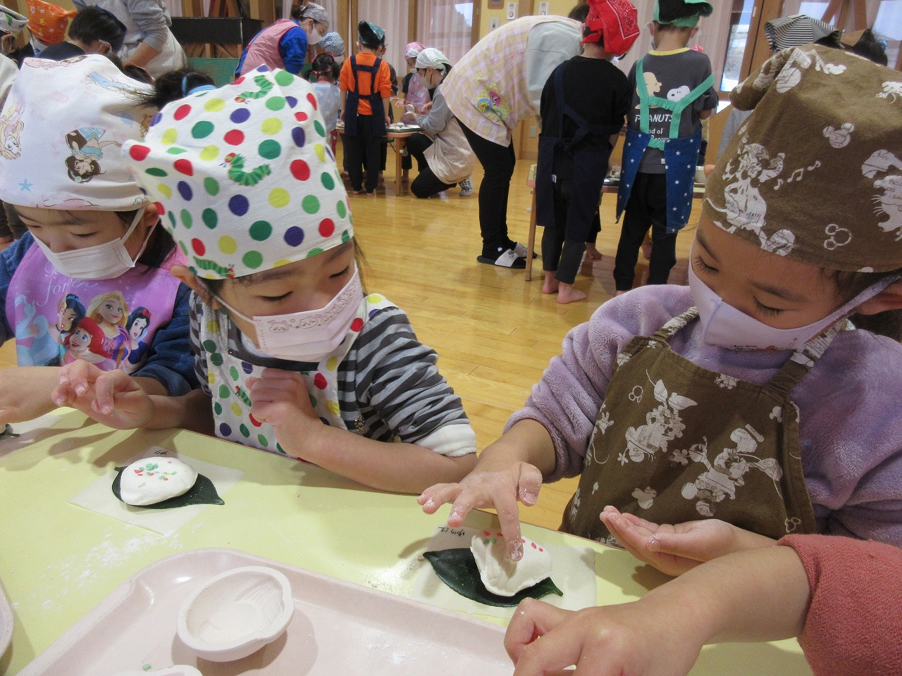 今年も花もちを作りました。花もちの由来を聞いたり椿の葉っぱを使うのはどうしてか知ると益々花もちに関心が向く子ども達でした。