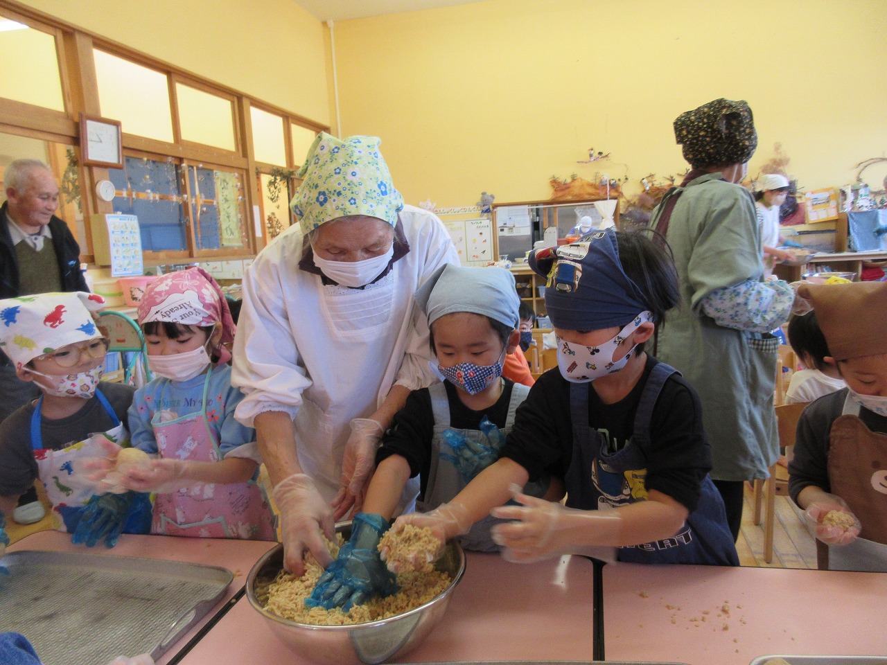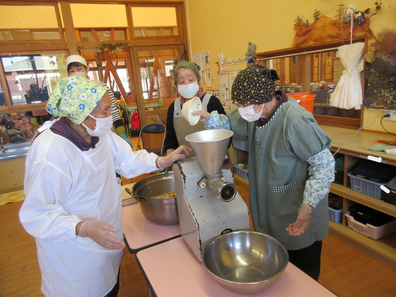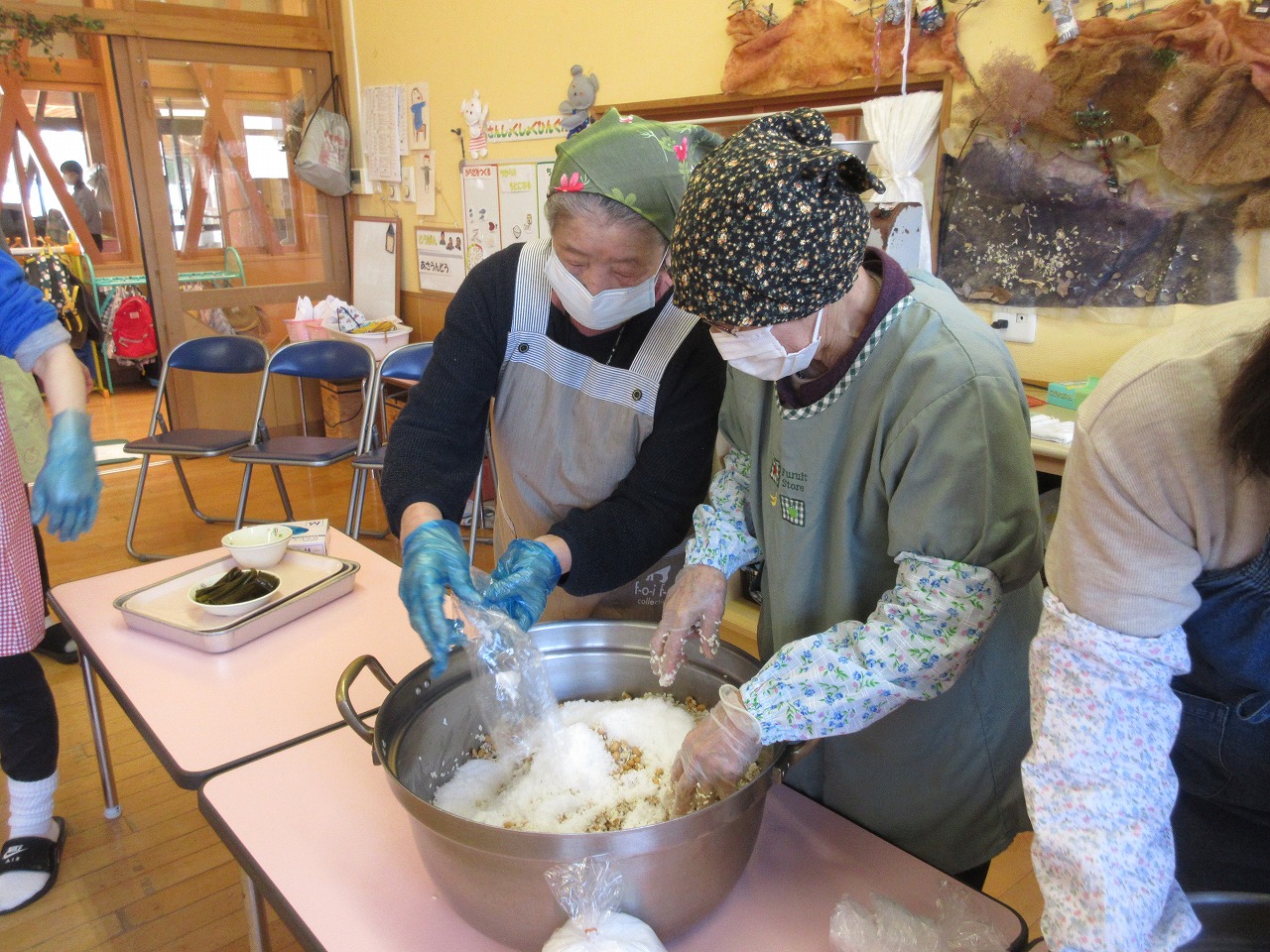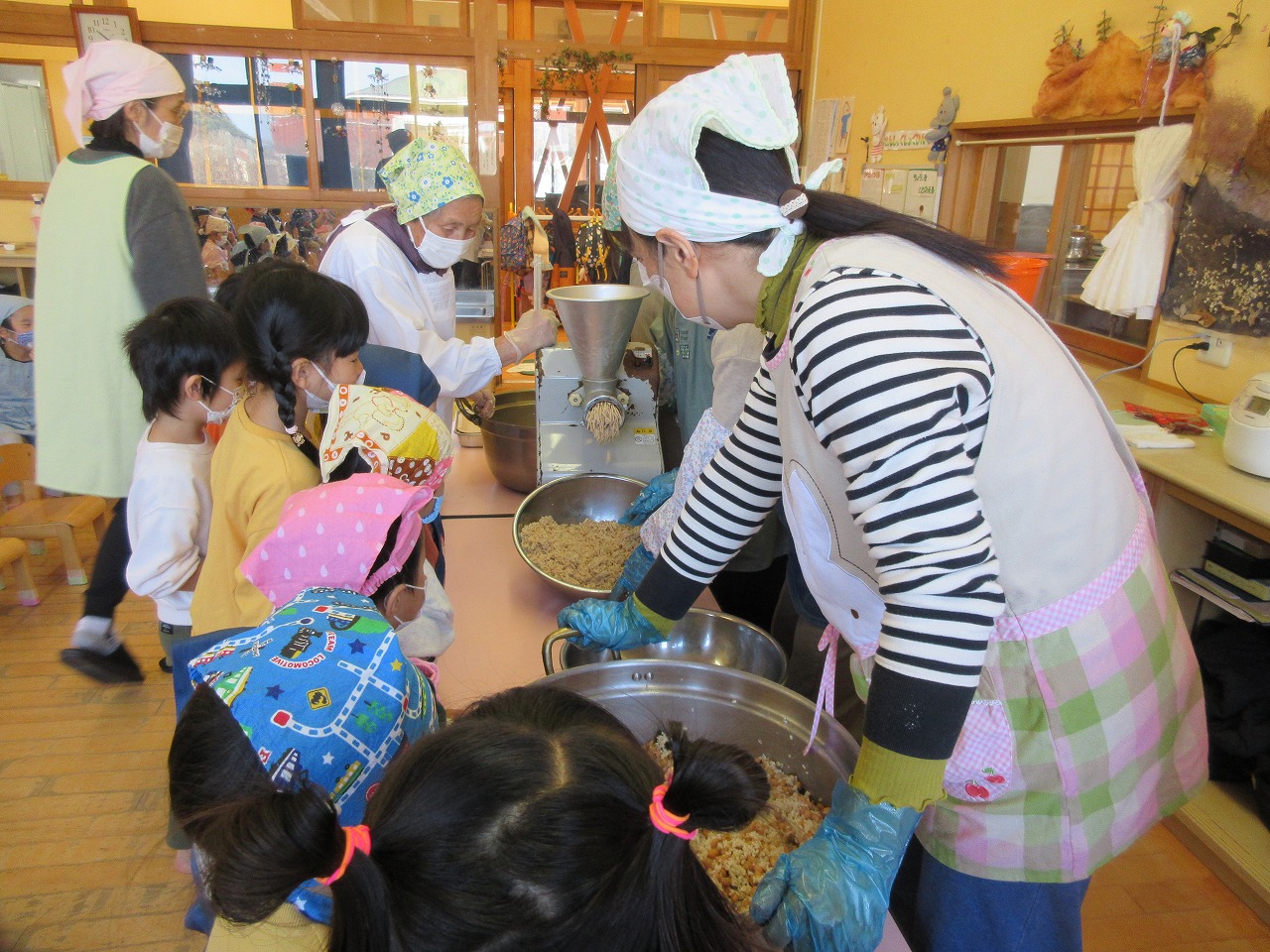 今年も地域講師さんにお越し頂き、味噌の作り方を丁寧に教えてもらいました。味噌作りに使用する機械を間近で見たり、味噌玉づくりをさせてもらったり・・・4、5歳児は、昨年の事を思い出し、3歳児は初めての体験に興味津々!!発見や感動いっぱいの体験となり、地域の方のぬくもりにも触れ楽しい時間を過ごしました。