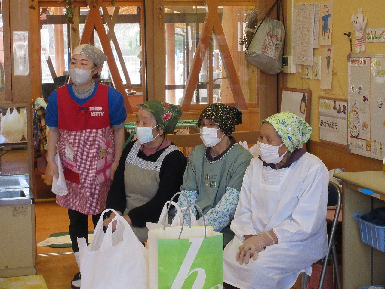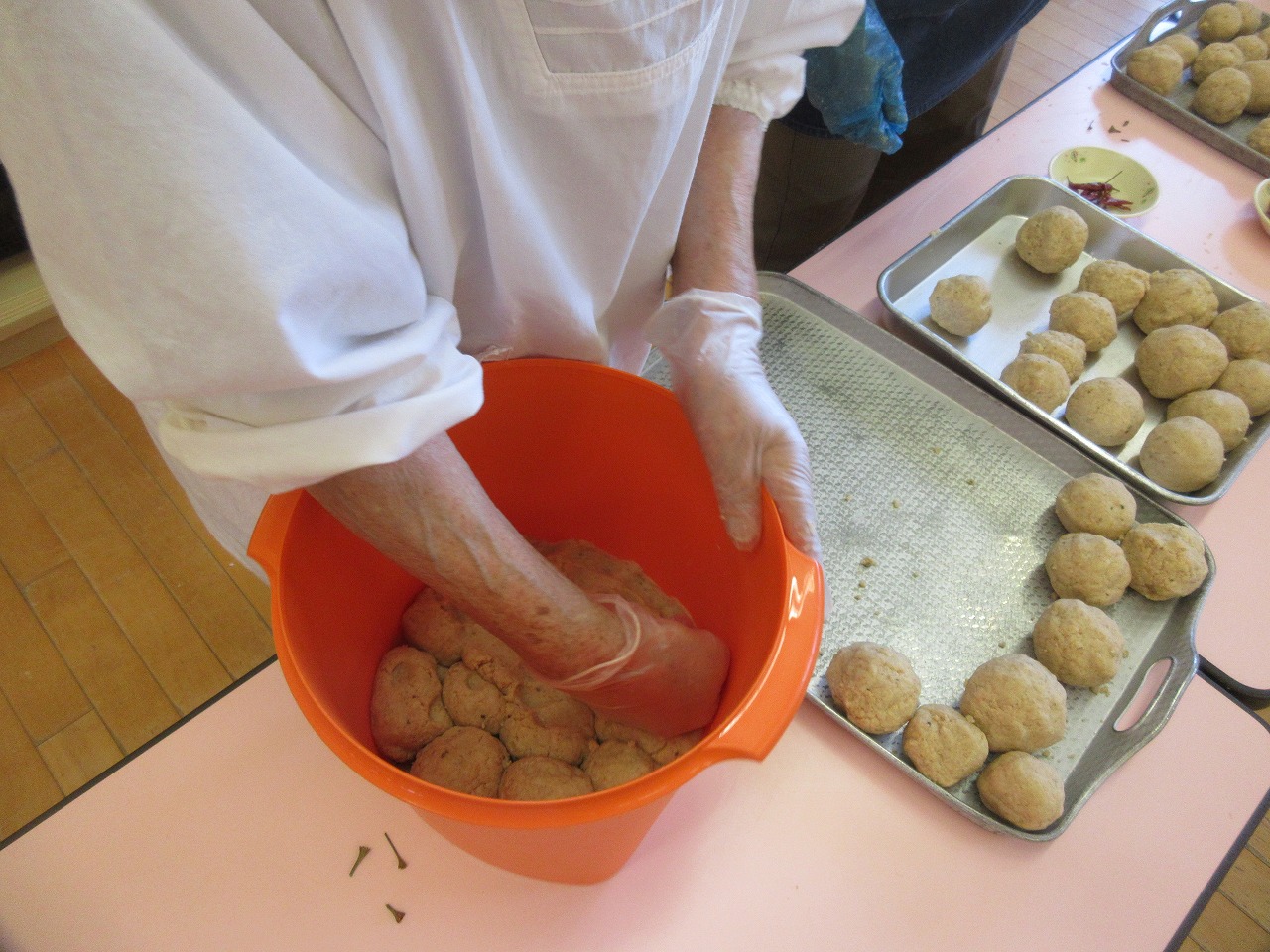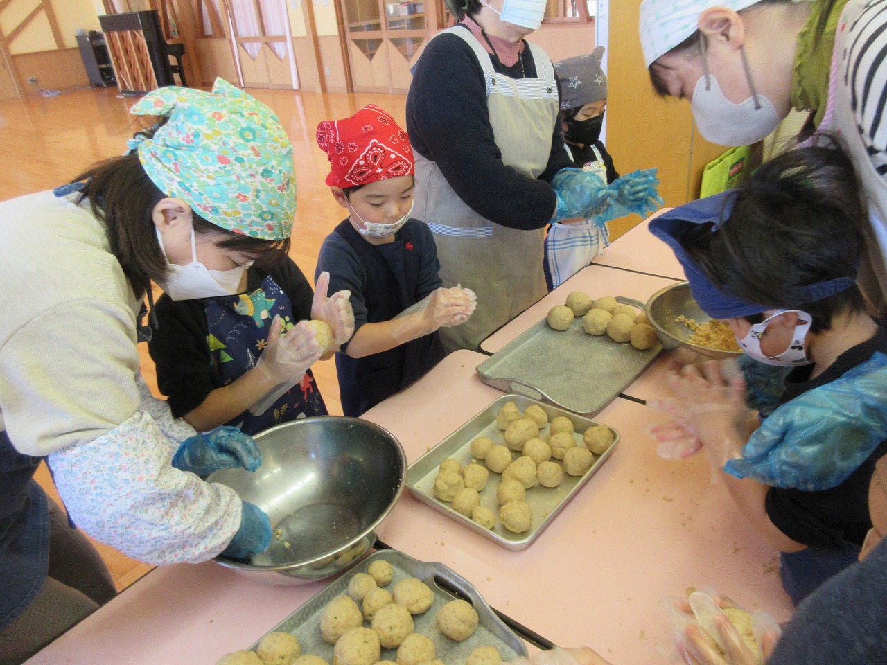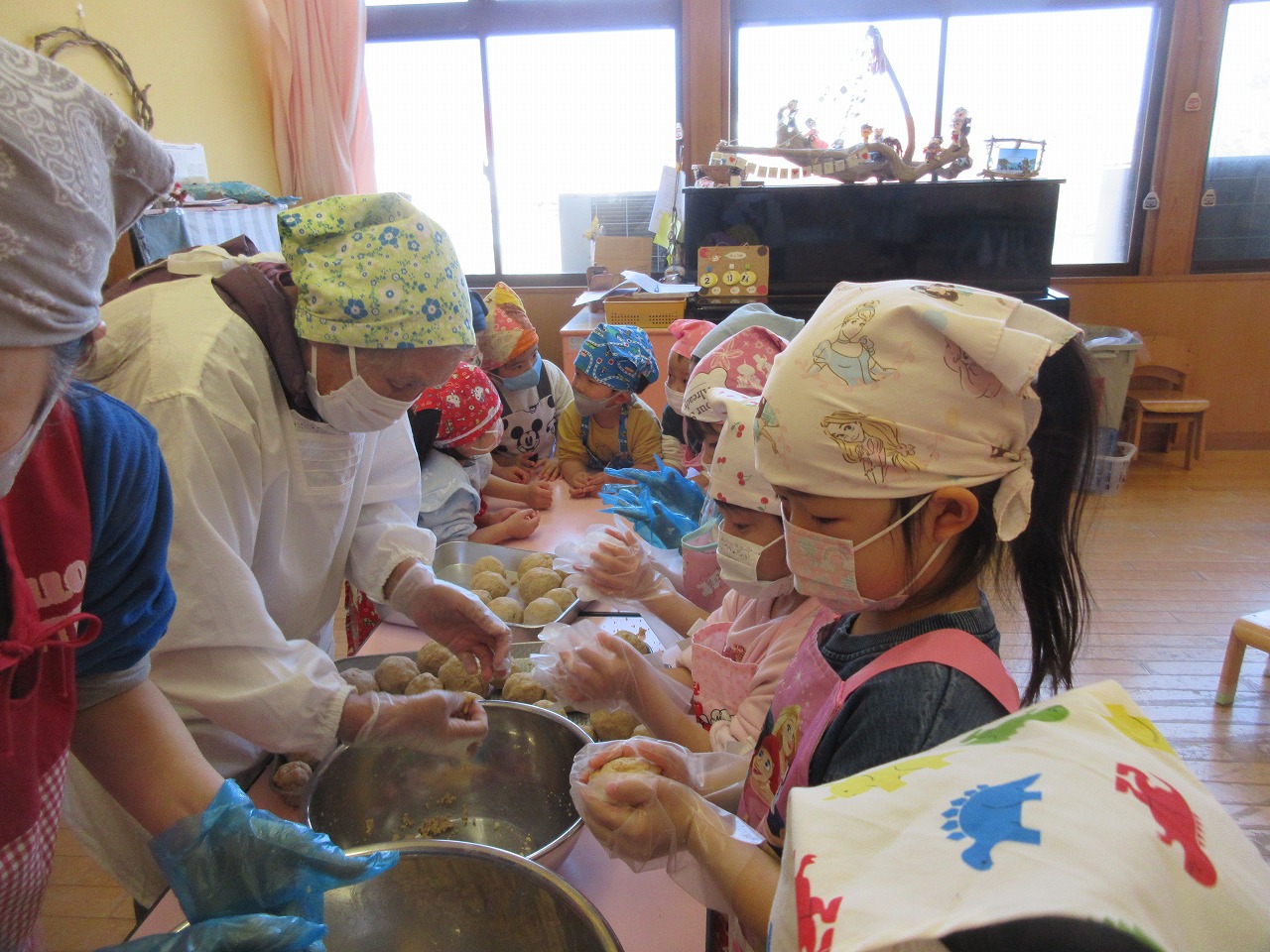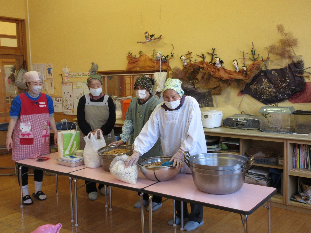 今年も地域講師さんにお越し頂き、味噌の作り方を丁寧に教えてもらいました。味噌作りに使用する機械を間近で見たり、味噌玉づくりをさせてもらったり・・・4、5歳児は、昨年の事を思い出し、3歳児は初めての体験に興味津々!!発見や感動いっぱいの体験となり、地域の方のぬくもりにも触れ楽しい時間を過ごしました。