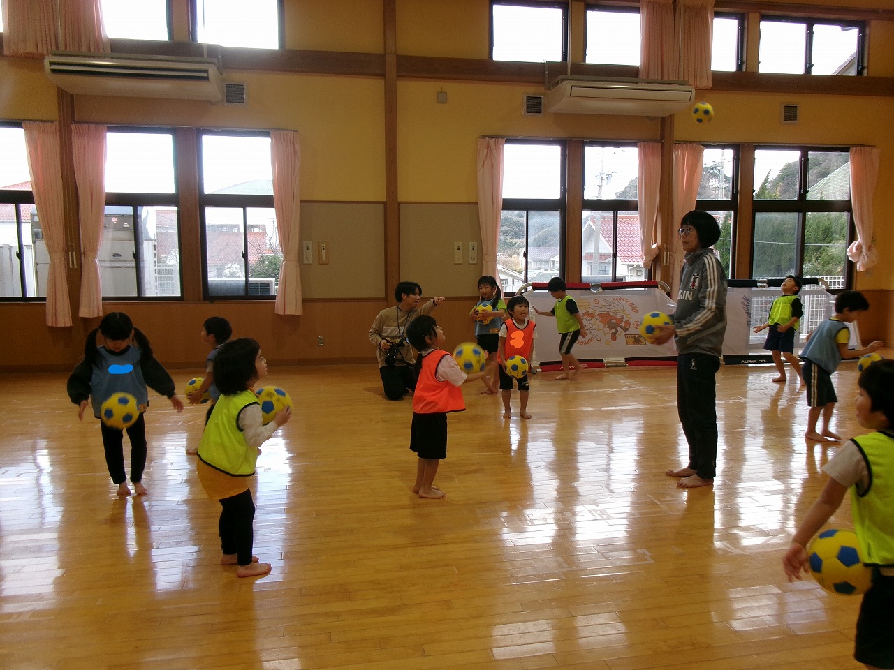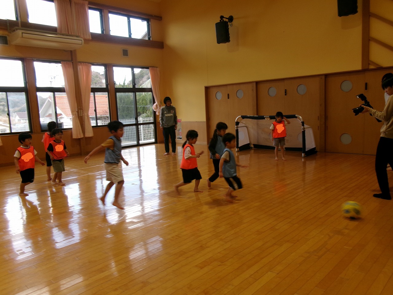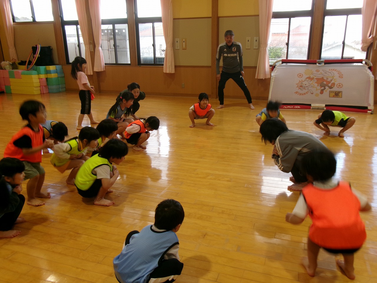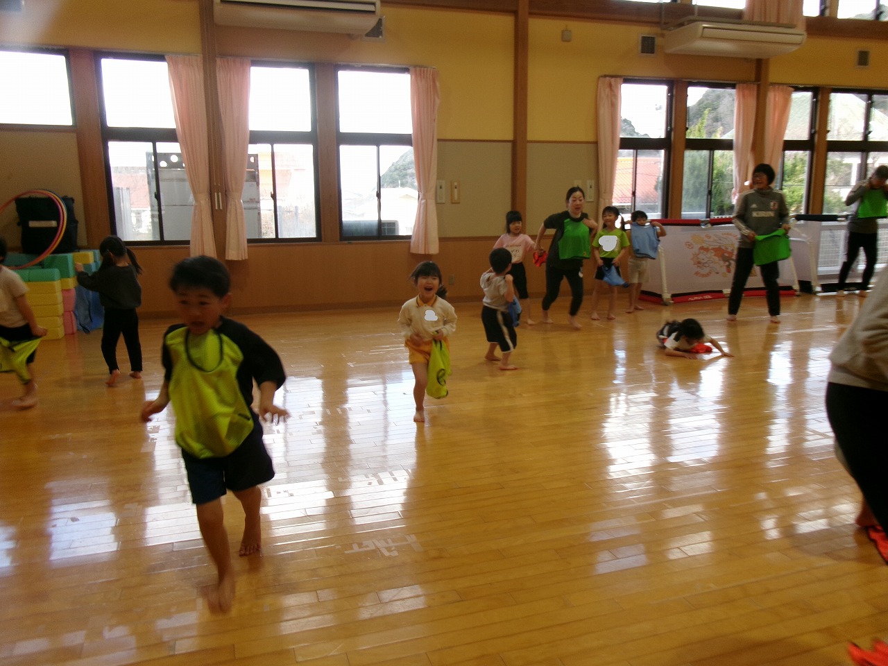 今年度最後のサッカー教室に野波保育所のお友達と一緒に参加しました。最初は氷鬼や“おーちたおちた”の遊びをしたり、ビブスやボールを使って体を動かしたりしました。最後は3チームに分かれて試合をしました。以前より積極的にボールを蹴りに行くようになり成長を感じると共に、白熱した面白い試合となりました。