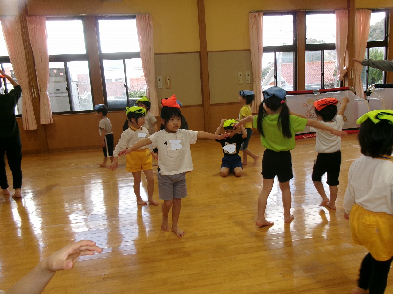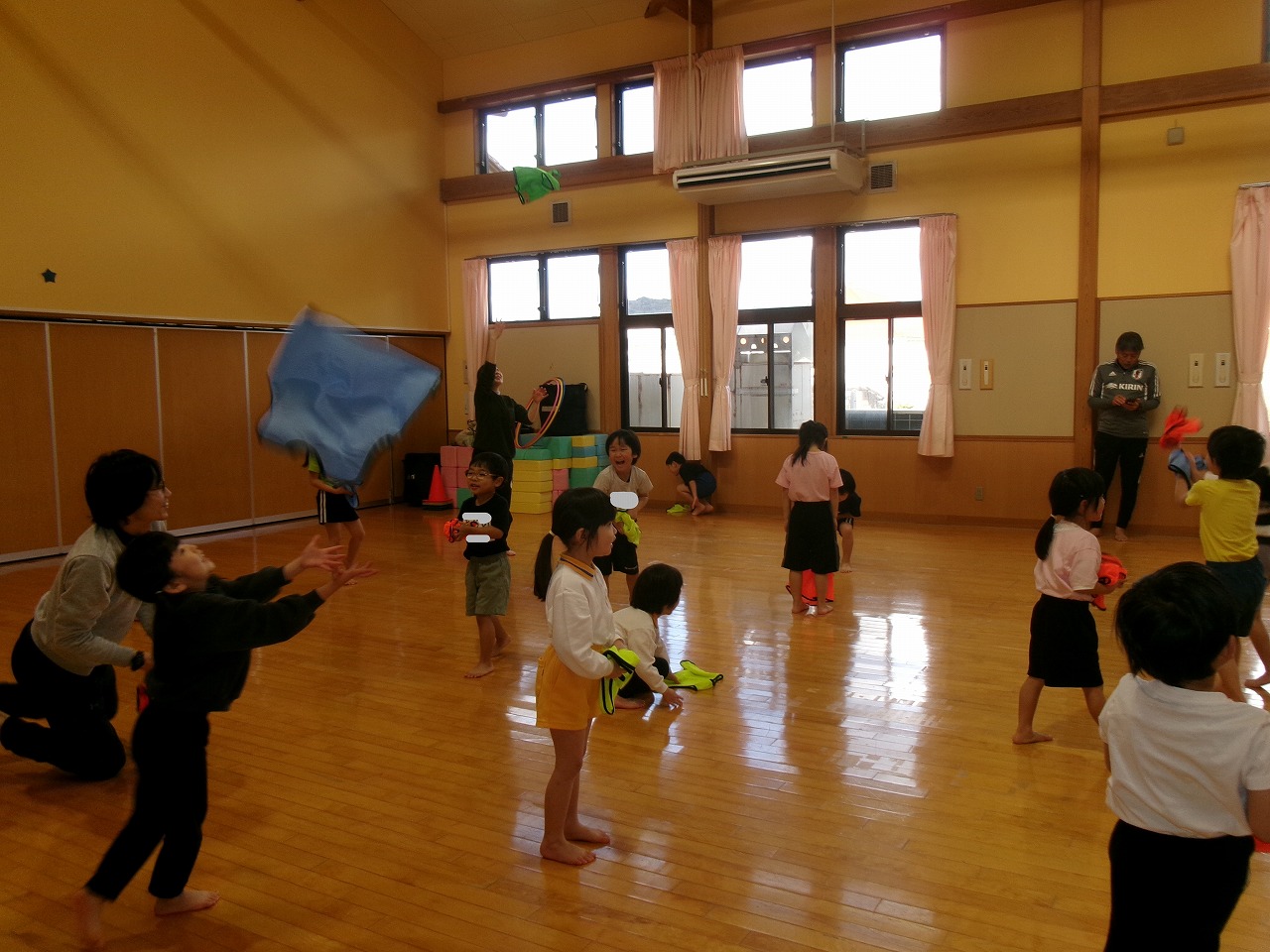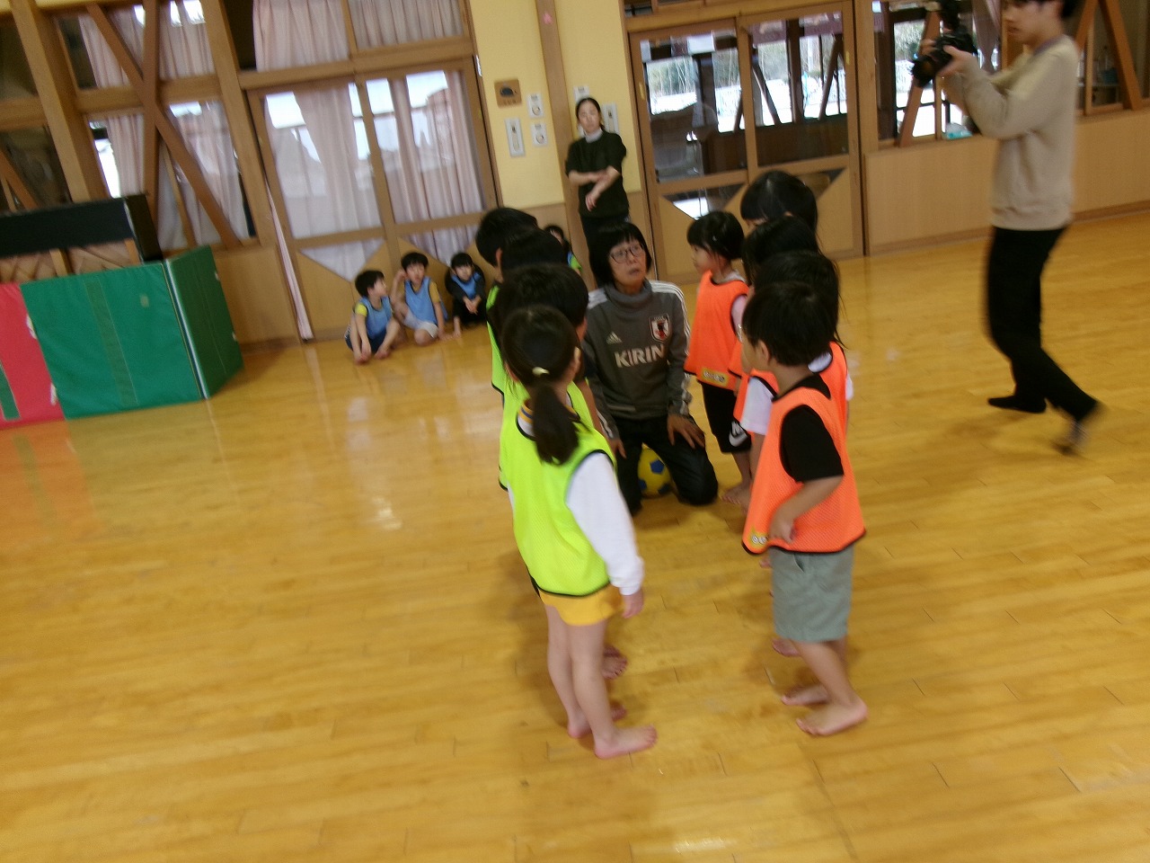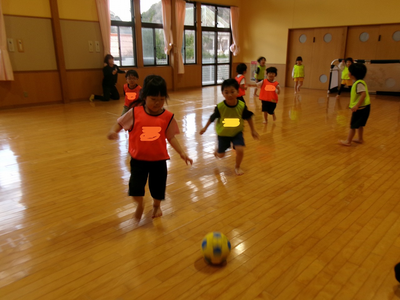 今年度最後のサッカー教室に野波保育所のお友達と一緒に参加しました。最初は氷鬼や“おーちたおちた”の遊びをしたり、ビブスやボールを使って体を動かしたりしました。最後は3チームに分かれて試合をしました。以前より積極的にボールを蹴りに行くようになり成長を感じると共に、白熱した面白い試合となりました。