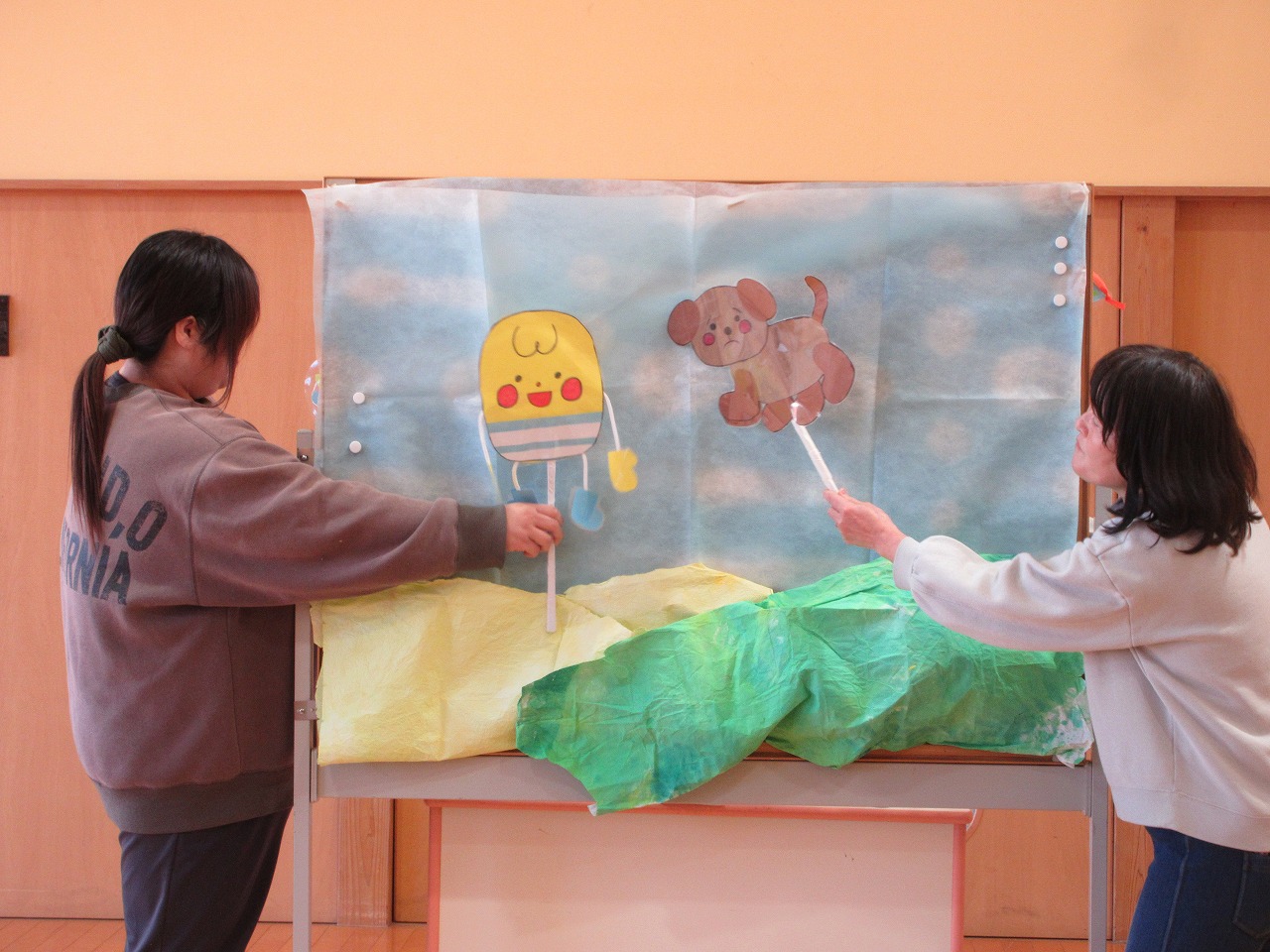 職員の出し物の「ヤダットちゃん」のペープサートのお話に出てきたワンちゃんやポップコーン屋さんのおじさんに盛り上がりました。