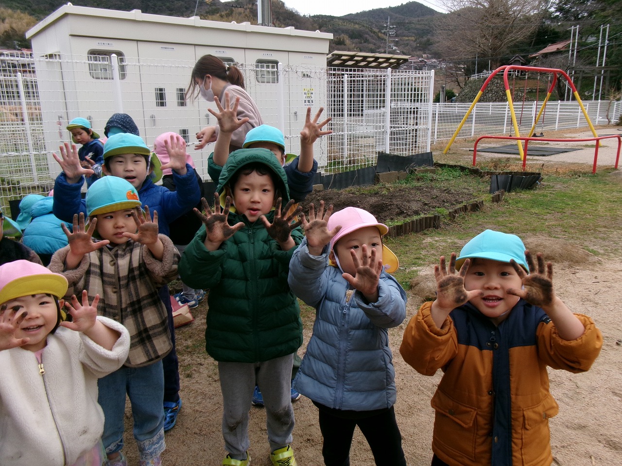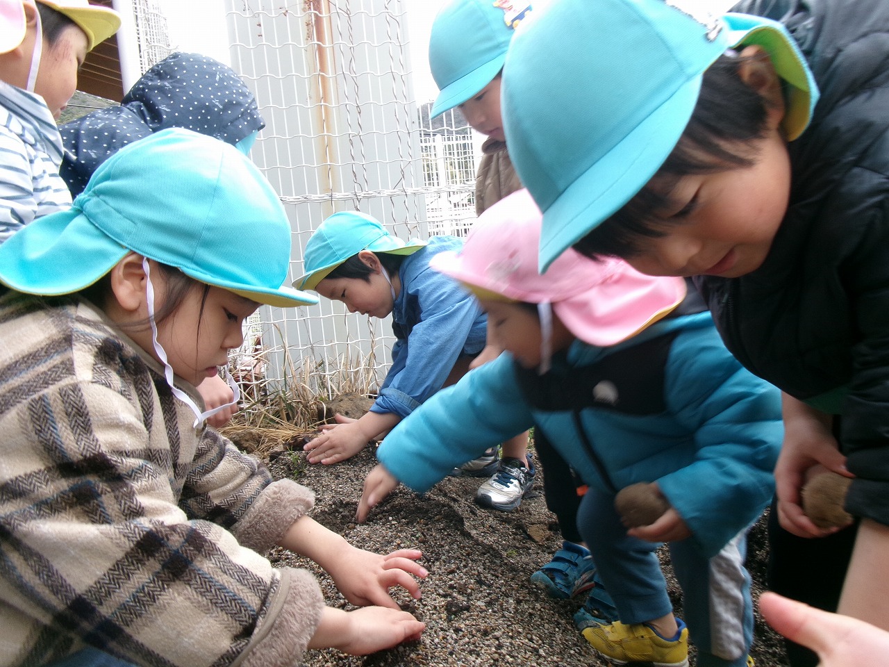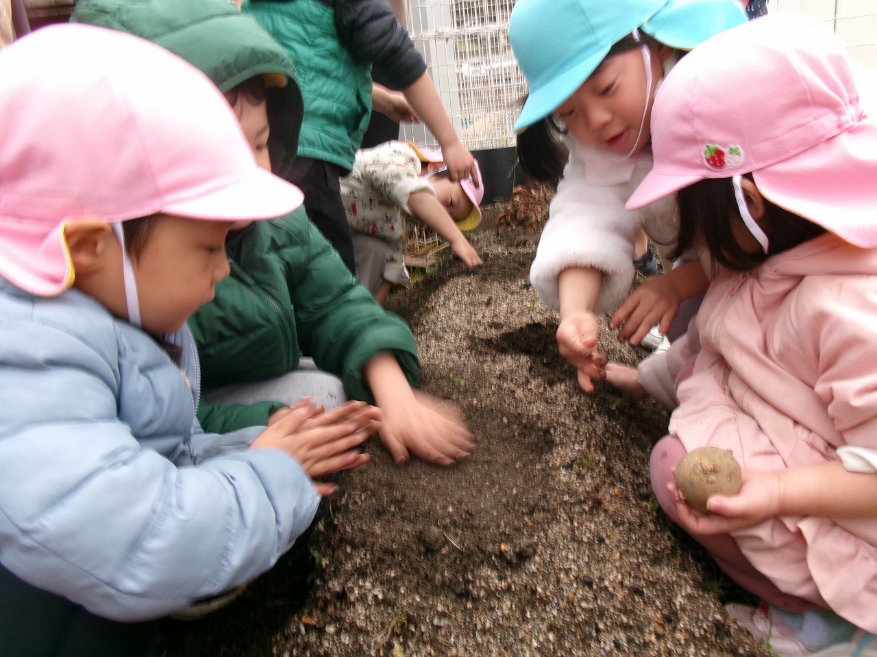 じゃが芋の苗を植えました。「芽がたくさん生えているところを上にして植えてね」と伝えるとペアのお友達と確認しあいながら上手に植えていましたよ。今年もたくさん収穫できますように!