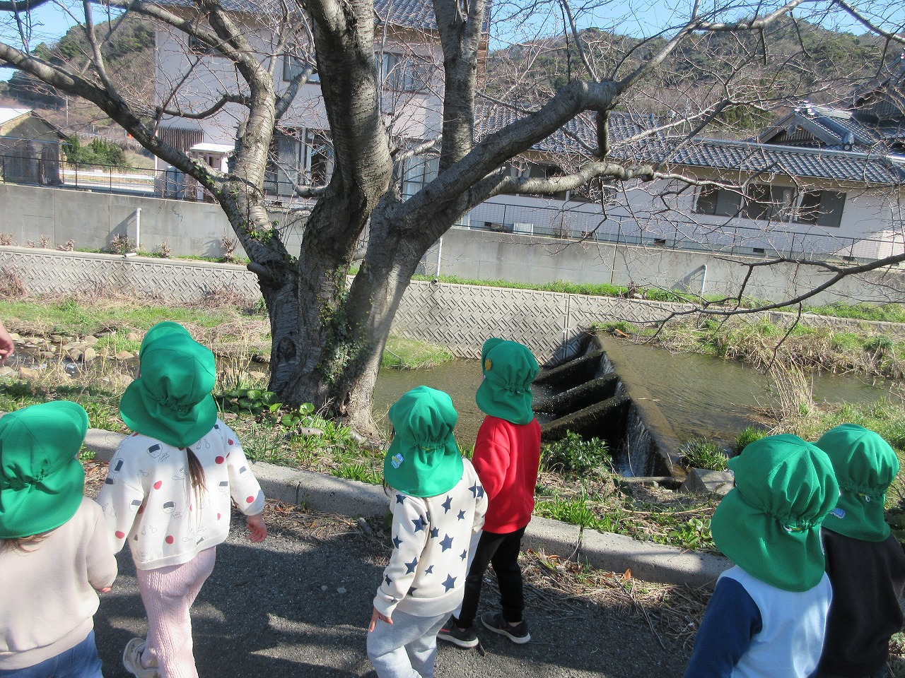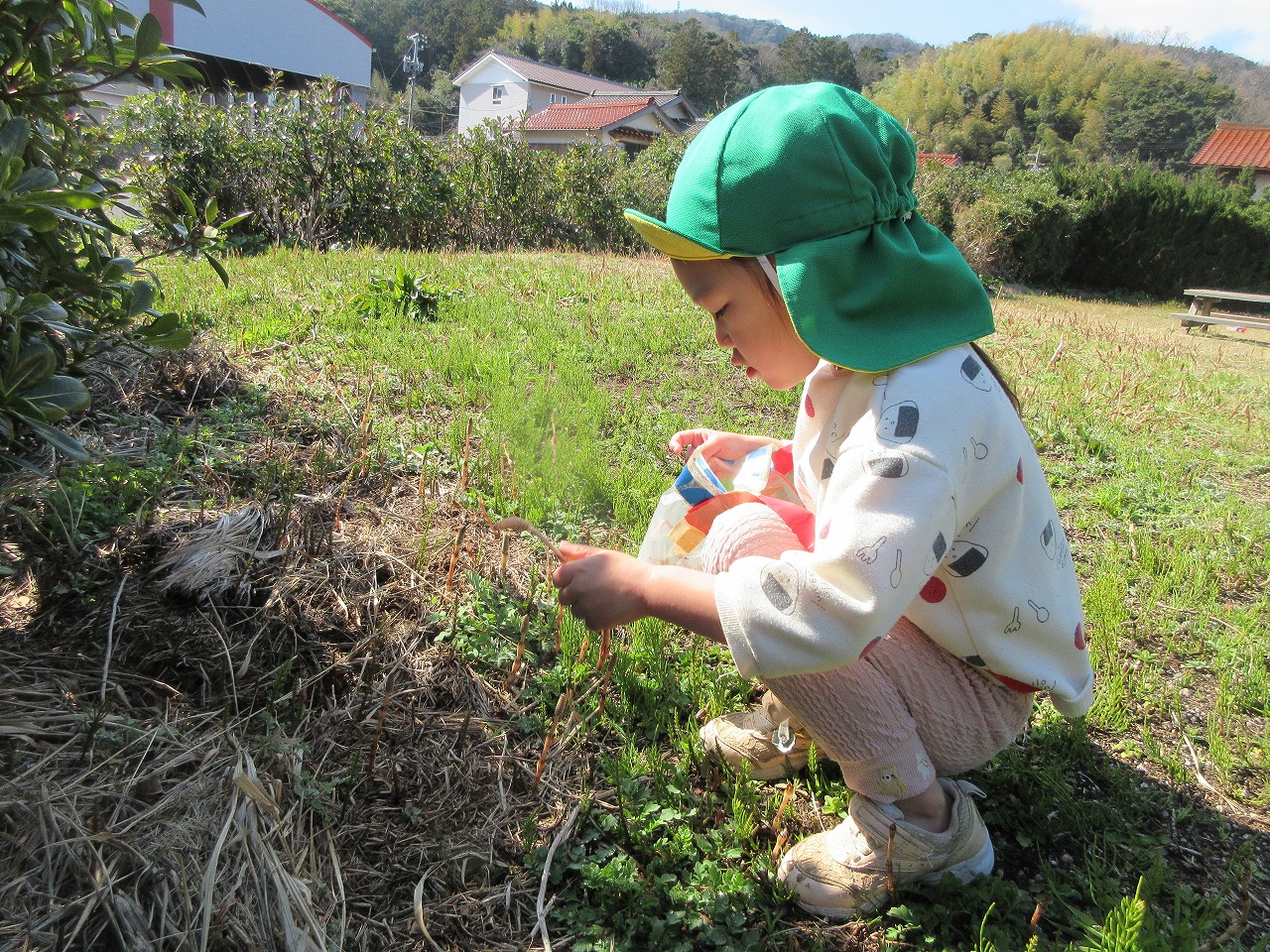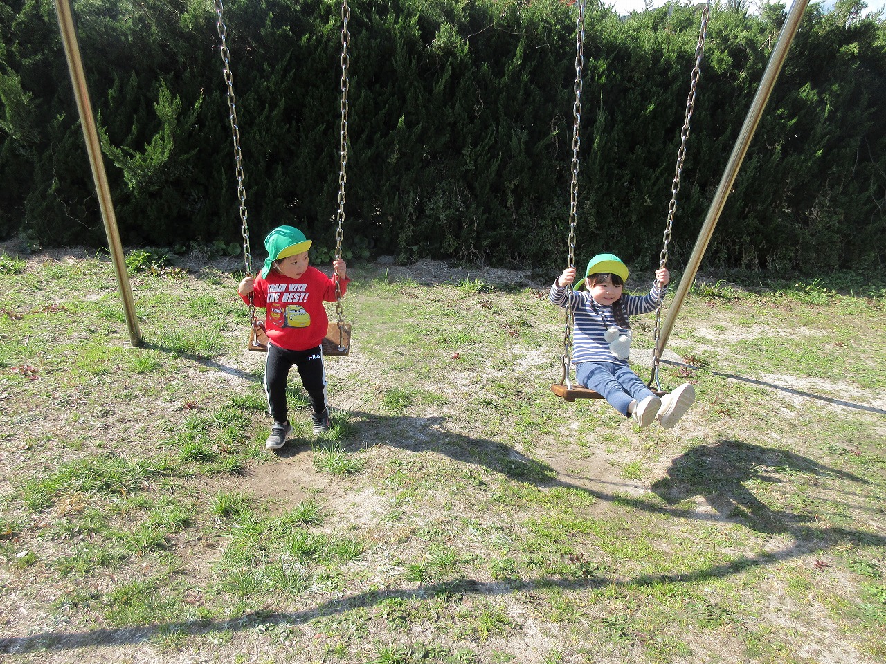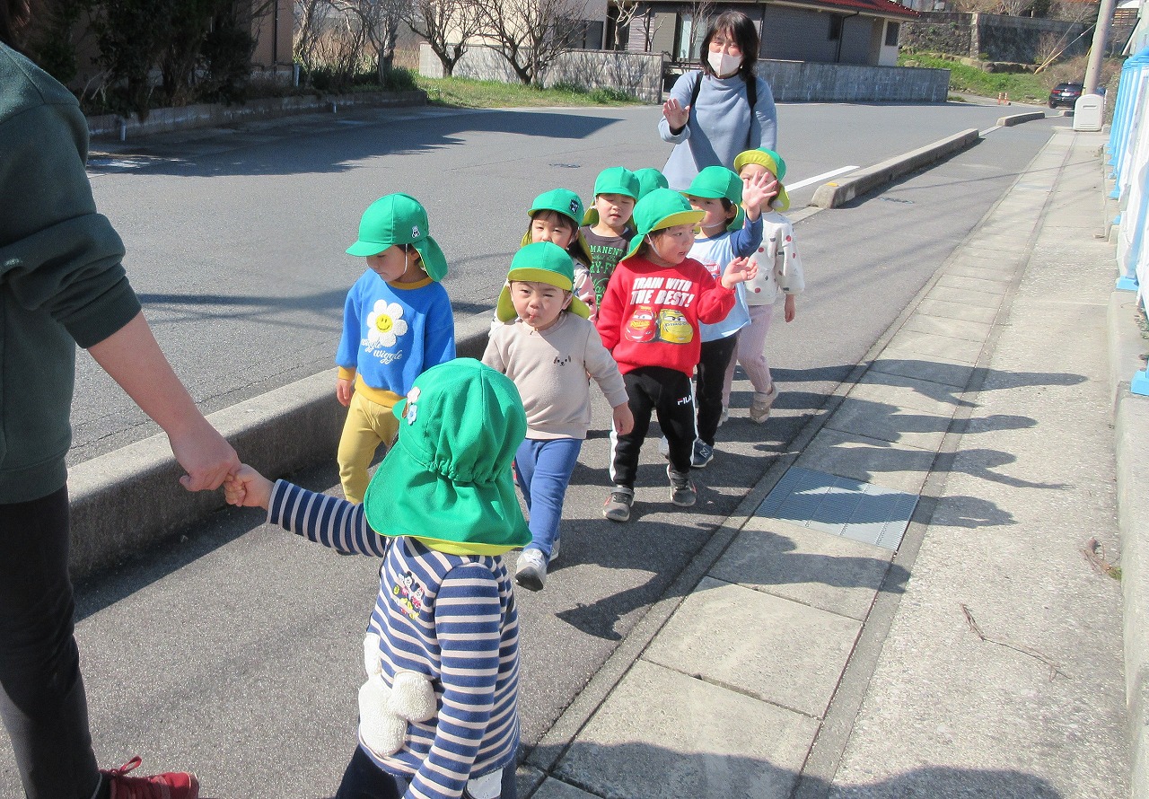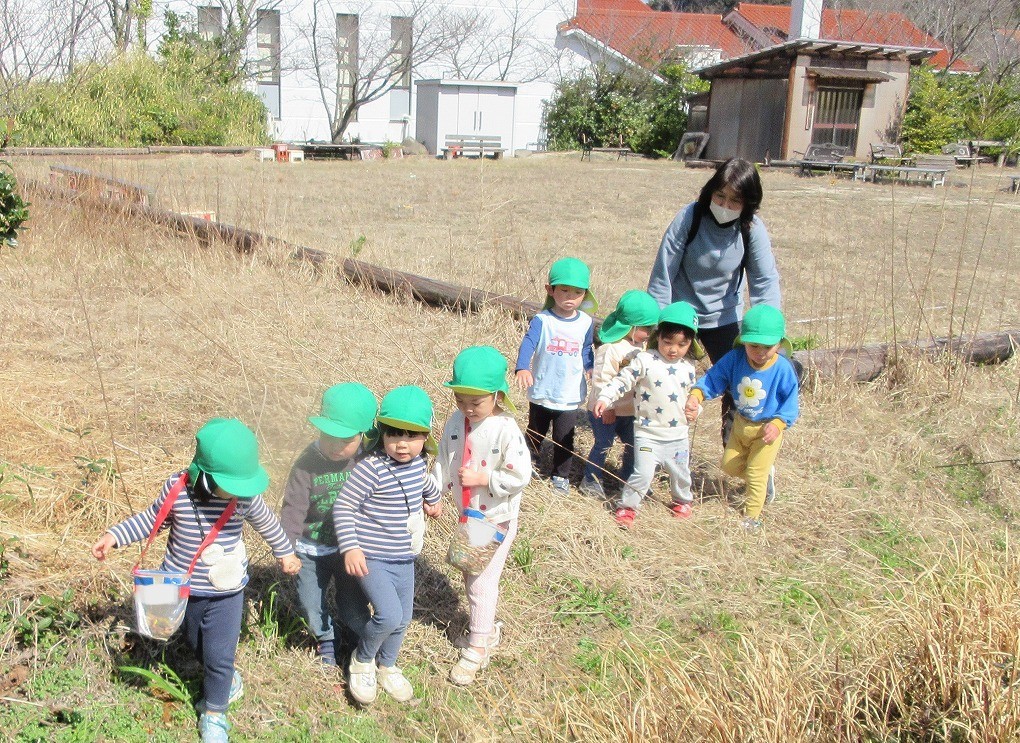 先週までの寒さが和らぎ、ぐっと春らしくなってきました。子ども達は朝登所するなり「今日散歩だが~」「晴れとるけんいけるね」と楽しみな様子で、元気いっぱい出発しました。道中にもマリンゲートの公園にもツクシ・タンポポ・ナズナ・オオイヌノフグリなど春の草花が沢山咲いていて見つけては嬉しそうに「みつけた!」と呟く子ども達でした。たくさん体を動かして遊んで帰ると「あーたのしかった」「お腹すいた~」「またいこうね」ととっても満足そうな様子でした。