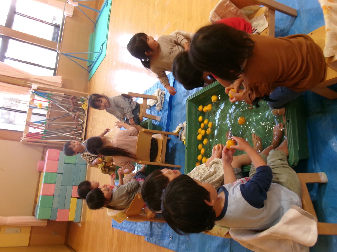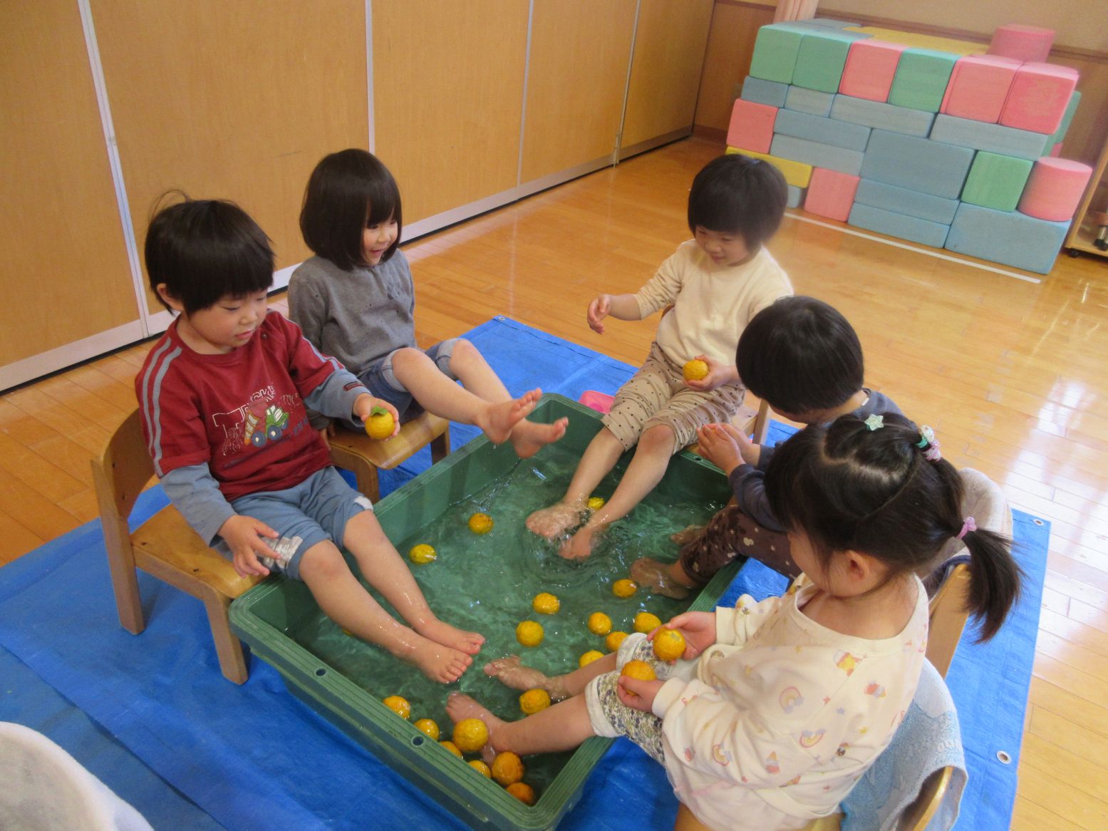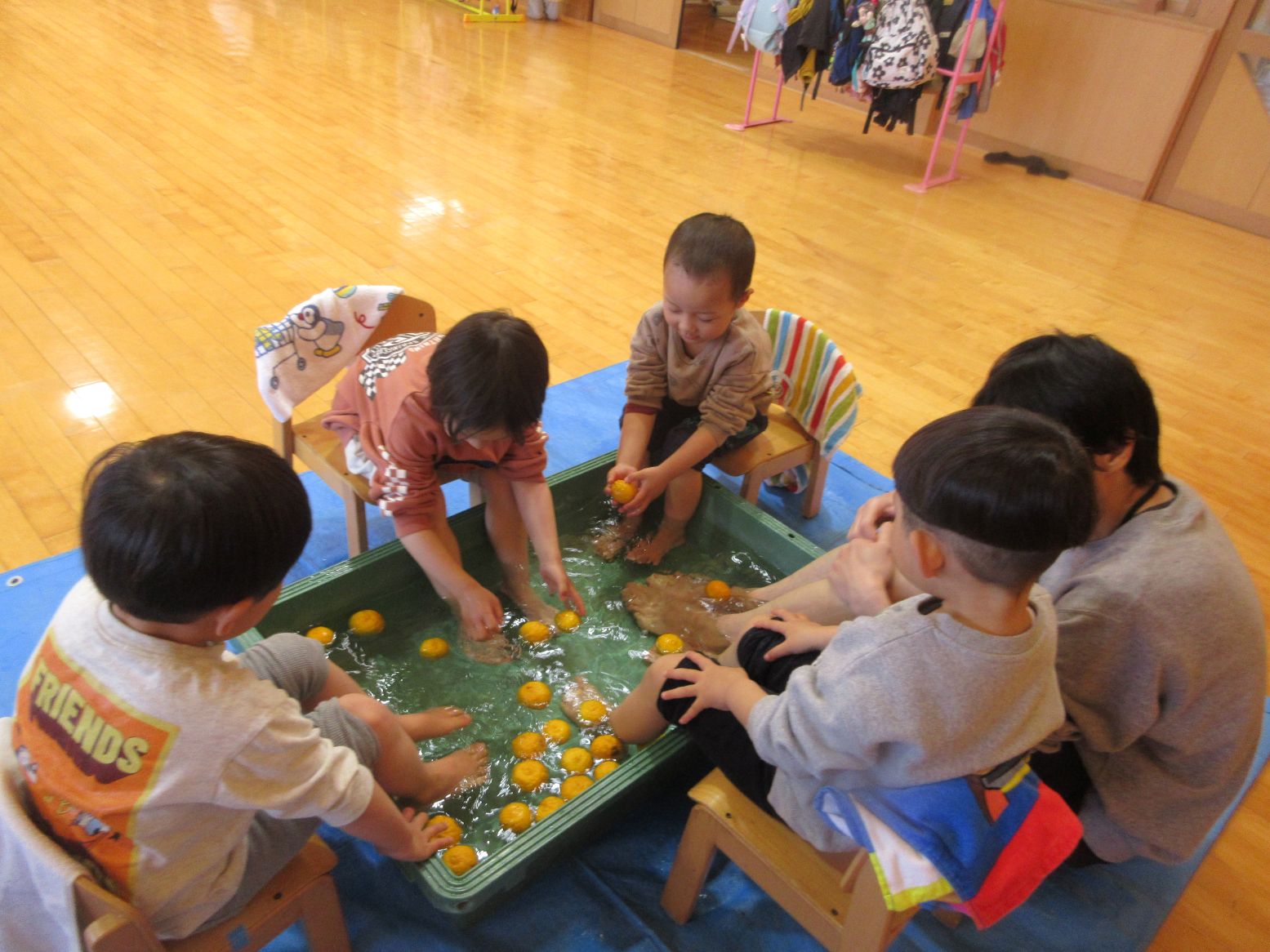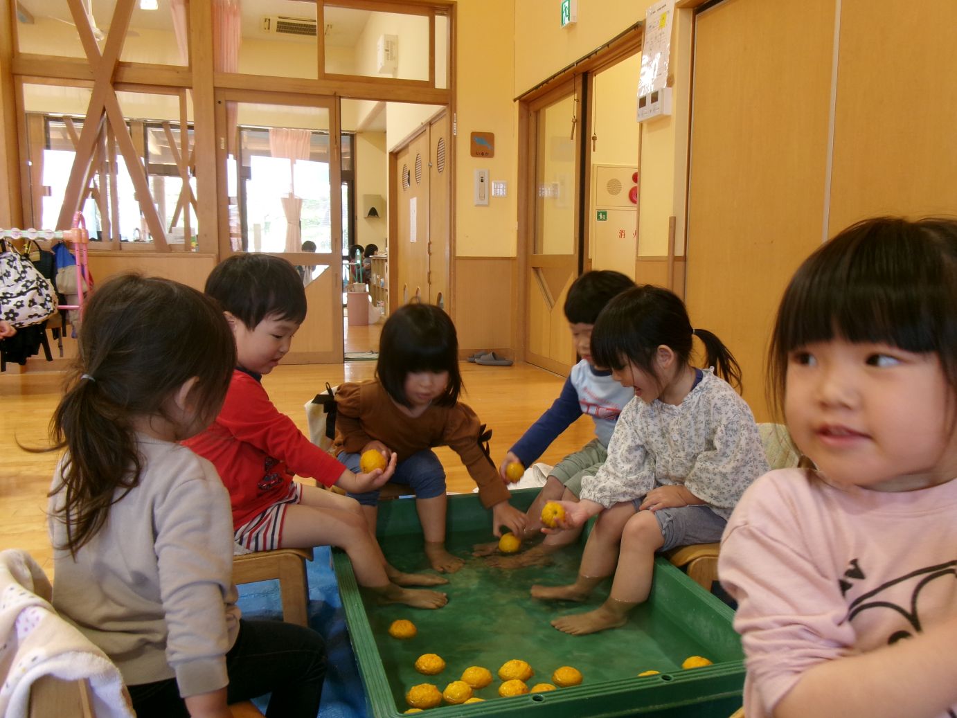 春の柚子湯は子ども達に大人気で、保育者が準備をしていると「なにしてるの~?」「はやく はいりた~い」と待ちきれない様子で、順番が来ると笑顔で足湯につかりました。