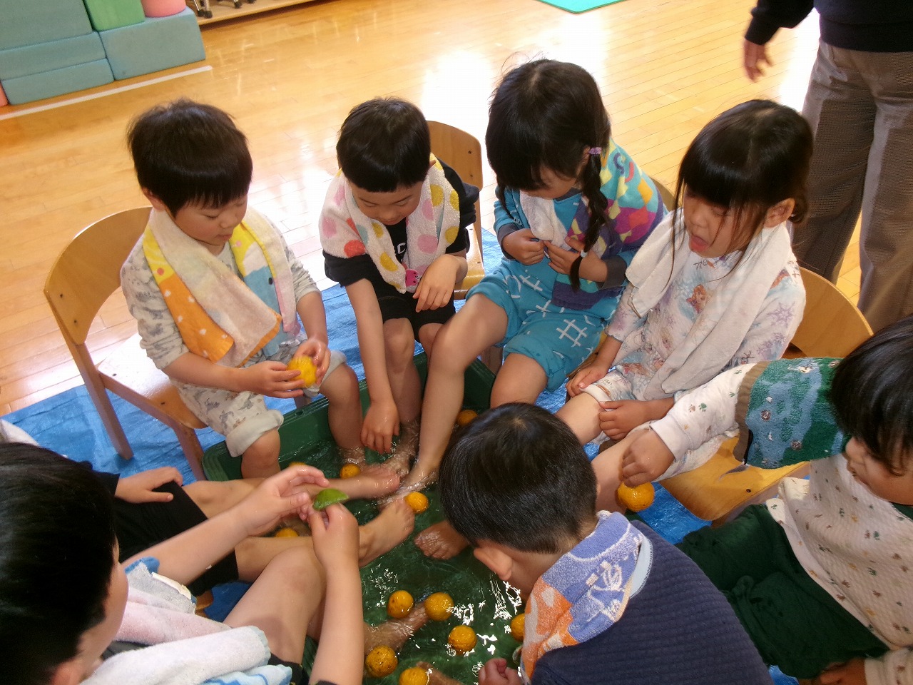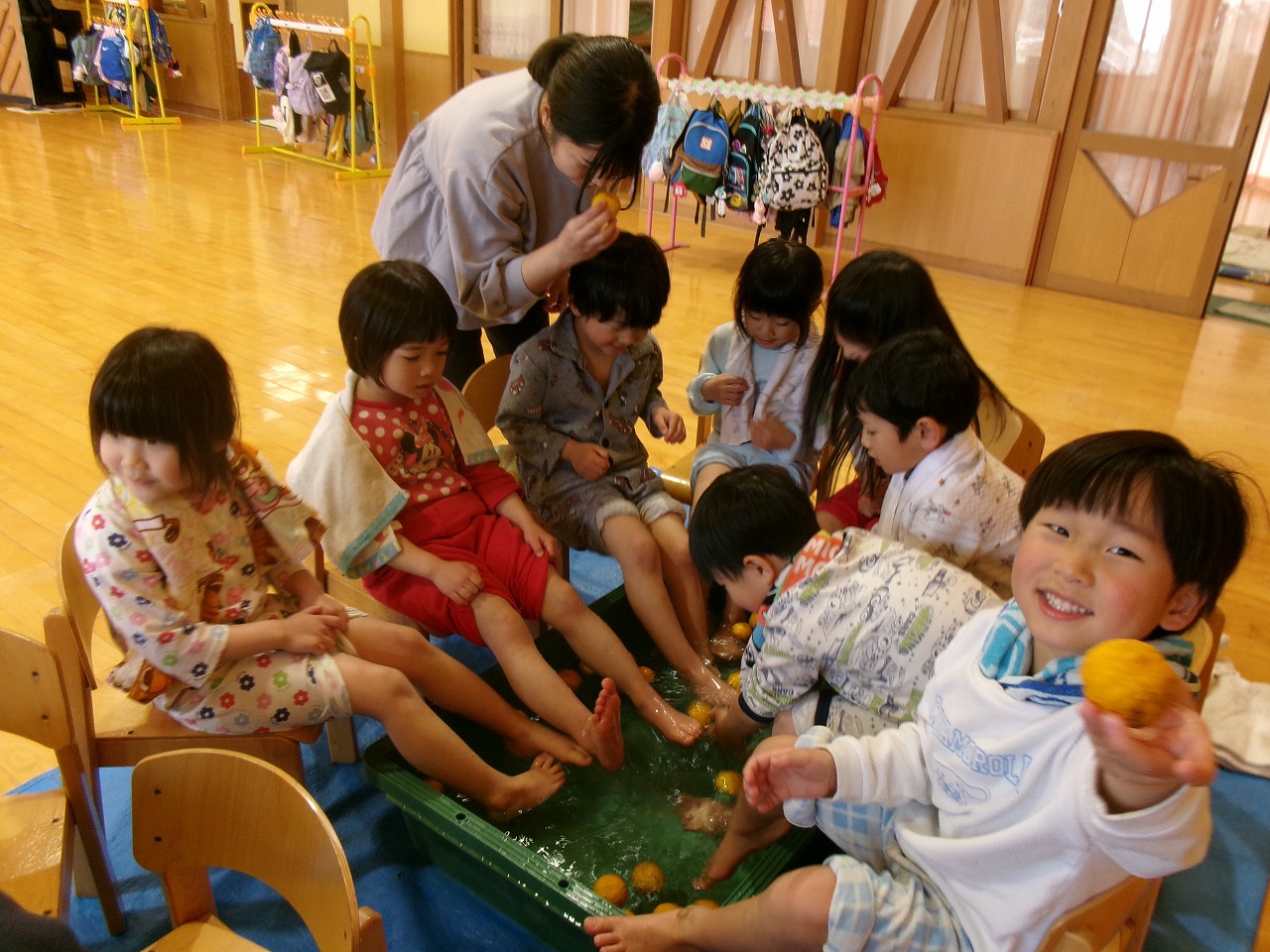 湯上りは、ほんのり赤く染まった足がとてもきもちよさそうでした。今年度も元気いっぱいに過ごせますように♪子ども達に柚子を持ってきてくださり、ありがとうございました。