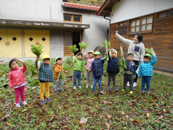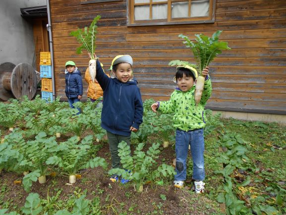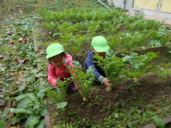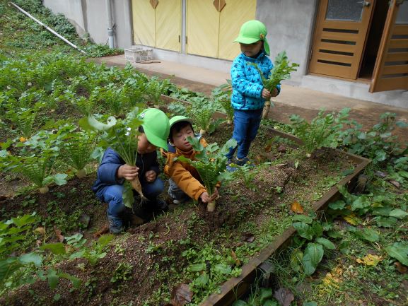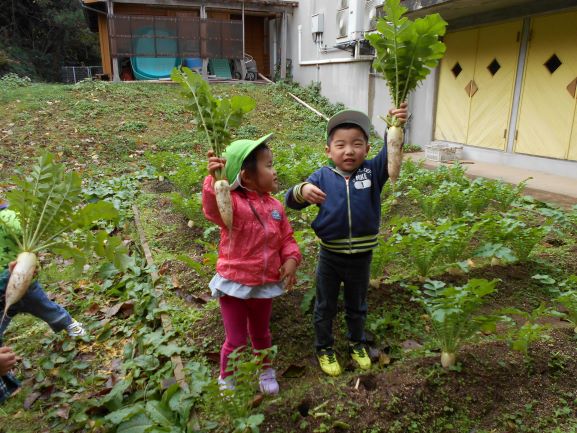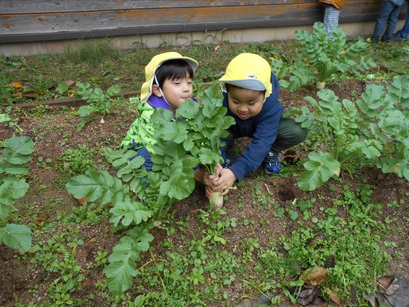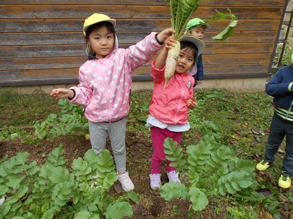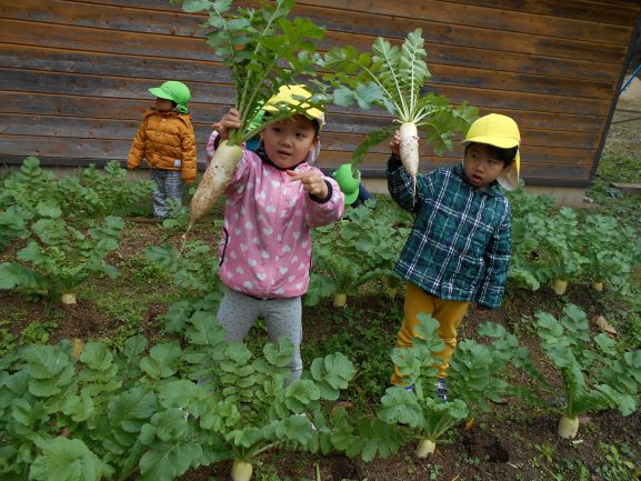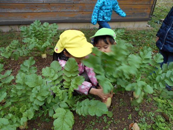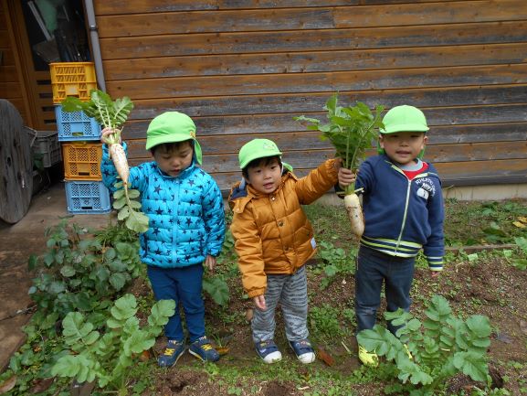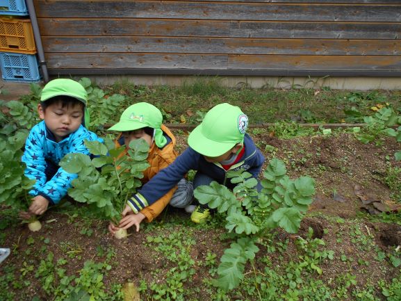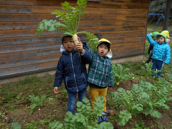 9月に植えていた大根が大きくなり、収穫しました。子ども達はいつも「だいこん、おおきくなったかな?」と生長を楽しみにしていたので、抜く事をとても楽しみにしていました。土の中の大根はどんなものか、ワクワクドキドキ、期待いっぱいの子ども達でした。大根の抜き方を知らせると、「うんとこしょ どっこいしょ!」とはりきっていた子ども達、スポンと大根が抜けるとしりもちをつく姿がなんとも言えず可愛らしかったです。「だいこんとれたー!」と抜けるたびに大喜びでした。たくさん収穫できて大満足だったようです。
