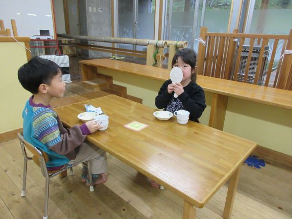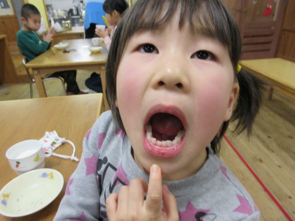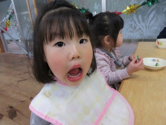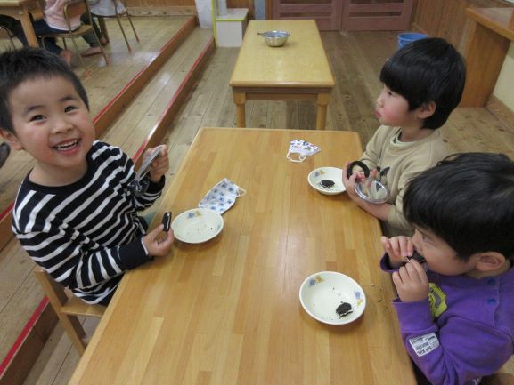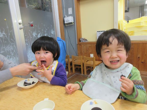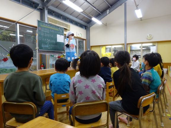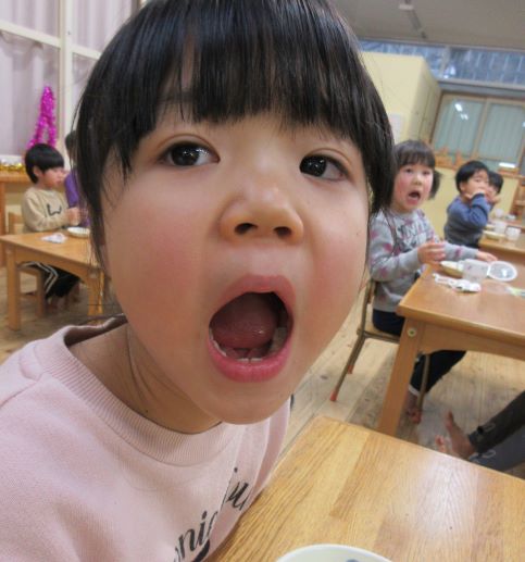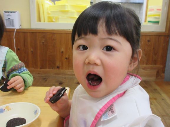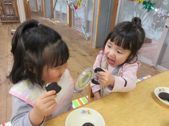 野波保育所では、毎月18日を「良い(1)歯(8)」とし、「よく噛む日」にしています。12月18日も、給食はよく噛むことを意識した献立でした。おやつの時間では、「オレオ集会」をしました。