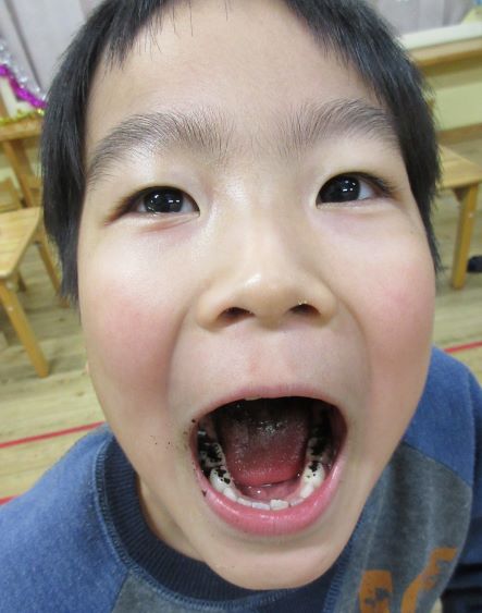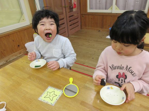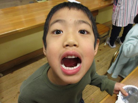 その後、実際にオレオを食べてみて、歯のくぼみにどれくらいのオレオが挟まっているのかを、鏡で見てみました。子ども達は、お互いに真っ黒になった歯を見ながら、笑っていました。